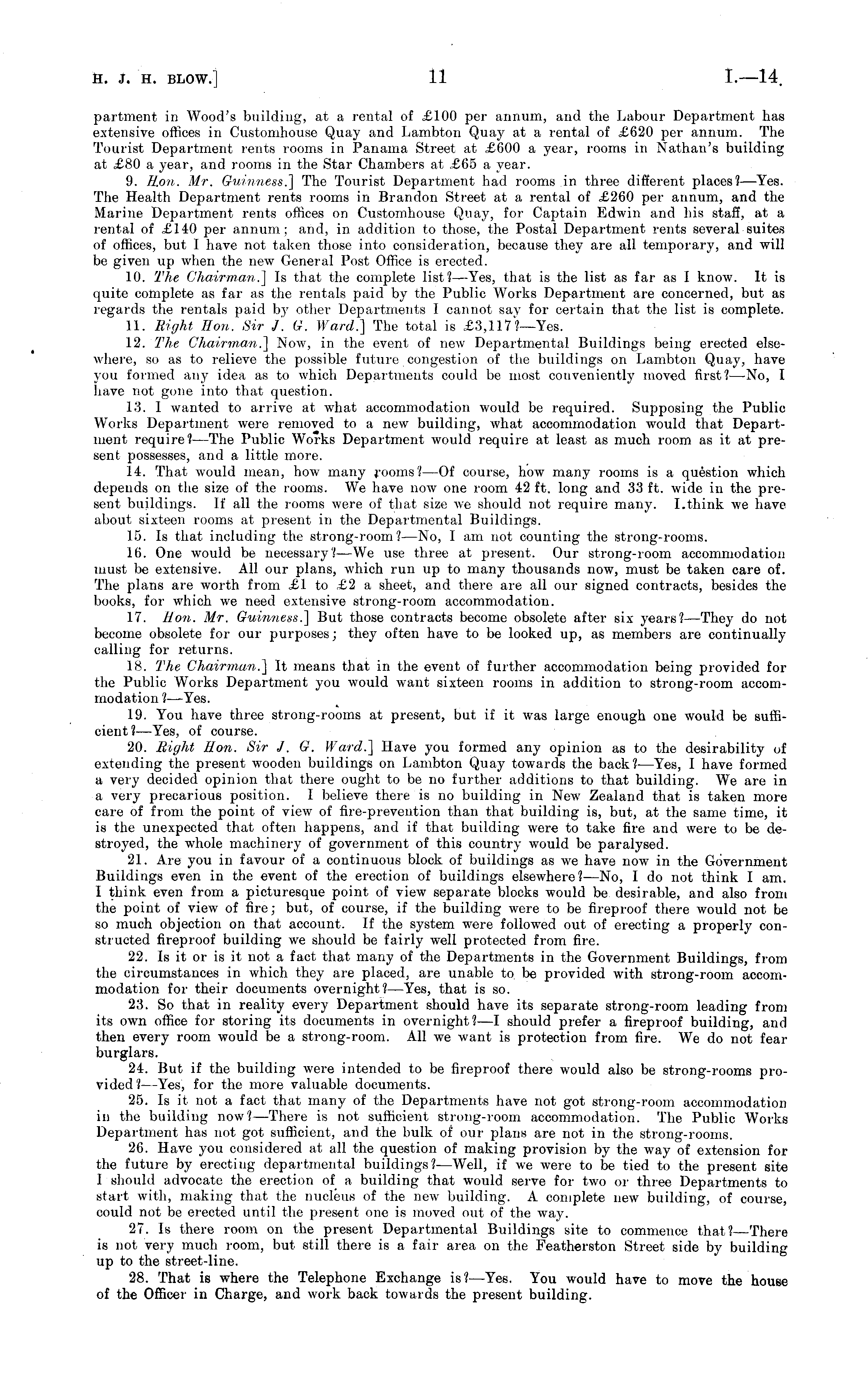 partment in Wood's building, at a rental of £100 per annum, and the Labour Department has extensive offices in Customhouse Quay and Lambton Quay at a rental of £620 per annum. The Tourist Department rents rooms in Panama Street at £600 a year, rooms in Nathan's building at £80 a year, and rooms in the Star Chambers at £65 a year. 9. 11.011. Mr. Guinness.] The Tourist Department had rooms in three different places?— Yes. The Health Department rents rooms in Brandon Street at a rental of £260 per annum, and the Marine Department rents offices on Customhouse Quay, for Captain Edwin and his staff, at a rental of £140 per annum; and, In addition to those, the Postal Department rents several suites of offices, but I have not taken those into consideration, because they are all temporary, and will be given up when the new General Post Office is erected. 10. The Chairman.] Is that the complete list? —Yes, that is the list as far as I know. It is quite complete as far as the rentals paid by the Public Works Department are concerned, but as regards the rentals paid by other Departments I cannot say for certain that the list is complete. 11. Right Hon. Sir J. G. Ward.] The total is £3,117? —Yes. 12. The Chairman.] Now, in the event of new Departmental Buildings being erected elsewhere, so as to relieve the possible future congestion of the buildings on Lambton Quay, have you formed any idea as to which Departments could be most conveniently moved first? —No, I have not gone into that question. L 3. I wanted to arrive at what accommodation would be required. Supposing the Public Works Department were removed to a new building, what accommodation would that Department require?— The Public Works Department would require at least as much room as it at present possesses, and a little more. 14. That would mean, how many rooms?—Of course, how many rooms is a question which depends on the size of the rooms. We have now one room 42 ft. long and 33 ft. wide in the present buildings. If all the rooms were of that size we should not require many. I.think we have about sixteen rooms at present in the Departmental Buildings. 15. Is that including the strong-room?—No, I am not counting the strong-rooms. 16. One would be necessary?—We use three at present. Our strong-room accommodation must be extensive. All our plans, which run up to many thousands now, must be taken care of. The plans are worth from £1 to £2 a sheet, and there are all our signed contracts, besides the books, for which we need extensive strong-room accommodation. 17. Hon. Mr. Guinness.] But those contracts become obsolete after six years?— They do not become obsolete for our purposes; they often have to be looked up, as members are continually calling for returns. 18. The Chairman.] It means that in the event of further accommodation being provided for the Public Works Department you would want sixteen rooms in addition to strong-room accommodation I —Yes. 19. You have three strong-rooms at present, but if it was large enough one would be sufficient? —Yes, of course. 20. Bight Hon. Sir J . G. Ward.] Have you formed any opinion as to the desirability of extending the present wooden buildings on Lambton Quay towards the back? —Yes, I have formed a very decided opinion that there ought to be no further additions to that building. We are in a very precarious position. I believe there is no building in New Zealand that is taken more care of from the point of view of fire-prevention than that building is, but, at the same time, it is the unexpected that often happens, and if that building were to take fire and were to be destroyed, the whole machinery of government of this country would be paralysed. 21. Are you in favour of a continuotis block of buildings as we have now in the Government Buildings even in the event of the erection of buildings elsewhere?—No, 1 do not think I am. I think even from a picturesque point of view separate blocks would be desirable, and also from the point of view of fire; but, of course, if the building were to be fireproof there would not be so much objection on that account. If the system were followed out of erecting a properly constructed fireproof building we should be fairly well protected from fire. 22. Is it or is it not a fact that many of the Departments in the Government Buildings, from the circumstances in which they are placed, are unable to, be provided with strong-room accommodation for their documents overnight?— Yes, that is so. 23. So that in reality every Department should have its separate strong-room leading from its own office for storing its documents in overnight? —I should prefer a fireproof building, and then every room would be a strong-room. All we want is protection from fire. We do not fear burglars. 24. But if the building were intended to be fireproof there would also be strong-rooms provided ? —Yes, for the more valuable documents. 25. Is it not a fact that many of the Departments have not got strong-room accommodation in the building now?— There is not sufficient strong-room accommodation. The Public Works Department has not got sufficient, and the bulk of our plans are not in the strong-rooms. 26. Have you considered at all the question of making provision by the way of extension for the future by erecting departmental buildings?— Well, if we were to be tied to the present site I should advocate the erection of a building that would serve for two or three Departments to start with, making that the nucleus of the new building. A complete new building, of course, could not be erected until the present one is moved out of the way. 27. Is there room on the present Departmental Buildings site to commence that?— There is not very much room, but still there is a fair area on the Featherston Street side by building up to the street-line. 28. That is where the Telephone Exchange is?— Yes. You would have to move the house of the Officer in Charge, a