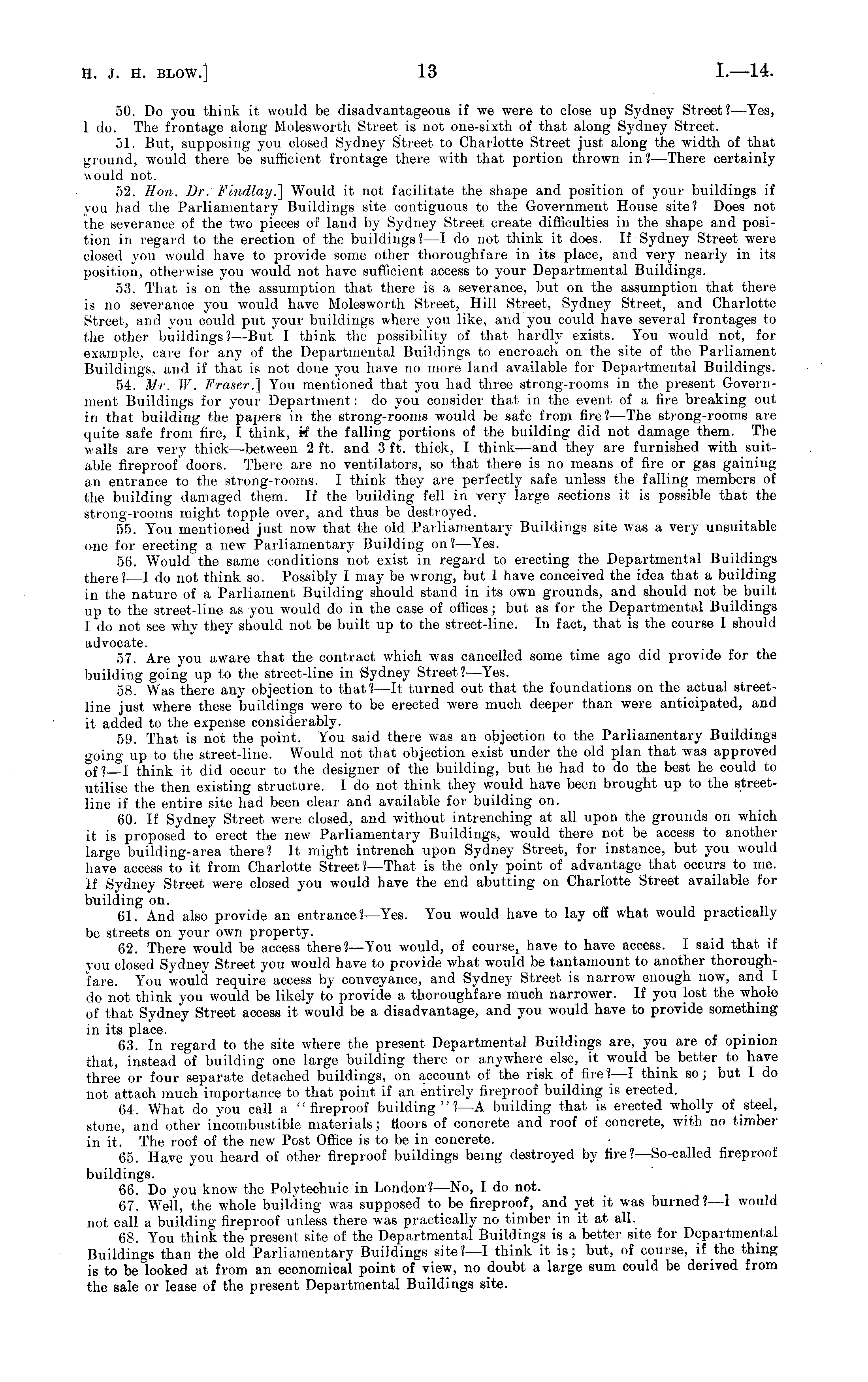 50. Do you think it would be disadvantageous if we were to close up Sydney Street?— Yes, 1 do. The frontage along Molesworth Street is not one-sixth of that along Sydney Street. 51. But, supposing you closed Sydney Street to Charlotte Street just along the width of that ground, would there be sufficient frontage there with that portion thrown in?— There certainly would not. 52. Hon. Dr. FindlayJ] Would it not facilitate the shape and position of your buildings if you had the Parliamentary Buildings site contiguous to the Government House site? Does not the severance of the two pieces of land by Sydney Street create difficulties in the shape and position in regard to the erection of the buildings?—l do not think it does. If Sydney Street were closed you would have to provide some other thoroughfare in its place, and very nearly in its position, otherwise you would not have sufficient access to your Departmental Buildings. 53. That is on the assumption that there is a severance, but on the assumption that there is no severance you would have Molesworth Street, Hill Street, Sydney Street, and Charlotte Street, and you could put your buildings where you like, and you could have several frontages to the other buildings?— But I think the possibility of that hardly exists. You would not, for example, care for any of the Departmental Buildings to encroach on the site of the Parliament Buildings, and if that is not done you have no more land available for Departmental Buildings. 54. Mr. W. Fraser.] You mentioned that you had three strong-rooms in the present Government Buildings for your Department: do you consider that in the event of a fire breaking out in that building the papers in the strong-rooms would be safe from fire? —The strong-rooms are quite safe from fire, I think, if the falling portions of the building did not damage them. The walls are very thick —between 2 ft. and 3 ft. thick, I think—and they are furnished with suitable fireproof doors. There are no ventilators, so that there is no means of fire or gas gaining an entrance to the strong-rooms. 1 think they are perfectly safe unless the falling members of the building damaged them. If the building fell in very large sections it is possible that the strong-rooms might topple over, and thus be destroyed. 55. You mentioned just now that the old Parliamentary Buildings site was a very unsuitable one for erecting a new Parliamentary Building on?— Yes. 56. Would the same conditions not exist in regard to erecting the Departmental Buildings there? —1 do not think so. Possibly I may be wrong, but I have conceived the idea that a building in the nature of a Parliament Building should stand in its own grounds, and should not be built up to the street-line as you would do in the case of offices; but as for the Departmental Buildings Ido not see why they should not be built up to the street-line. In fact, that is the course I should advocate. 57. Are you aware that the contract which was cancelled some time ago did provide for the building going up to the street-line in Sydney Street?— Yes. 58. Was there any objection to that? —It turned out that the foundations on the actual streetline just where these buildings were to be erected were much deeper than were anticipated, and it added to the expense considerably. 59. That is not the point. You said there was an objection to the Parliamentary Buildings going up to the street-line. Would not that objection exist under the old plan that was approved o f} I think it did occur to the designer of the building, but he had to do the best he could to utilise the then existing structure. I do not think they would have been brought up to the streetline if the entire site had been clear and available for building on. 60. If Sydney Street were closed, and without intrenching at all upon the grounds on which it is proposed to erect the new Parliamentary Buildings, would there not be access to another large building-area there? It might intrench upon Sydney Street, for instance, but you would have access to it from Charlotte Street? —That is the only point of advantage that occurs to me. If Sydney Street were closed you would have the end abutting on Charlotte Street available for building on. 61. And also provide an entrance? —Yes. You would have to lay off what would practically be streets on your own property. 62. There would be access there? —You would, of have to have access. I said that if you closed Sydney Street you would have to provide what would be tantamount to another thoroughfare. You would require access by conveyance, and Sydney Street is narrow enough now, and I do not think you would be likely to provide a thoroughfare much narrower. If you lost the whole of that Sydney Street access it would be a disadvantage, and you would have to provide something in its place. 63. In regard to the site where the present Departmental Buildings are, you are of opinion that, instead of building one large building there or anywhere else, it would be better to have three or four separate detached buildings, on account of the risk of fire?—l think so; but Ido not attach much importance to that point if an entirely fireproof building is erected. 64. What do you call a "fireproof building "?—A building that is erected wholly of steel, stone, and other incombustible materials; floors of concrete and roof of concrete, with no timber in it. The roof of the new Post Office is to be in concrete. 65. Have you heard of other fireproof buildings being destroyed by fire I— So-called fireproof buildings. 66. Do you know the Polytechnic in London? —No, I do not. 67. Well, the whole building was supposed to be fireproof, and yet it was burned? —1 would not call a building fireproof unless there was practically no timber in it at all. 68. You think the present site of the Departmental Buildings is a better site for Departmental Buildings than the old Parliamentary Buildings site?—l t