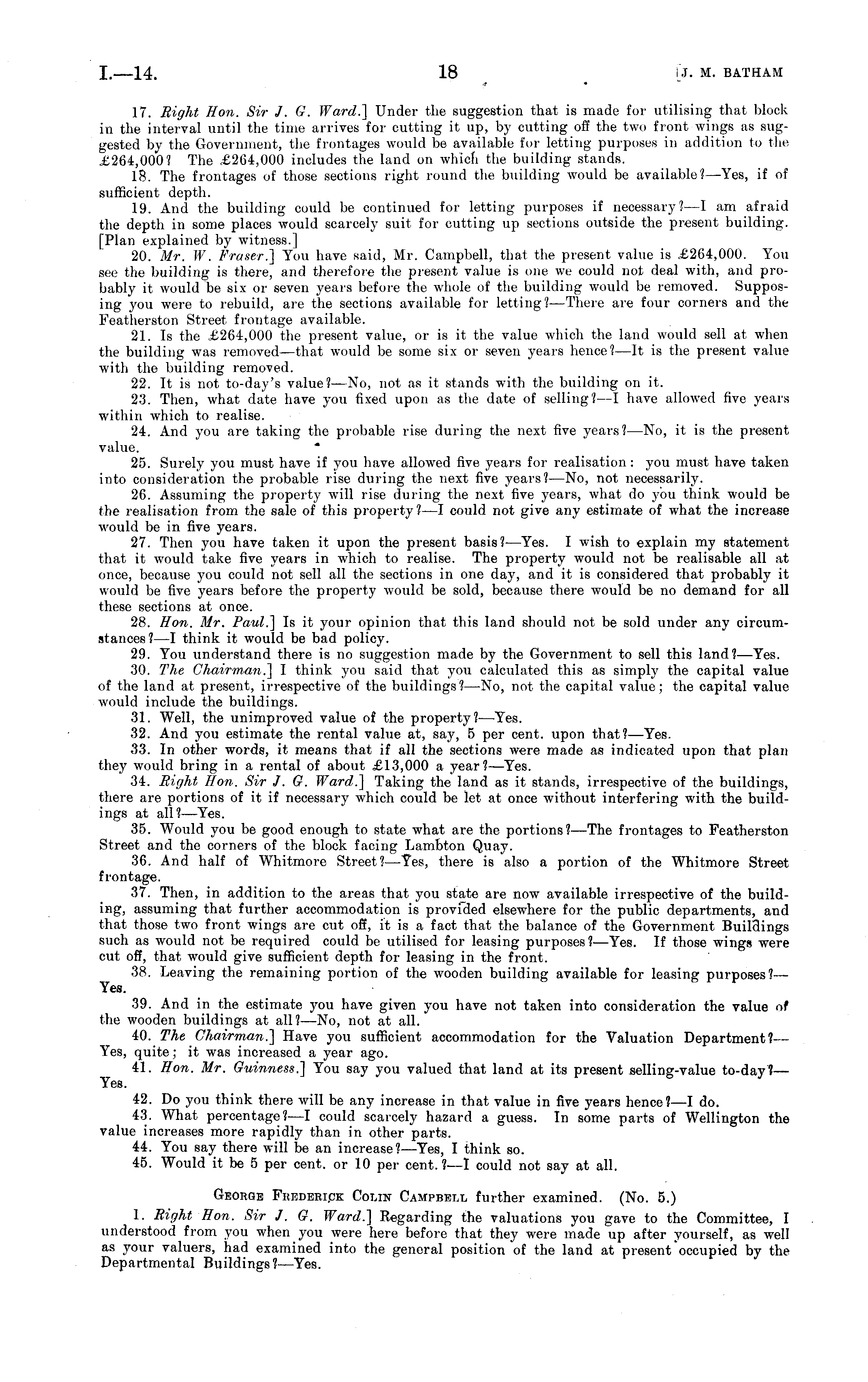 17. Right Hon. Sir J. G. Ward.] Under the suggestion that is made for utilising that block in the interval until the time arrives for cutting it up, by cutting off the two front wings as suggested by the Government, the frontages would be available for letting purposes in addition to the £264,000? The .£264,000 includes the land on which the building stands. 18. The frontages of those sections right round the building would be available?— Yes, if of sufficient depth. 19. And the building could be continued for letting purposes if necessary?—l am afraid the depth in some places would scarcely suit for cutting up sections outside the present building. [Plan explained by witness.] 20. Mr. W. Fraser.] You have said, Mr. Campbell, that the present value is .£264,000. You see the building is there, and therefore the present value is one we could not deal with, and probably it would be six or seven years before the whole of the building would be removed. Supposing you were to rebuild, are the sections available for letting?— There are four corners and the Featherston Street frontage available. 21. Is the £264,000 the present value, or is it the value which the land would sell at when the building was removed —that would be some six or seven years hence? —It is the present value with the building removed. 22. It is not to-day's value?—No, not as it stands with the building on it. 23. Then, what date have you fixed upon as the date of selling?—l have allowed five years within which to realise. 24. And you are taking the probable rise during the next five years? —No, it is the present value. " 25. Surely you must have if you have allowed five years for realisation : you must have taken into consideration the probable rise during the next five years?—No, not necessarily. 26. Assuming the property will rise during the next five years, what do you think would be the realisation from the sale of this property?—l could not give any estimate of what the increase would be in five years. 27. Then you have taken it upon the present basis? —Yes. I wish to explain my statement that it would take five years in which to realise. The property would not be realisable all at once, because you could not sell all the sections in one day, and it is considered that probably it would be five years before the property would be sold, because there would be no demand for all these sections at once. 28. Hon. Mr. Paul.] Is it your opinion that this land should not be sold under any circumstances?—l think it would be bad policy. 29. You understand there is no suggestion made by the Government to sell this land?— Yes. 30. The Chairman.] I think you said that you calculated this as simply the capital value of the land at present, irrespective of the buildings? —No, not the capital value; the capital value would include the buildings. 31. Well, the unimproved value of the property?— Yes. 32. And you estimate the rental value at, say, 5 per cent, upon that?— Yes. 33. In other words, it means that if all the sections were made as indicated upon that plan they would bring in a rental of about £13,000 a year?— Yes. 34. Eight Hon. Sir J. G. Ward.] Taking the land as it stands, irrespective of the buildings, there are portions of it if necessary which could be let at once without interfering with the buildings at all?— Yes. 35. Would you be good enough to state what are the portions?— The frontages to Featherston Street and the corners of the block facing Lambton Quay. 36. And half of Whitmore Street?— Yes, there is also a portion of the Whitmore Street frontage. 37. Then, in addition to the areas that you state are now available irrespective of the building, assuming that further accommodation is provided elsewhere for the public departments, and that those two front wings are cut off, it is a fact that the balance of the Government Buildings such as would not be required could be utilised for leasing purposes ? —Yes. If those wings were cut off, that would give sufficient depth for leasing in the front. 38. Leaving the remaining portion of the wooden building available for leasing purposes?— Yes. 39. And in the estimate you have given you have not taken into consideration the value of the wooden buildings at all? —No, not at all. 40. The Chairman.] Have you sufficient accommodation for the Valuation Department?— Yes, quite; it was increased a year ago. 41. Hon. Mr. Guinness.] You say you valued that land at its present selling-value to-day?— Yes. 42. Do you think there will be any increase in that value in five years hence? —I do. 43. What percentage?—l could scarcely hazard a guess. In some parts of Wellington the value increases more rapidly than in other parts. 44. You say there will be an increase?— Yes, I think so. 45. Would it be 5 per cent, or 10 per cent.?—l could not say at all. George Fhederick Colin Campbell further examined. (No. 5.) 1. Right Hon. Sir J. G. Ward.] Regarding the valuations you gave to the Committee, I understood from you when you were here before that they were made up after yourself, as well as your valuers, had examined into the general position of the land at present occupied by the Departmental Buildings?— Yes.