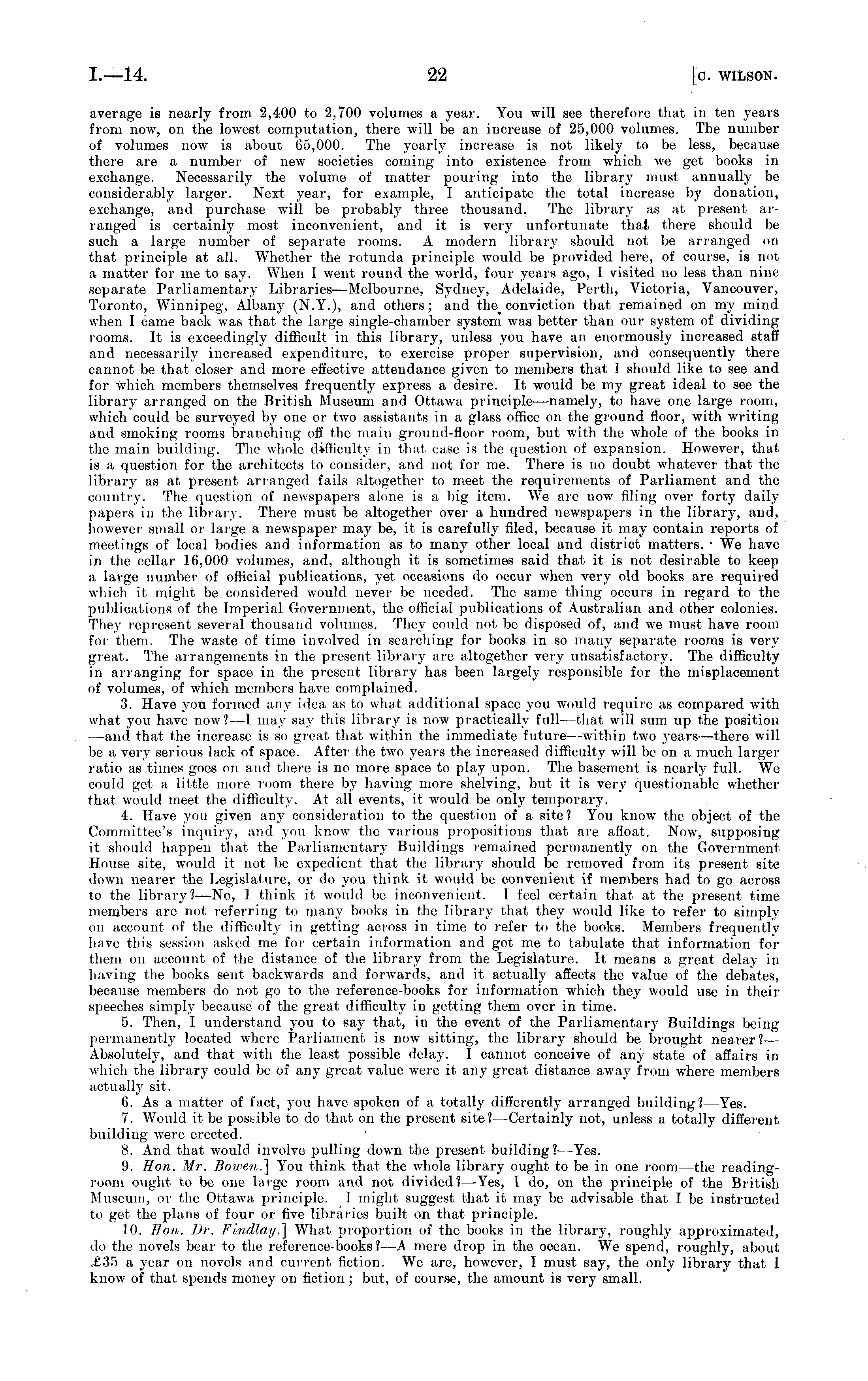 average is nearly from 2,400 to 2,700 volumes a year. You will see therefore that in ten years from now, on the lowest computation, there will be an increase of 25,000 volumes. The number of volumes now is about 65,000. The yearly increase is not likely to be less, beoauge there are a number of new societies coming into existence from which we get books in exchange. Necessarily the volume of matter pouring into the library must annually be considerably larger. Next year, for example, I anticipate the total increase by donation, exchange, and purchase will be probably three thousand. The library as at present arranged is certainly most inconvenient, and it is very unfortunate that there should be such a large number of separate rooms. A modern library should not be arranged on that principle at all. Whether the rotunda principle would be provided here, of course, is not a matter for me to say. When 1 went round the world, four years ago, I visited no less than nine separate Parliamentary Libraries—Melbourne, Sydney, Adelaide, Perth, Victoria, Vancouver, Toronto, Winnipeg, Albany (N.Y.), and others; and the conviction that remained on my mind when I came back was that the large single-chamber system was better than our system of dividing rooms. It is exceedingly difficult in this library, unless you have an enormously increased staff and necessarily increased expenditure, to exercise proper supervision, and consequently there cannot be that closer and more effective attendance given to members that I should like to see and for ivhich members themselves frequently express a desire. It would be my great ideal to see the library arranged on the British Museum and Ottawa principle—namely, to have one large room, which could be surveyed by one or two assistants in a glass office on the ground floor, with writing and smoking rooms branching off the main ground-floor room, but with the whole of the books in the main building. The whole difficulty in that case is the question of expansion. However, that is a question for the architects to consider, and not for me. There is no doubt whatever that the library as at present arranged fails altogether to meet the requirements of Parliament and the country. The question of newspapers alone is a big item. We are now filing over forty daily papers in the library. There must be altogether over a hundred newspapers in the library, and, however small or large a newspaper may be, it is carefully filed, because it may contain reports of meetings of local bodies and information as to many other local and district matters. ■ We have in the cellar 16,000 volumes, and, although it is sometimes said that it is not desirable to keep a large number of official publications, yet occasions do occur when very old books are required which it might be considered would never be needed. The same thing occurs in regard to the publications of the Imperial Government, the official publications of Australian and other colonies. They represent several thousand volumes. They could not be disposed of, and we must have room for them. The waste of time involved in searching for books in so many separate rooms is very great. The arrangements in the present library are altogether very unsatisfactory. The difficulty in arranging for space in the present library has been largely responsible for the misplacement of volumes, of which members have complained. 3. Have you formed any idea as to what additional space you would require as compared with what you have now?—l may say this library is now practically full —that will sum up the position —and that the increase is so great that within the immediate future—within two years —there will be a very serious lack of space. After the two years the increased difficulty will be on a much larger ratio as times goes on and there is no more space to play upon. The basement is nearly full. We could get a little more room there by having more shelving, but it is very questionable whether that would meet the difficulty. At all events, it would be only temporary. 4. Have you given any consideration to the question of a site? You know the object of the Committee's inquiry, and you know the various propositions that are afloat. Now, supposing it should happen that the Parliamentary Buildings remained permanently on the Government 1 louse site, would it not be expedient that the library should be removed from its present site down nearer the Legislature, or do j'ou think it would be convenient if members had to go across to the library?—No, I think it would be inconvenient. I feel certain that at the present time members are not referring to many books in the library that they would like to refer to simply on account of the difficulty in getting across in time to refer to the books. Members frequently have this session asked me for certain information and got me to tabulate that information for them on account of the distance of the library from the Legislature. It means a great delay in having the books sent backwards and forwards, and it actually affects the value of the debates, because members do not go to the reference-books for information which they would use in their speeches simply because of the great difficulty in getting them over in time. 5. Then, I understand you to say that, in the event of the Parliamentary Buildings being permanently located where Parliament is now sitting, the library should be brought nearer?— Absolutely, and that with the least possible delay. I cannot conceive of any state of affairs in which the library could be of any great value were it any great distance away from where member's actually sit. 6. As a matter of fact, you have spoken of a totally differently arranged building?— Yes. 7. Would it be possible to do that on the present site?— Certainly not, unless a totally different building were erected. 8. And that would involve pulling down the present building?— Yes. 9. Hon. Mr. Bowen.] Y