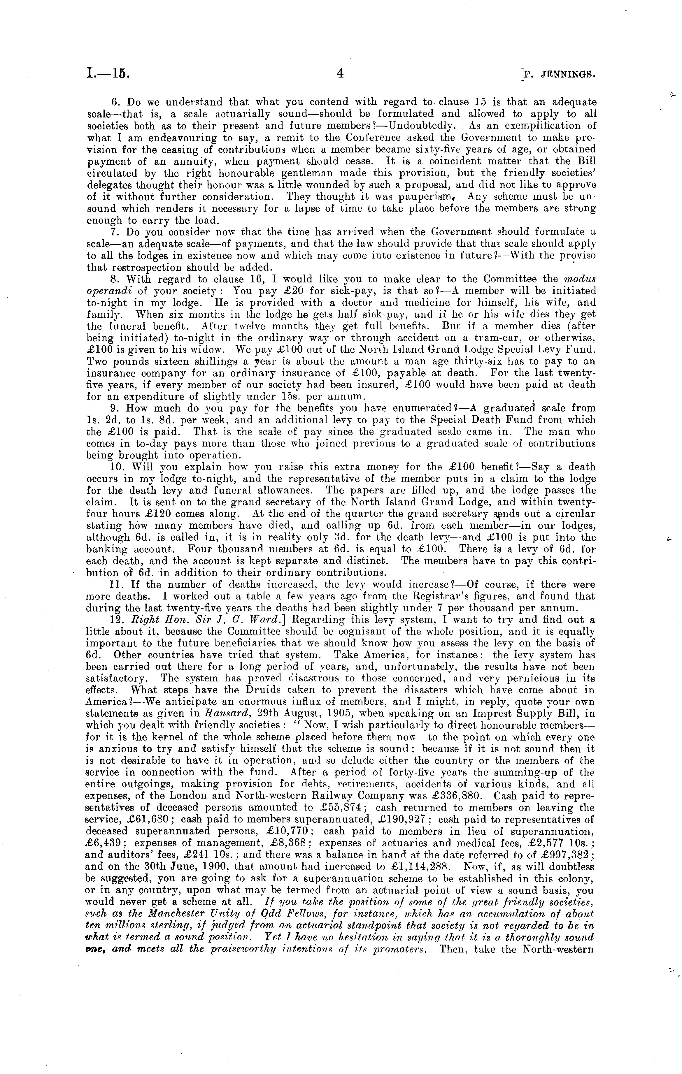 6. Do we understand that what you contend with regard to clause 15 is that an adequate seale —that is, a scale actuarially sound —should be formulated and allowed to apply to all societies both as to their present and future members'!— Undoubtedly. As an exemplification of what I am endeavouring to say, a remit to the Conference asked the Government to make provision for the ceasing of contributions when a member became sixty-five years of age, or obtained payment of an annuity, when payment should cease. It is a coincident matter that the Bill circulated by the right honourable gentleman made this provision, but the friendly societies' delegates thought their honour was a little wounded by such a proposal, and did not like to approve of it without further consideration. They thought it was Any scheme must be unsound which renders it necessary for a lapse of time to take place before the members are strong enough to carry the load. 7. Do you consider now that the time has arrived when the Government should formulate a scale—an adequate scale—of payments, and that the law should provide that that scale should apply to all the lodges in existence now and which may come into existence in future? —With the proviso that restrospection should be added. 8. With regard to clause 16, I would like you to make clear to the Committee the modus operandi of your society : You pay £20 for sick-pay, is that so?—A member will be initiated to-night in my lodge. He is provided with a doctor and medicine for himself, his wife, and family. When six months in the lodge he gets half sick-pay, and if he or his wife dies they get the funeral benefit. After twelve months they get full benefits. But if a member dies (after being initiated) to-night in the ordinary way or through accident on a tram-car, or otherwise, £100 is given to his widow. We pay £100 out of the North Island Grand Lodge Special Levy Fund. Two pounds sixteen shillings a year is about the amount a man age thirty-six has to pay to an insurance company for an ordinary insurance of £100, payable at death. For the last twentyfive years, if every member of our society had been insured, £100 would have been paid at death for an expenditure of slightly under 15s. per annum. 9. How much do you pay for the benefits you have enumerated? —A graduated scale from Is. 2d. to Is. Bd. per week, and an additional levy to pay to the Special Death Fund from which the £100 is paid. That is the scale of pay since the graduated scale came in. The man who comes in to-day pays more than those who joined previous to a graduated scale of contributions being brought into operation. 10. Will you explain how you raise this extra money for the £100 benefit?— Say a death occurs in my lodge to-night, and the representative of the member puts in a claim to the lodge for the death levy and funeral allowances. The papers are filled up, and the lodge passes the claim. It is sent on to the grand secretary of the North Island Grand Lodge, and within twentyfour hours £120 comes along. At the end of the quarter the grand secretary sends out a circular stating how many members have died, and calling up 6d. from each member—in our lodges, although 6d. is called in, it is in reality only 3d. for the death levy —and £100 is put into the banking account. Four thousand members at 6d. is equal to £100. There is a levy of 6d. for each death, and the account is kept separate and distinct. The members have to pay this contribution of 6d. in addition to their ordinary contributions. 11. If the number of deaths increased, the levy would increase?—Of course, if there were more deaths. I worked out a table a few rears ago from the Registrar's figures, and found that during the last twenty-five years the deaths had been slightly under 7 per thousand per annum. 12. Eight Hon. Sir J . G. Ward.] Regarding this levy system, I want to try and find out a little about it, because the Committee should be cognisant of the whole position, and it is equally important to the future beneficiaries that we should know how you assess the levy on the basis of 6d. Other countries have tried that system. Take America, for instance: the levy system has been carried out there for a long period of years, and, unfortunately, the results have not been satisfactory. The system has proved disastrous to those concerned, and very pernicious in its effects. What steps have the Druids taken to prevent the disasters which have come about in America?—-We anticipate an enormous influx of members, and I might, in reply, quote your own statements as given in Hansard, 29th August, 1905, when speaking on an Imprest Supply Bill, in which you dealt with friendly societies : " Now, I wish particularly to direct honourable members — for it is the kernel of the whole scheme placed before them now —to the point on which every one is anxious to try and satisfy himself that the scheme is sound ; because if it is not sound then it is not desirable to have it in operation, and so delude either the country or the members of the service in connection with the fund. After a period of forty-five years the summing-up of the entire outgoings, making provision for debts, retirements, accidents of various kinds, and :>.ll expenses, of the London and North-western Railway Company was £336,880. Cash paid to representatives of deceased persons amounted to £55,874; cash returned to members on leaving the service, £61,680 ; cash paid to members superannuated, £190,927 ; cash paid to representatives of deceased superannuated persons, £10,770; cash paid to members in lieu of superannuation, £6,439; expenses of management, £8,368; expenses of actuaries and medical fees, £2,577 10s.; and auditors' fees, £241 10s. ; and there was a balance in hand at the date referred to of £997,382 ; and on the 30th June, 1900, that amount had increased to £1,114,288. Now, if, as will doubtless be suggested, you are going to ask