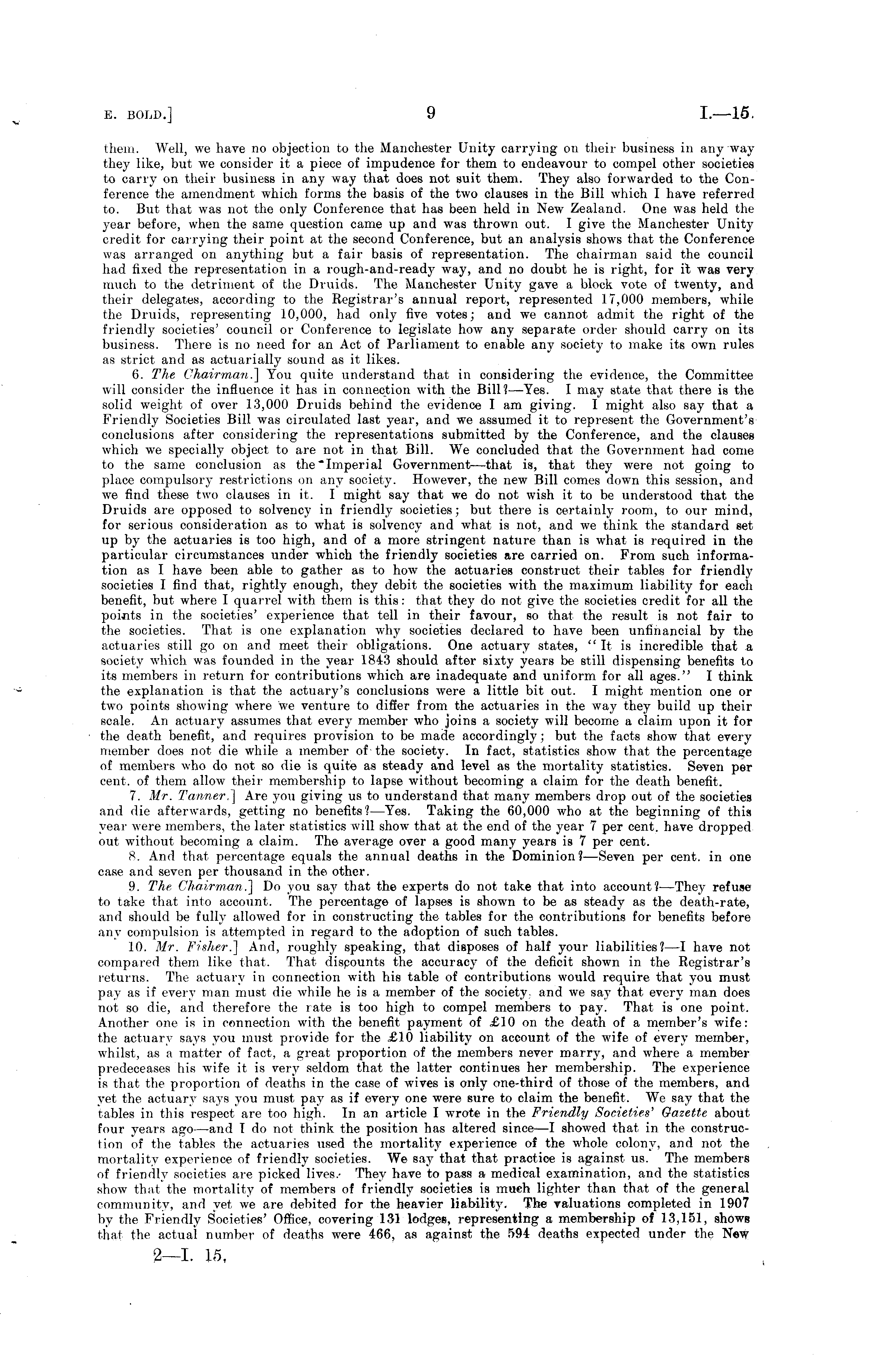them. Well, we have no objection to the Manchester Unity carrying on their business in any way they like, but we consider it a piece of impudence for them to endeavour to compel other societies to carry on their business in any way that does not suit them. They also forwarded to the Conference the amendment which forms the basis of the two clauses in the Bill which I have referred to. But that was not the only Conference that has been held in New Zealand. One was held the year before, when the same question came up and was thrown out. I give the Manchester Unity credit for carrying their point at the second Conference, but an analysis shows that the Conference was arranged on anything but a fair basis of representation. The chairman said the council had fixed the representation in a rough-and-ready way, and no doubt he is right, for il was very much to the detriment of the Druids. The Manchester Unity gave a block vote of twenty, and their delegates, according to the Registrar's annual report, represented 17,000 members, while the Druids, representing 10,000, had only five votes; and we cannot admit the right of the friendly societies' council or Conference to legislate how any separate order should carry on its business. There is no need for an Act of Parliament to enable any society to make its own rules as strict and as actuarially sound as it likes. 6. The You quite understand that in considering the evidence, the Committee will consider the influence it has in connection with the Bill?— Yes. I may state that there is the solid weight of over 13,000 Druids behind the evidence I am giving. I might also say that a Friendly Societies Bill was circulated last year, and we assumed it to represent the Government's conclusions after considering the representations submitted by the Conference, and the clauses which we specially object to are not in that Bill. We concluded that the Government had come to the same conclusion as the "Imperial Government—that is, that they were not going to place compulsory restrictions on any society. However, the new Bill comes down this session, and we find these two clauses in it. I might say that we do not wish it to be understood that the Druids are opposed to solvency in friendly societies; but there is certainly room, to our mind, for serious consideration as to what is solvency and what is not, and we think the standard set up by the actuaries is too high, and of a more stringent nature than is what is required in the particular circumstances under which the friendly societies are carried on. From such information as I have been able to gather as to how the actuaries construct their tables for friendly societies I find that, rightly enough, they debit the societies with the maximum liability for each benefit, but where I quarrel with them is this: that they do not give the societies credit for all the points in the societies' experience that tell in their favour, so that the result is not fair to the societies. That is one explanation why societies declared to have been unfinancial by the actuaries still go on and meet their obligations. One actuary states, "It is incredible that a society which was founded in the year 1843 should after sixty years be still dispensing benefits to its members in return for contributions which are inadequate and uniform for all ages." I think the explanation is that the actuary's conclusions were a little bit out. I might mention one or two points showing where we venture to differ from the actuaries in the way they build up their scale. An actuary assumes that every member who joins a society will become a claim upon it for the death benefit, and requires provision to be made accordingly; but the facts show that every member does not die while a member of-the society. In fact, statistics show that the percentage of members who do not so die is quite as steady and level as the mortality statistics. Seven per cent, of them allow their membership to lapse without becoming a claim for the death benefit. 7. Mr. Tanner ,] Are you giving us to understand that many members drop out of the societies and die afterwards, getting no benefits?— Yes. Taking the 60,000 who at the beginning of this year were members, the later statistics will show that at the end of the year 7 per cent, have dropped out without becoming a claim. The average over a good many years is 7 per cent. 8. And that percentage equals the annual deaths in the Dominion?— Seven per cent, in one case and seven per thousand in the other. 9. The Chairman, ,] Do you say that the experts do not take that into account? —They refuse to take that into account. The percentage of lapses is shown to be as steady as the death-rate, and should be fully allowed for in constructing the tables for the contributions for benefits before any compulsion is attempted in regard to the adoption of such tables. 10. Mr. Fisher.] And, roughly speaking, that disposes of half your liabilities?—l have not compared them like that. That dispounts the accuracy of the deficit shown in the Registrar's returns. The actuary in connection with his table of contributions would require that you must pay as if every man must die while he is a member of the society- and we say that every man does not so die, and therefore the rate is too high to compel members to pay. That is one point. Another one is in connection with the benefit payment of £10 on the death of a member's wife: the actuary says you must provide for the £10 liability on account of the wife of every member, whilst, as a matter of fact, a great proportion of the members never marry, and where a member predeceases his wife it is very seldom that the latter continues her membership. The experience is that the proportion of deaths in the case of wives is only one-third of those of the members, and yet the actuary says you must pay as if every one were sure to claim the benefit. We say that the tables in this respect are too high. 