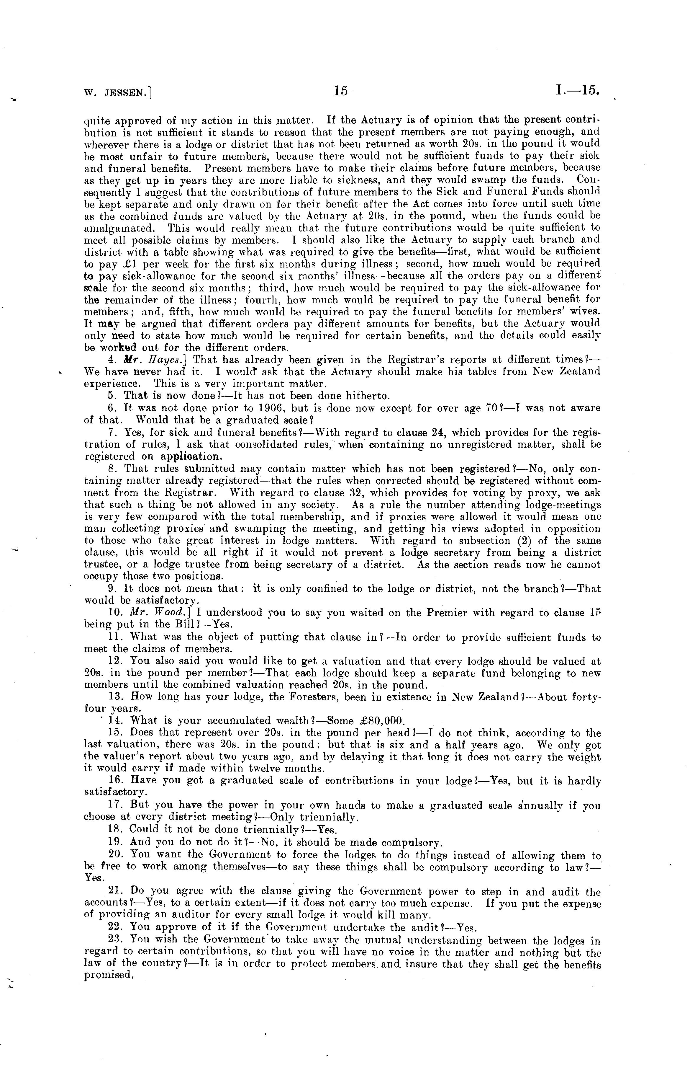quite approved of my action in this matter. If the Actuary is of opinion that the present contribution is not sufficient it stands to reason that the present members are not paying enough, and wherever there is a lodge or district that has not been returned as worth 20s. in the pound it would be most unfair to future members, because there would not be sufficient funds to pay their sick and funeral benefits. Present members have to make their claims before future members, because as they get up in years they are more liable to sickness, and they would swamp the funds. Consequently I suggest that the contributions of future members to the Sick and Funeral Funds should be kept separate and only drawn on for their benefit after the Act comes into force until such time as the combined funds are valued by the Actuary at 20s. in the pound, when the funds could be amalgamated. This would really mean that the future contributions would be quite sufficient to meet all possible claims by members. I should also like the Actuary to supply each branch and district with a table showing what was required to give the benefits —first, what would be sufficient to pay £1 per week for the first six months during illness; second, how much would be required to pay sick-allowance for the second six months' illness —because all the orders pay on a different scale for the second six months; third, how much would be required to pay the sick-allowance for the remainder of the illness; fourth, how much would be required to pay the funeral benefit for members; and, fifth, how much would be required to pay the funeral benefits for members' wives. It may be argued that different orders pay different amounts for benefits, but the Actuary would only need to state how much would be required for certain benefits, and the details could easily be worked out for the different orders. 4. Mr. Hayes.] That has already been given in the Registrar's reports at different times? — We have never had it. I would* ask that the Actuary should make his tables from New Zealand experience. This is a very important matter. 5. That is now done?—lt has not been done hitherto. 6. It was not done prior to 1906, but is done now except for over age 70?— I was not aware of that. Would that be a graduated scale? 7. Yes, for sick and funeral benefits? —With regard to clause 24, which provides for the registration of rules, I ask that consolidated rules, when containing no unregistered matter, shall be registered on application. 8. That rules submitted may contain matter which has not been registered?—No, only containing matter already registered—that the rules when corrected should be registered without comment from the Registrar. With regard to clause 32, which provides for voting by proxy, we ask that such a thing be not allowed in any society. As a rule the number attending lodge-meetings is very few compared with the total membership, and if proxies were allowed it would mean one man collecting proxies and swamping the meeting, and getting his views adopted in opposition to those who take great interest in lodge matters. With regard to subsection (2) of the same clause, this would be all right if it would not prevent a lodge secretary from being a district trustee, or a lodge trustee from being secretary of a district. As the section reads now he cannot occupy those two positions. 9. It does not mean that: it is only confined to the lodge or district, not the branch?-—That would be satisfactory. 10. Mr. Wood.] I understood you to say you waited on the Premier with regard to clause 15 being put in the Bill? —Yes. 11. What was the object of putting that clause in?—ln order to provide sufficient funds to meet the claims of members. 12. You also said you would like to get a valuation and that every lodge should be valued at 20s. in the pound per member?— That each lodge should keep a separate fund belonging to new members until the combined valuation reached 20s. in the pound. 13. How long has your lodge, the Foresters, been in existence in New Zealand? —About fortyfour years. 14. What is your accumulated wealth?— Some £80,000. 15. Does that represent over 20s. in the pound per head?—l do not think, according to the last valuation, there was 20s. in the pound; but that is six and a half years ago. We only got the valuer's report about two years ago, and by delaying it that long it does not carry the weight it would carry if made within twelve months. 16. Have you got a graduated scale of contributions in your lodge?— Yes, but it is hardly satisfactory. 17. But you have the power in your own hands to make a graduated scale annually if you choose at every district meeting?— Only triennially. 18. Could it not be done triennially?—Yes. 19. And you do not do it?—No, it should be made compulsory. 20. You want the Government to force the lodges to do things instead of allowing them to be free to work among themselves—to say these things shall be compulsory according to law? — Yes. 21. Do you agree with the clause giving the Government power to step in and audit the accounts?— Yes, to a certain extent—if it does not carry too much expense. If you put the expense of providing an auditor for every small lodge it would kill many. 22. You approve of it if the Government undertake the audit?— Yes. 23. You wish the Government to take away the mutual understanding between the lodges in regard to certain contributions, so that you will have no voice in the matter and nothing but the law of the country? —It is in order to protect members and. insure that they shall get the benefits promised.