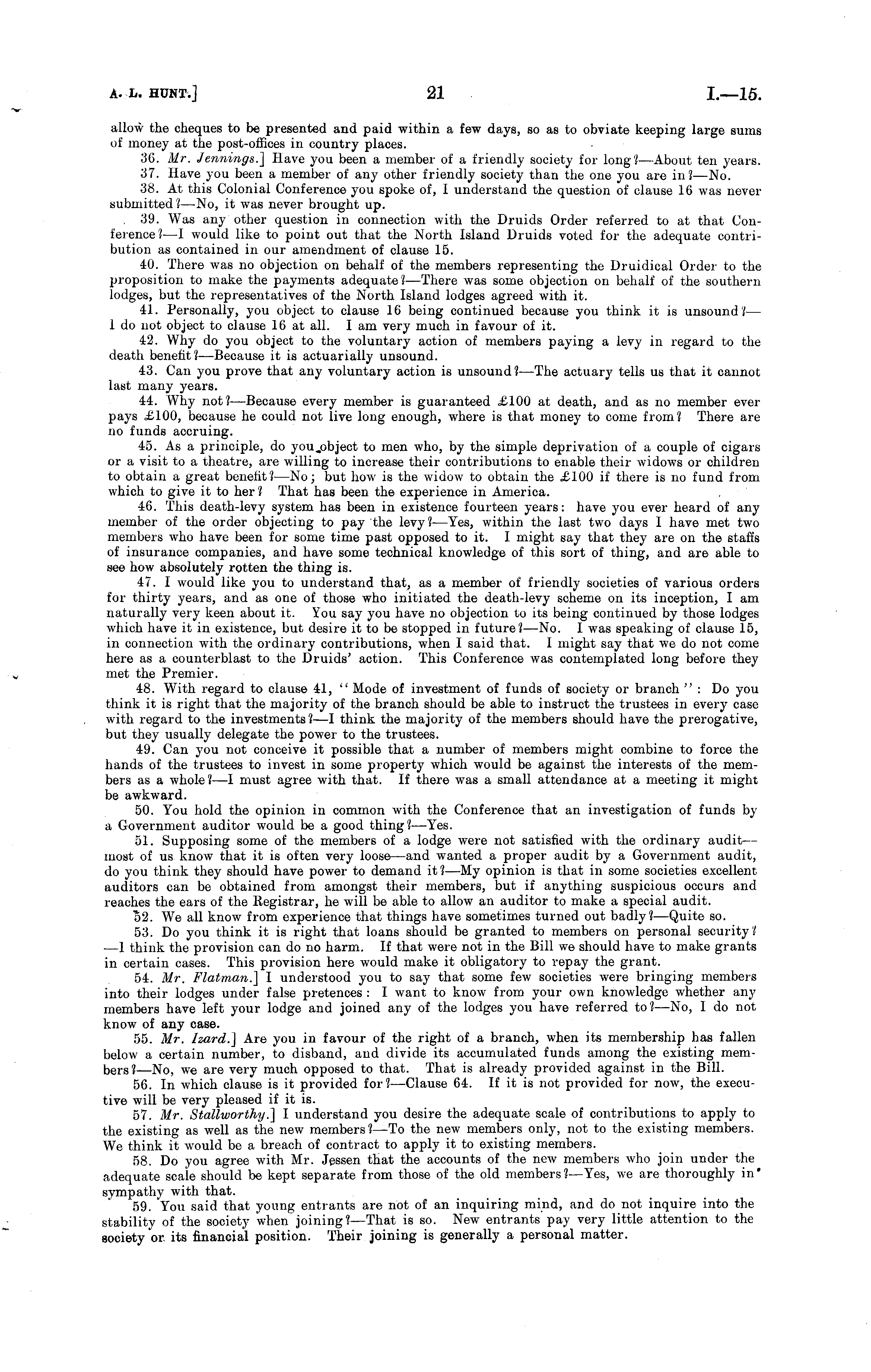allow the cheques to be presented and paid within a few days, so as to obviate keeping large sums of money at the post-offices in country places. 36. Mr. Jennings.] Have you been a member of a friendly society for long/—About ten years. 37. Have you been a member of any other friendly society than the one you are in? —No. 38. At this Colonial Conference you spoke of, I understand the question of clause 16 was never submitted ?—No, it was never brought up. . 39. Was any other question in connection with the Druids Order referred to at that Conference? —I would like to point out that the North Island Druids voted for the adequate contribution as contained in our amendment of clause 15. 40. There was no objection on behalf of the members representing the Druidical Order to the proposition to make the payments adequate?— There was some objection on behalf of the southern lodges, but the representatives of the North Island lodges agreed with it. 41. Personally, you object to clause 16 being continued because you think it is unsound?— Ido not object to clause 16 at all. lam very much in favour of it. 42. Why do you object to the voluntary action of members paying a levy in regard to the death benefit? —Because it is actuarially unsound. 43. Can you prove that any voluntary action is unsound?—-The actuary tells us that it cannot last many years. 44. Why not?— Because every member is guaranteed £100 at death, and as no member ever pays £100, because he could not live long enough, where is that money to come from? There are no funds accruing. 45. As a principle, do you.object to men who, by the simple deprivation of a couple of cigars or a visit to a theatre, are willing to increase their contributions to enable their widows or children to obtain a great benefit? —Noj but how is the widow to obtain the £100 if there is no fund from which to give it to her ? That has been the experience in America. 46. This death-levy system has been in existence fourteen years: have you ever heard of any member of the order objecting to pay the levy? —Yes, within the last two days I have met two members who have been for some time past opposed to it. 1 might say that they are on the staffs of insurance companies, and have some technical knowledge of this sort of thing, and are able to see how absolutely rotten the thing is. 47. I would like you to understand that, as a member of friendly societies of various orders for thirty years, and as one of those who initiated the death-levy scheme on its inception, I am naturally very keen about it. You say you have no objection to its being continued by those lodges which have it in existence, but desire it to be stopped in future?— No. 1 was speaking of clause 15, in connection with the ordinary contributions, when I said that. 1 might say that we do not come here as a counterblast to the Druids' action. This Conference was contemplated long before they met the Premier. 48. With regard to clause 41, " Mode of investment of funds of society or branch " : Do you think it is right that the majority of the branch should be able to instruct the trustees in every case with regard to the investments?—l think the majority of the members should have the prerogative, but they usually delegate the power to the trustees. 49. Can you not conceive it possible that a number of members might combine to force the hands of the trustees to invest in some property which would be against the interests of the members as a whole? —I must agree with that. If there was a small attendance at a meeting it might be awkward. 50. You hold the opinion in common with the Conference that an investigation of funds by a Government auditor would be a good thing?— Yes. 51. Supposing some of the members of a lodge were not satisfied with the ordinary audit — most of us know that it is often very loose—and wanted a proper audit by a Government audit, do you think they should have power to demand it?—My opinion is that in some societies excellent auditors can be obtained from amongst their members, but if anything suspicious occurs and reaches the ears of the Registrar, he will be able to allow an auditor to make a special audit. 02. We all know from experience that things have sometimes turned out badly? —Quite so. 53. Do you think it is right that loans should be granted to members on personal security? —1 think the provision can do no harm. If that were not in the Bill we should have to make grants in certain cases. This provision here would make it obligatory to repay the grant. 54. Mr. Flatrnan.] I understood you to say that some few societies were bringing members into their lodges under false pretences : I want to know from your own knowledge whether any members have left your lodge and joined any of the lodges you have referred to?—No, I do not know of any case. 55. Mr. hard.] Are you in favour of the right of a branch, when its membership has fallen below a certain number, to disband, and divide its accumulated funds among the existing members?—No, we are very much opposed to that. That is already provided against in the Bill. 56. In which clause is it provided for? —Clause 64. If it is not provided for now, the executive will be very pleased if it is. 57. Mr. Stallworthy .] I understand you desire the adequate scale of contributions to apply to the existing as well as the new members? —To the new members only, not to the existing members. We think it would be a breach of contract to apply it to existing members. 58. Do you agree with Mr. Jessen that the accounts of the new members who join under the adequate scale should be kept separate from those of the old members? —Yes, we are thoroughly in' sympathy with that. 59. You said that young entrants are not of an inquiring mind, and do not inquire into the stability of the society when joining?— That is so. New entrants pay very little attention to the society "or its financial position. Their join