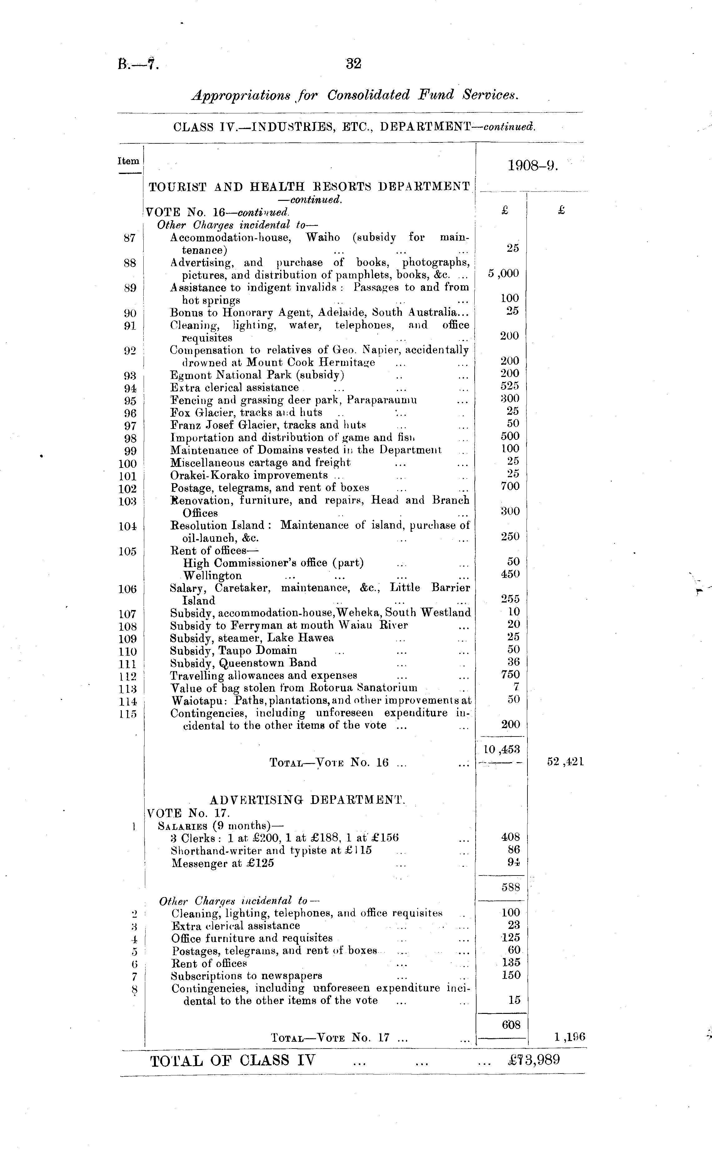 item 19 »8-9. TOURIST AND HEALTH RESORTS DEPARTMENT — continued. VOTE No. 16—continued. Other Charges incidental to — Accommodation-house, Waiho (subsidy for maintenance) Advertising, and purchase of books, photographs, pictures, and distribution of pamphlets, books, &c. ... Assistance to indigent invalids : Passages to and from hot springs Bonus to Honorary Agent, Adelaide, South Australia... Cleaning, lighting, water, telephones, and office requisites Compensation to relatives of Geo. Napier, accidentally drowned at Mount Cook Hermitage Egmont National Park (subsidy) Extra clerical assistance Fencing and grassing deer park, Paraparaumu Fox Glacier, tracks and huts Franz Josef Glacier, tracks and huts Importation and distribution of game and fisii Maintenance of Domains vested in the Department Miscellaneous cartage and freight Orakei-Korako improvements .. Postage, telegrams, and rent of boxes Renovation, furniture, and repairs, Head and Branch Offices Resolution Island : Maintenance of island, purchase of oil-launch, &c. Rent of offices — High Commissioner's office (part) Wellington Salary, Caretaker, maintenance, &c, Little Barrier Island Subsidy, accommodation-house,Weheka, South Westland Subsidy to Ferryman at mouth Waiau River Subsidy, steamer, Lake Hawea Subsidy, Taupo Domain Subsidy, Queenstown Band Travelling allowances and expenses Value of bag stolen from Rotorua Sanatorium Waiotapu: Paths, plantations,and other improvementsat Contingencies, including unforeseen expenditure incidental to the other items of the vote ... £ £ 87 25 88 5,000 89 100 25 90 91 200 92 200 200 525 300 25 50 500 100 25 25 700 93 94 95 96 97 98 99 100 101 102 103 300 104 250 105 50 450 106 107 108 109 110 111 112 113 114 115 255 10 20 25 50 36 750 7 50 200 52,421 10 ,453 Total —Vote No. 16 ... ADVERTISING DEPARTMENT. VOTE No. 17. Salaries (9 months) — 3 Clerks : 1 at £200, 1 at £188, 1 at £156 Shorthand-writer and typiste at £ 115 Messenger at £125 408 86 94 588 •2 3 1 5 6 7 s Other Charges incidental to — Cleaning, lighting, telephones, and office requisites Extra clerical assistance Office furniture and requisites Postages, telegrams, and rent of boxes Rent of offices Subscriptions to newspapers Contingencies, including unforeseen expenditure incidental to the other items of the vote 100 23 125 60 135 150 15 1,196 Total—Vote No. 17 ... 608 TOTAL OE GLASS IV £1 3,989