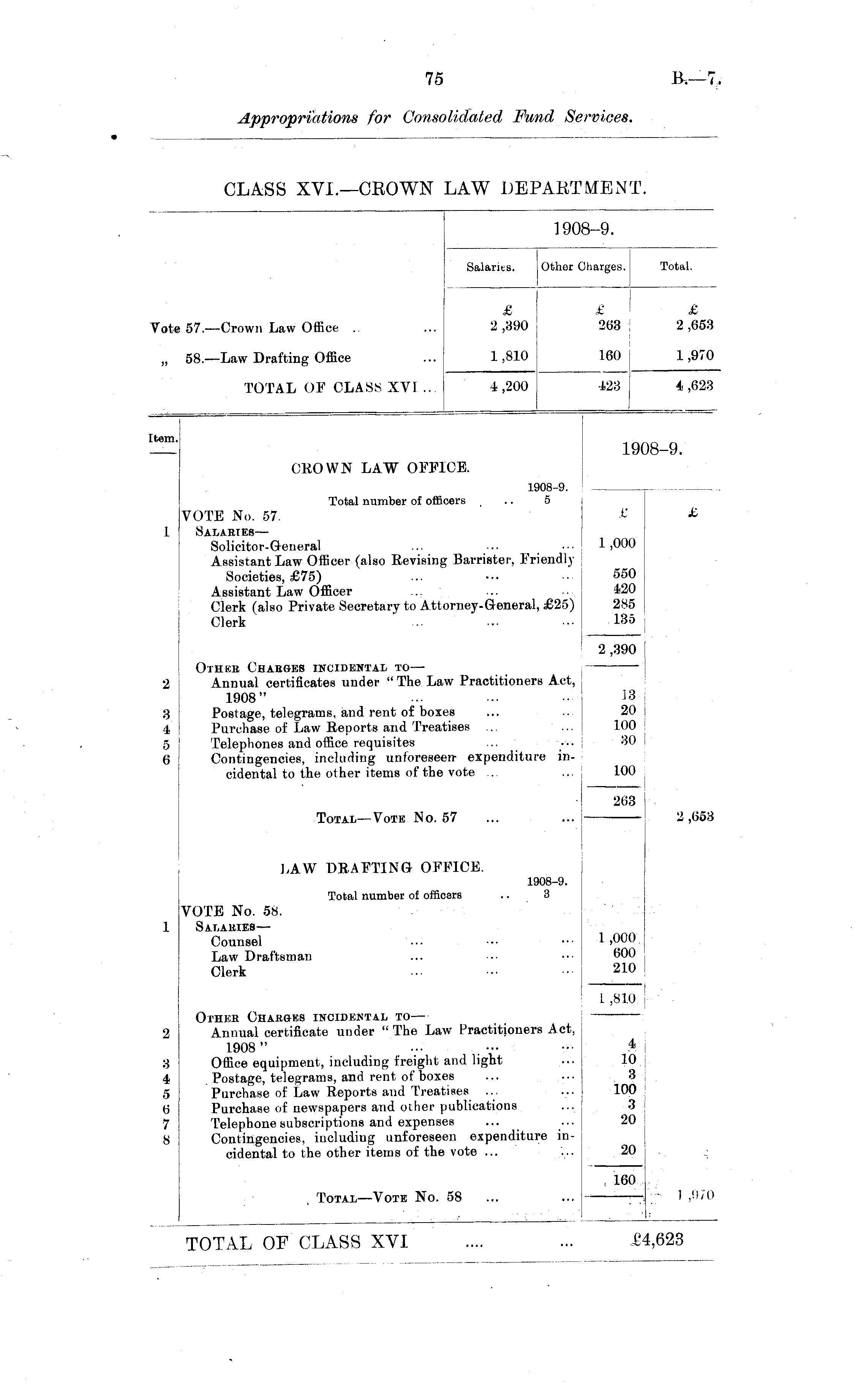Salaries. Other Charges. Total. £ 2,390 £ 263 I £ 2 ,653 ote 57. —Crown Law Office .. „ 58. —Law Drafting Office 1,810 160 1,970 TOTAL OF CLASS XVI ... 4,200 423 4 ,623 item. 19 i8-9. CROWN LAW OFFICE. 1908-9. Total number of officers . .. 5 VOTE No. 57. Salaries — Solicitor-General Assistant Law Officer (also Revising Barrister, Friendly Societies, £75) Assistant Law Officer Clerk (also Private Secretary to Attorney-General, £25) Clerk £ £ 1,000 550 420 285 135 Other Charges incidental to — Annual certificates under " The Law Practitioners Act, 1908" Postage, telegrams, and rent of boxes Purchase of Law Reports and Treatises ... Telephones and office requisites Contingencies, including unforeseen- expenditure incidental to the other items of the vote ... 2 ,390 2 3 4 5 6 13 20 100 30 100 263 Total—Vote No. 57 2 ,653 LAW DRAFTING OFFICE. 1908-9. Total number of officers .. 3 VOTE No. 58. Salaries — Counsel Law Draftsman Clerk 1,000 600 210 Other Charges incidental to — Annual certificate under " The Law Practitioners Act, 1908" Office equipment, including freight and light Postage, telegrams, and rent of boxes Purchase of Law Reports and Treatises ... Purchase of newspapers and other publications Telephone subscriptions and expenses Contingencies, including unforeseen expenditure incidental to the other items of the vote ... 1,810 2 4 10 3 100 3 20 3 4 a 6 7 8 20 , 160 Total —Vote No. 58 1 ,970 TAL OF CLASS XVI £ ,623