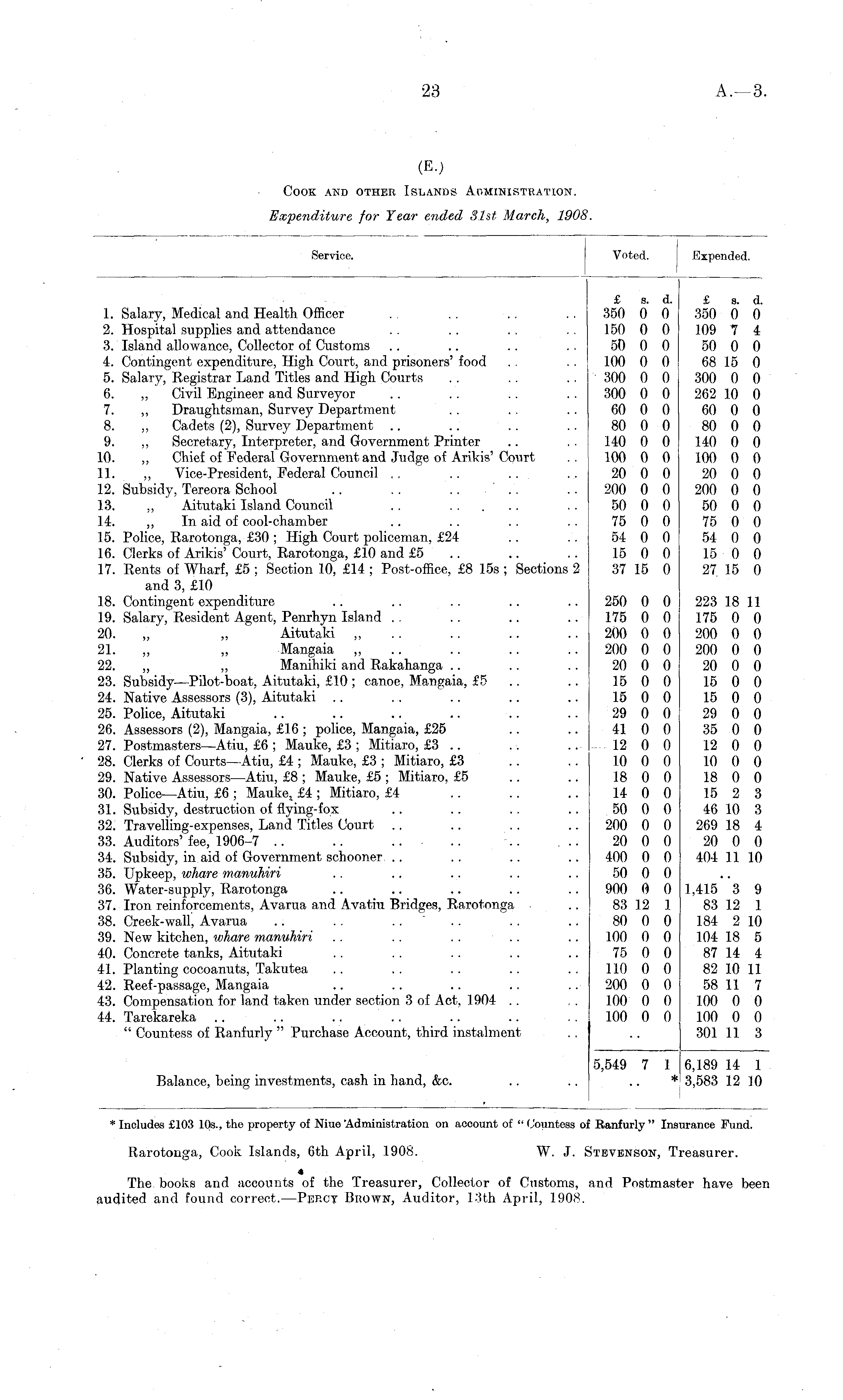 Rarotonga, Cook Islands, 6th April, 1908. W. J. Stevenson, Treasurer. 4 The. books and accounts of the Treasurer, Collector of Customs, and Postmaster have been audited and found correct. —Percy Brown, Auditor, 13th April, 1908.