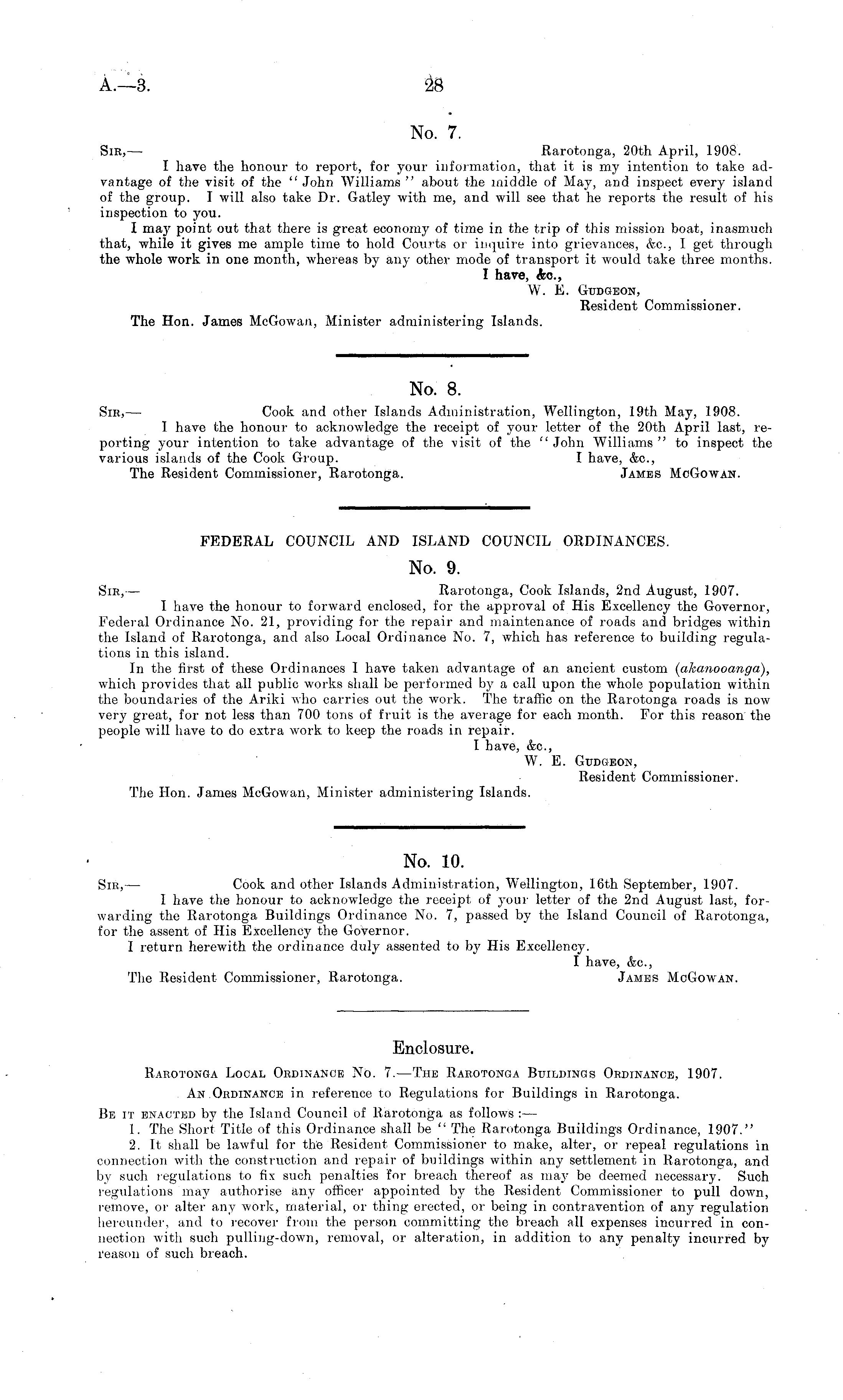 No. 10. Sir, — Cook and other Islands Administration, Wellington, 16th September, 1907. I have the honour to acknowledge the receipt of your letter of the 2nd August last, forwarding the Rarotonga Buildings Ordinance No. 7, passed by the Island Council of Rarotonga, for the assent of His Excellency the Governor. I return herewith the ordinance duly assented to by His Excellency. I have, &c, The Resident Commissioner, Rarotonga. James MoGowan.