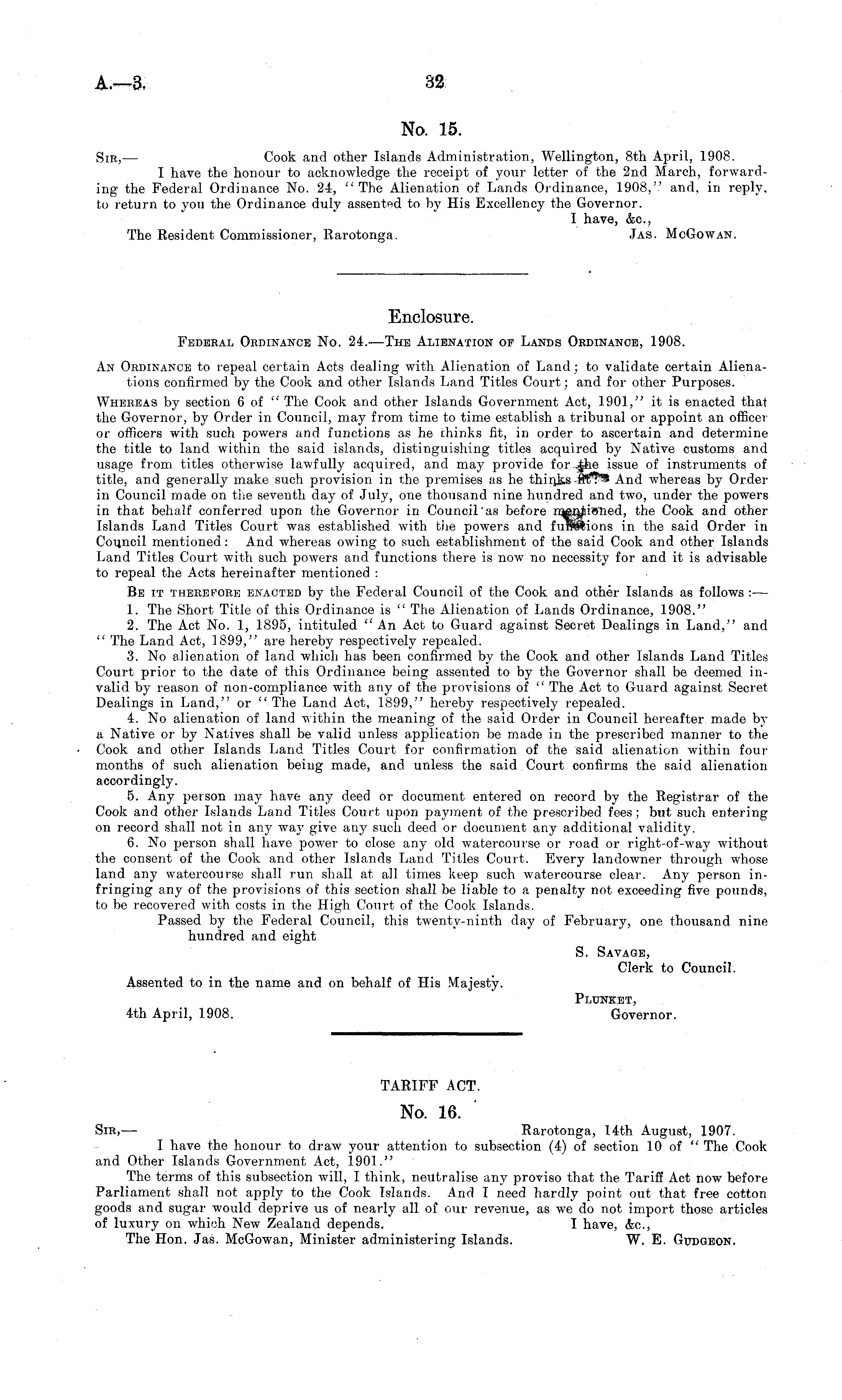 Sir, — Cook and other Islands Administration, Wellington, Bth April, 1908. I have the honour to acknowledge the receipt of your letter of the 2nd March, forwarding the Federal Ordinance No. 24, " The Alienation of Lands Ordinance, 1908," and, in reply, to return to you the Ordinance duly assented to by His Excellency the Governor. I have, &c, The Resident Commissioner, Rarotonga. Jas. McGowan.