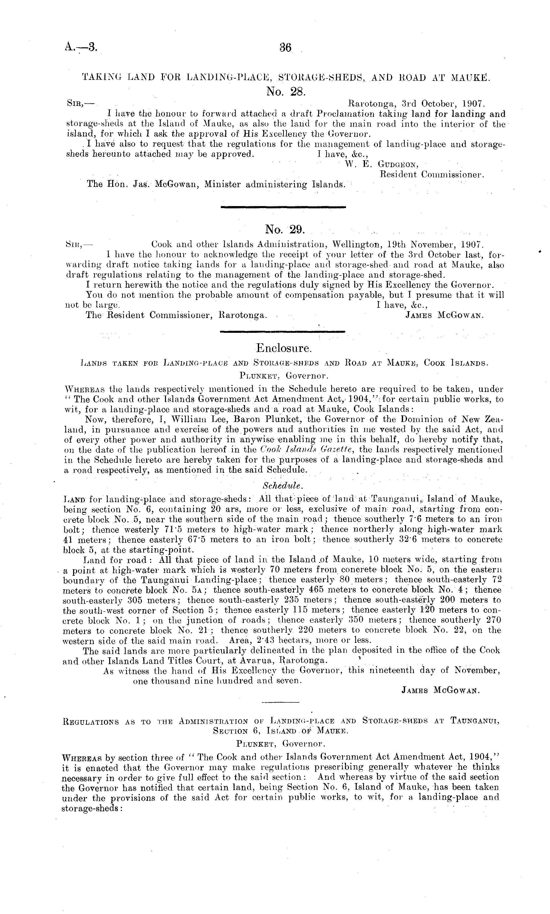 Enclosure. Lands taken for Landing-place and Storage-sheds and Road at Maukk, Cook Islands. Plunket, Governor. Whereas the lands respectively mentioned in the Schedule hereto are required to be taken, under " The Cook and other Islands Government Act Amendment Act, 1904," for certain public works, to wit, for a landing-place and storage-sheds and a road at Mauke, Cook Islands: Now, therefore, I, William Lee, Baron Plunket, the Governor of the Dominion of New Zealand, in pursuance and exercise of the powers and authorities in me vested by the said Act, and of every other power and authority in anywise enabling me in this behalf, do hereby notify that, on the date of the publication hereof in the Cool: Islands Gazette, the lands respectively mentioned in the Schedule hereto are hereby taken for the purposes of a landing-place and storage-sheds and a road respectively, as mentioned in the said Schedule. Schedule. Land for landing-place and storage-sheds: All that piece of land at Tauuganui,: Island of Mauke, being section No. 6, containing 20 ars, more or less, exclusive of main road, starting from concrete block No. 5, near the southern side of the main road; thence southerly 76 meters to an iron bolt; thence westerly 71"5 meters to high-water mark; thence northerly along high-water mark 41 meters; thence easterly 675 meters to an iron bolt; thence southerly 326 meters to concrete block 5, at the starting-point. Land for road : All that piece of land in the Island .of Mauke, 10 meters wide, starting from a point at high-water mark which is westerly 70 meters from concrete block No. 5, on the eastern boundary of the Taunganui Landing-place ; thence easterly 80 meters ; thence south-easterly 72 meters to concrete block No. sa; thence south-easterly 465 meters to concrete block No. 4; thence south-easterly 305 meters; thence south-easterly 235 meters; thence south-easterly 200 meters to the south-west corner of Section 5; thence easterly 115 meters; thence easterly 120 meters to concrete block No. 1; on the junction of roads; thence easterly 850 meters; thence southerly 270 meters to concrete block No. 21 ; thence southerly 220 meters to concrete block No. 22, on the western side of the said main road. Area, 243 hectare, more or less. The said lands are more particularly delineated in the plan deposited in the office of the Cook and other Islands Land Titles Court, at Avarua, Rarotonga. As witness the hand of His Excellency the Governor, this nineteenth day of November, one thousand nine hundred and seven. James McGowan.