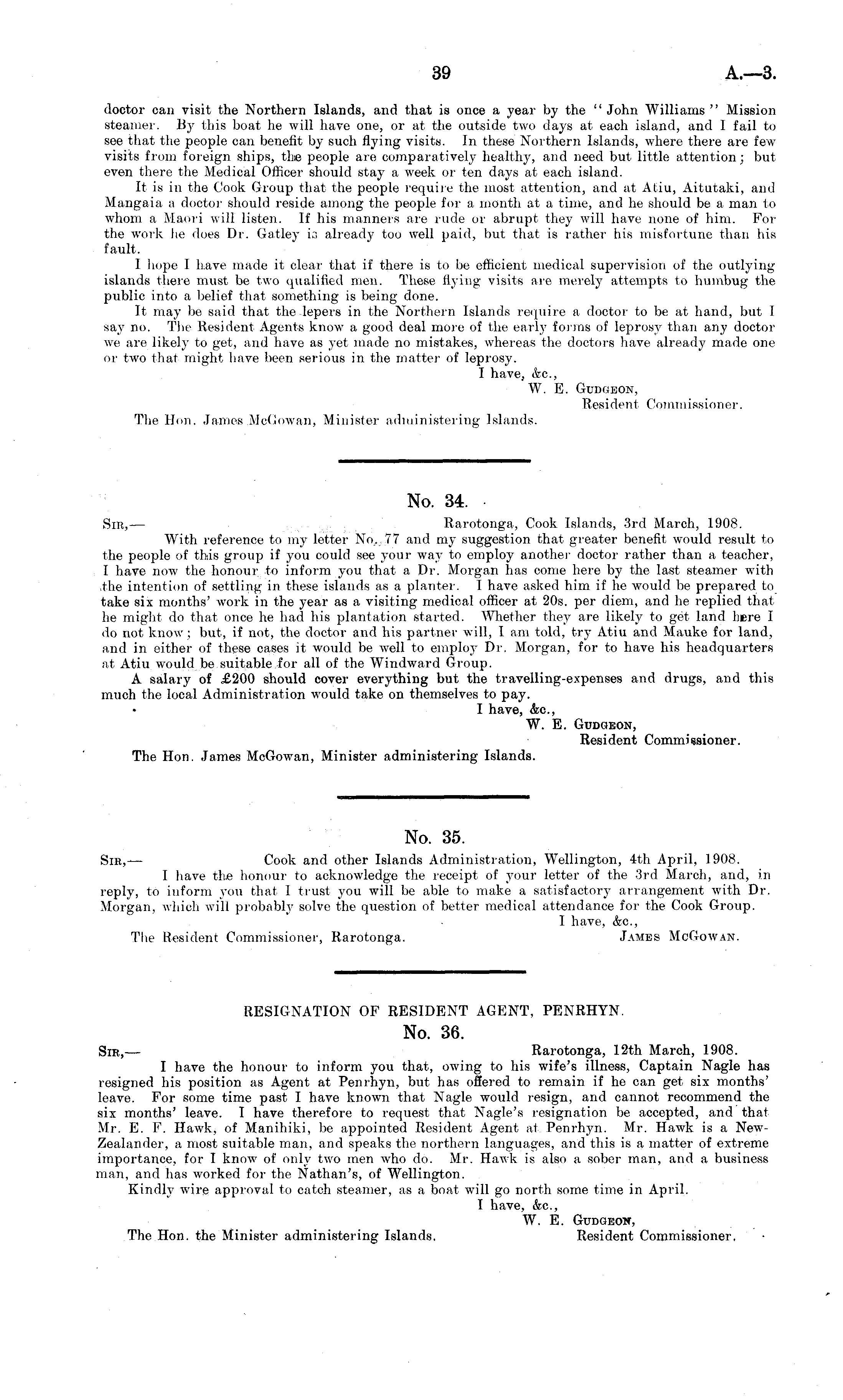 No. 34. • Sir, — Rarotonga, Cook Islands, 3rd March, 1908. With reference to my letter No. 77 and my suggestion that greater benefit would result to the people of this group if you could see your way to employ another doctor rather than a teacher, I have now the honour to inform you that a Dr. Morgan has come here by the last steamer with the intention of settling in these islands as a planter. I have asked him if he would be prepared to take six months' work in the year as a visiting medical officer at 20s. per diem, and he replied that he might do that once he had his plantation started. Whether they are likely to get land here I do not know; but, if not, the doctor and his partner will, I am told, try Atiu and Mauke for land, and in either of these cases it would be well to employ Dr. Morgan, for to have his headquarters at Atiu would be suitable for all of the Windward Group. A salary of £200 should cover everything but the travelling-expenses and drugs, and this much the local Administration would take on themselves to pay. I have, &c, W. E. Gudgeon, Resident Commissioner. The Hon. James McGowan, Minister administering Islands.