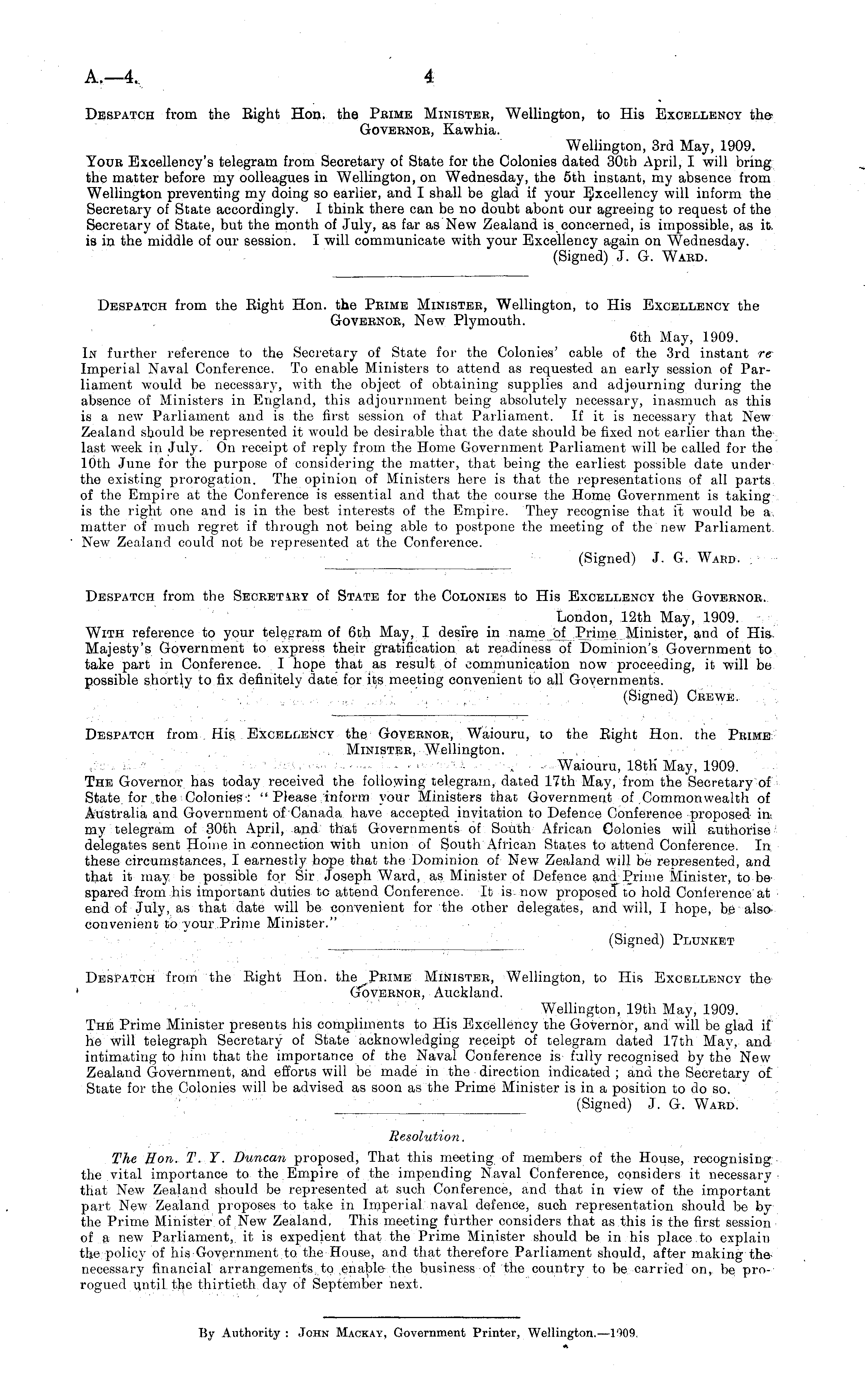 Despatch from the Right Hon. the Peime Ministee, Wellington, to His Excellency theGovernoe, Kawhia. Wellington, 3rd May, 1909. Your Excellency's telegram from Secretary of State for the Colonies dated 30th April, I will bring the matter before my oolleagues in Wellington, on Wednesday, the sth instant, my absence from Wellington preventing my doing so earlier, and I shall be glad if your Excellency will inform the Secretary of State accordingly. I think there can be no doubt abont our agreeing to request of the Secretary of State, but the month of July, as far as New Zealand is concerned, is impossible, as it. is in the middle of our session. I will communicate with your Excellency again on Wednesday. (Signed) J. G. Ward. Despatch from the Right Hon. the Peime Minister, Wellington, to His Excellency the Goveenoe, New Plymouth. 6th May, 1909. In further reference to the Secretary of State for the Colonies' cable of the 3rd instant reImperial Naval Conference. To enable Ministers to attend as requested an early session of Parliament would be necessary, with the object of obtaining supplies and adjourning during the absence of Ministers in England, this adjournment being absolutely necessary, inasmuch as this is a new Parliament and is the first session of that Parliament. If it is necessary that New Zealand should be represented it would be desirable that the date should be fixed not earlier than the last week in July. On receipt of reply from the Home Government Parliament will be called for the 10th June for the purpose of considering the matter, that being the earliest possible date under the existing prorogation. The opinion of Ministers here is that the representations of all parts of the Empire at the Conference is essential and that the course the Home Government is taking is the right one and is in the best interests of the Empire. They recognise that it would be a. matter of much regret if through not being able to postpone the meeting of the new Parliament New Zealand could not be represented at the Conference. (Signed) J. G. Ward. Despatch from the SecretißY of State for the Colonies to His Excellency the Governoe. London, 12th May, 1909. With reference to your telegram of 6th May, I desire in name of Prime Minister, and of His. Majesty's Government to express their gratification at readiness of Dominion's Government to take part in Conference. I hope that as result of communication now proceeding, it will be possible shortly to fix definitely date for its meeting convenient to all Governments. • '...,--., (Signed) Ceewe. Despatch from His. Excellency the Goveenor, Waiouru, to the Right Hon. the Peime Ministee, Wellington. '■■"■ '■■ ■■■■-•:■-> ■■■••■■• -. ■ ._ Waiouru, 18th May, 1909. The Governor has today received the following telegram, dated 17th May, from the Secretary of State for the Colonies : " Please inform your Ministers that Government of Commonwealth of Australia and Government of Canada have accepted invitation to Defence Conference proposed in my telegram of 30th April, and that Governments of South African Colonies will authorise delegates sent Home in connection with union of South African States to attend Conference. In these circumstances, I earnestly hope that the Dominion of New Zealand will be represented, and that it may be possible for Sir Joseph Ward, as Minister of Defence and Prime Minister, to bespared from his important duties to attend Conference. It is now proposed to hold Conierenee at end of July, as that date will be convenient for the other delegates, and will, I hope, be' alsoconvenient to your .Prime Minister." (Signed) Plunket Despatch from the Right Hon. the Peime Ministee, Wellington, to His Excellency the- ' Goveenoe, Auckland. Wellington, 19th May, 1909. The Prime Minister presents his compliments to His Excellency the Governor, and will be glad if he will telegraph Secretary of State acknowledging receipt of telegram dated 17th May, and intimating to him that the importance of the Naval Conference is fully recognised by the New Zealand Government, and efforts will be made in the direction indicated ; and the Secretary of State for the Colonies will be advised as soon as the Prime Minister is in a position to do so. _ __ (Signed) J. G. Ward. Resolution. The Hon. T. Y. Duncan proposed, That this meeting of members of the House, recognising the vital importance to the Empire of the impending Naval Conference, considers it necessary that New Zealand should be represented at such Conference, and that in view of the important part New Zealand proposes to take in Imperial naval defence, such representation should be by the Prime Minister of New Zealand, This meeting further considers that as this is the first session of a new Parliament,, it is expedient that the Prime Minister should be in his place to explain the policy of his Government to the House, and that therefore. Parliament should, after making thenecessary financial arrangements to .enable the business of the country to be carried on, be prorogued until the thirtieth day of September next.