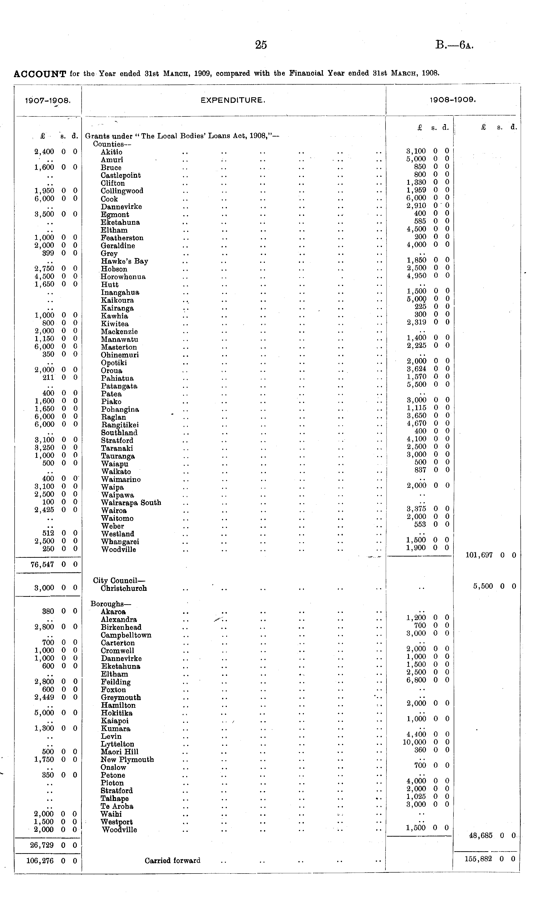 19O7-19O8. EXPENDITURE. 19O8-19O9. . £ s. d. Grants under " The Local Bodies' Loans Act, 1908," — Counties— Akitio Amuri Bruce • • Oastlepoint Clifton Collingwood Cook Dannevirke Bgmont Eketahuna Eltham Peatherston Geraldine Grey Hawke's Bay Hobson • • • • Horowhenua Hutt Inangahua Kaikoura Kairanga • • • • ' • Kawhia Kiwitea Mackenzie Manawatu Masterton Ohinemuri • • • • Opotiki Oroua Pahiatua Patangata Patea Piako Pohangina Raglan Kangitikei Southland Stratford Taranaki Tauranga Waiapu Waikato Waimarino Waipa Waipawa Wairarapa South Wairoa Waitomo Weber Westland Whangarei Woodville £ s. d. £ s. d. 2,400 0 0 1,600 0 0 1,950 0 0 6,000 0 0 3,100 0 0 5,000 0 0 850 0 0 800 0 0 1,330 0 0 1,959 0 0 6,000 0 0 2,910 0 0 400 0 0 585 0 0 4,500 0 0 200 0 0 4,000 0 0 3,500 0 0 1,000 0 0 2,000 0 0 399 0 0 2,750 0 0 4,500 0 0 1,650 0 0 1,850 0 0 2,500 0 0 4,950 0 0 1,500 0 0 5,000 0 0 225 0 0 300 0 0 2,319 0 0 1,000 0 0 800 0 0 2,000 0 0 1,150 0 0 6,000 0 0 350 0 0 1,400 0 0 2,225 0 0 2,000 0 0 211 0 0 2,000 0 0 3,624 0 0 1,570 0 0 5,500 0 0 400 0 0 1,600 0 0 1,650 0 0 6,000 0 0 6,000 0 0 3,000 0 0 1,115 0 0 3,650 0 0 4,670 0 0 400 0 0 4,100 0 0 2,500 0 0 3,000 0 0 500 0 0 837 0 0 3,100 0 0 3,250 0 0 1,000 0 0 500 0 0 101,697 0 0 400 0 0 3,100 0 0 2,500 0 0 100 0 0 2,425 0 0 2,000 0 0 3,375 0 0 2,000 0 0 553 0 0 512 0 0 2,500 0 0 250 0 0 1,500 0 0 1,900 0 0 76,547 0 0 City Council— Christohuroh 5,500 0 0 3,000 0 0 380 0 0 2,800 0 0 700 0 0 1,000 0 0 1,000 0 0 600 0 0 2,800 0 0 600 0 0 2,449 0 0 5,000 0 0 1,300 0 0 Boroughs— Akaroa .. Alexandra .. .•>* • ■ Birkenhead Campbelltown Carterton Cromwell Dannevirke Eketahuna Eltham Feilding Foxton Greymouth Hamilton Hokitika Kaiapoi .'. .. / Kumara • ■ ■ • Levin Lyttelton Maori Hill New Plymouth Onslow Petone Pioton Stratford Taihape Tβ Aroha Waihi Westport Woodville 1,200 0 0 700 0 0 3,000 0 0 2,000 0 0 1,000 0 0 1,500 0 0 2,500 0 0 6,800 0 0 2,000 0 0 1,000 0 0 4,400 0 0 10,000 0 0 360 0 0 500 0 0 1,750 0 0 700 0 0 350 0 0 4,000 0 0 2,000 0 0 1,025 0 0 3,000 0 0 2,000 0 0 1,500 0 0 2,000 0 0 48,685 0 0 1,500 0 0 26,729 0 0 Carried forward 106,276 0 0 155,882 0 0