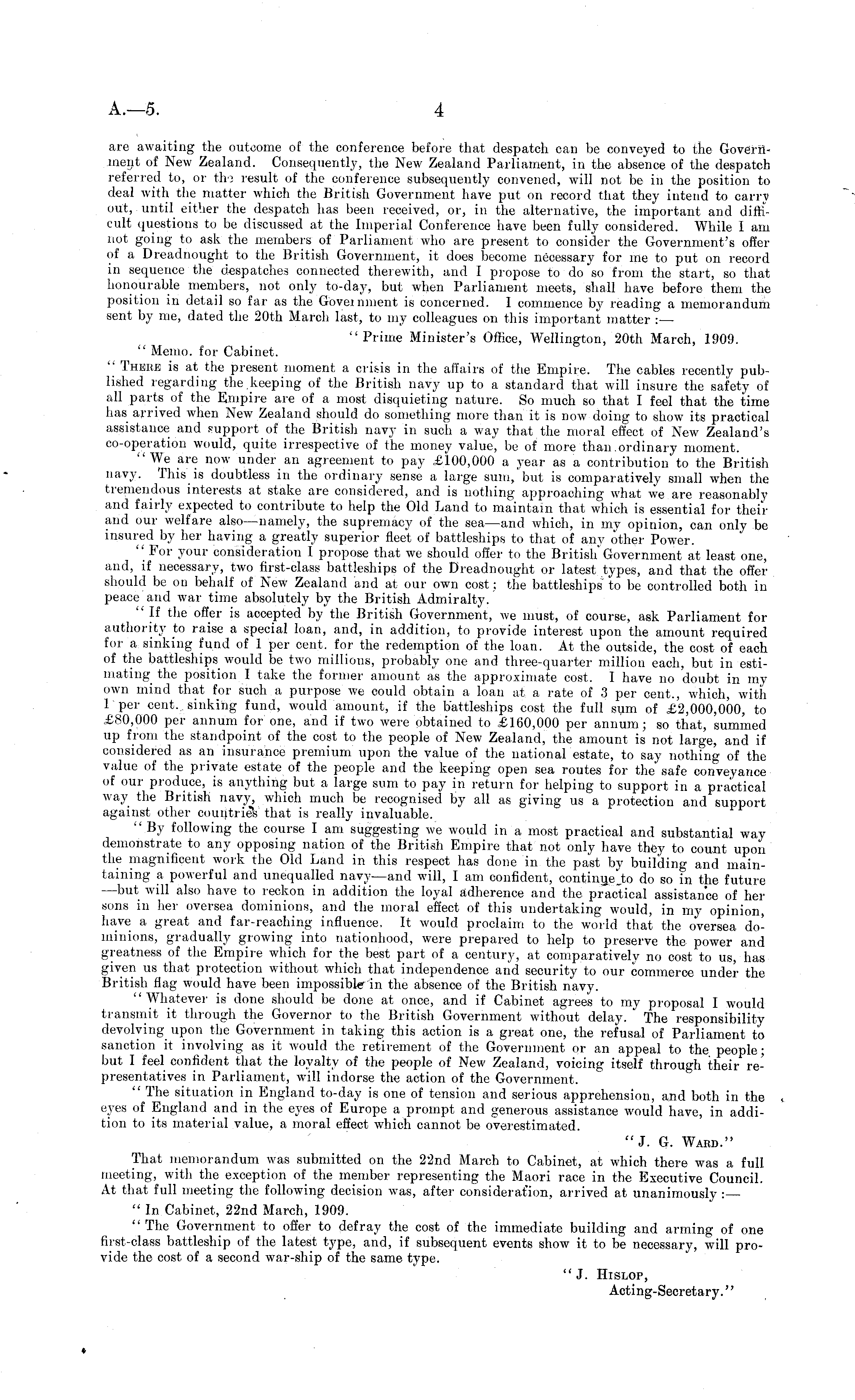 are awaiting the outcome of the conference before that despatch can be conveyed to the Government of New Zealand. Consequently, the New Zealand Parliament, in the absence of the despatch referred to, or tho result of the conference subsequently convened, will not be in the position to deal with the matter which the British Government have put on record that they intend to carry out, until either the despatch has been received, or, in the alternative, the important and difficult questions to be discussed at the Imperial Conference have been fully considered. While lam not going to ask the members of Parliament who are present to consider the Government's offer of a Dreadnought to the British Government, it does become necessary for me to put on record in sequence the despatches connected therewith, and I propose to do so from the start, so that honourable members, not only to-day, but when Parliament meets, shall have before them the position in detail so far as the Government is concerned. I commence by reading a memorandum sent by me, dated the 20th March last, to my colleagues on this important matter : — "Prime Minister's Office, Wellington, 20th March, 1909. " Memo, for Cabinet. " There is at the present moment a crisis in the affairs of the Empire. The cables recently published regarding the.keeping of the British navy up to a standard that will insure the safety of all parts of the Empire are of a most disquieting nature. So much so that I feel that the time has arrived when New Zealand should do something more than it is now doing to show its practical assistance and support of the British navy in such a way that the moral effect of New Zealand's co-operation would, quite irrespective of the money value, be of more than.ordinary moment. "We are now under an agreement to pay £100,000 a year as a contribution to the British navy. This is doubtless in the ordinary sense a large sum,'but is comparatively small when the tremendous interests at stake are considered, and is nothing approaching what we are reasonably and fairly expected to contribute to help the Old Land to maintain that which is essential for their and our welfare also—namely, the supremacy of the sea—and which, in my opinion, can only be insured by her having a greatly superior fleet of battleships to that of any other Power. " For your consideration I propose that we should offer to the British" Government at least one, and, if necessary, two first-class battleships of the Dreadnought or latest types, and that the offer should be on behalf of New Zealand and at our own cost: the battleships to be controlled both in peace and war time absolutely by the British Admiralty. " If the offer is accepted by the British Government, we must, of course, ask Parliament for authority to raise a special loan, and, in addition, to provide interest upon the amount required for a sinking fund of 1 per cent, for the redemption of the loan. At the outside, the cost of each of the battleships would be two millions, probably one and three-quarter million each, but in estimating the position I take the former amount as the approximate cost. I have no doubt in my own mind that for such a purpose we could obtain a loan at a rate of 3 per cent., which, with lper cent., sinking fund, would amount, if the battleships cost the full sum of £2,000,000, to £80,000 per annum for one, and if two were obtained to £160,000 per annum; so that, summed up from the standpoint of the cost to the people of New Zealand, the amount is not large, and if considered as an insurance premium upon the value of the national estate, to say nothing of the value of the private estate of the people and the keeping open sea routes for the safe conveyance of our produce, is anything but a large sum to pay in return for helping to support in a practical way the British navy, which much be recognised by all as giving us a protection and support against other countries that is really invaluable. " By following the course I am suggesting we would in a most practical and substantial way demonstrate to any opposing nation of the British Empire that not only have they to count upon the magnificent work the Old Land in this respect has done in the past by building and maintaining a powerful and unequalled nayy —and will, lam confident, continue'to do so in the future —but will also have to reckon in addition the loyal adherence and the practical assistance of nelsons in her oversea dominions, and the moral effect of this undertaking would, in my opinion, have a great and far-reaching influence. It would proclaim to the world that the oversea dominions, gradually growing into nationhood, were prepared to help to preserve the power and greatness of the Empire which for the best part of a century, at comparatively no cost to us, has given us that protection without which that independence and security to our commerce under the British flag would have been impossible in the absence of the British navy. "Whatever is done should be done at once, and if Cabinet agrees to my proposal I would transmit it through the Governor to the British Government without delay. The responsibility devolving upon the Government in taking this action is a great one, the refusal of Parliament to sanction it involving as it would the retirement of the Government or an appeal to the people; but I feel confident that the loyalty of the people of New Zealand, voicing itself through their representatives in Parliament, will indorse the action of the Government. " The situation in England to-day is one of tension and serious apprehension, and both in the eyes of England and in the eyes of Europe a prompt and generous assistance would have, in addition to its material value, a moral effect which cannot be overestimated. "J. G. Wabd." That memorandum was submitted on the 22nd March to Cabinet, at which there was a full meeting, with the exception of the member representing the Maori race in the Execut