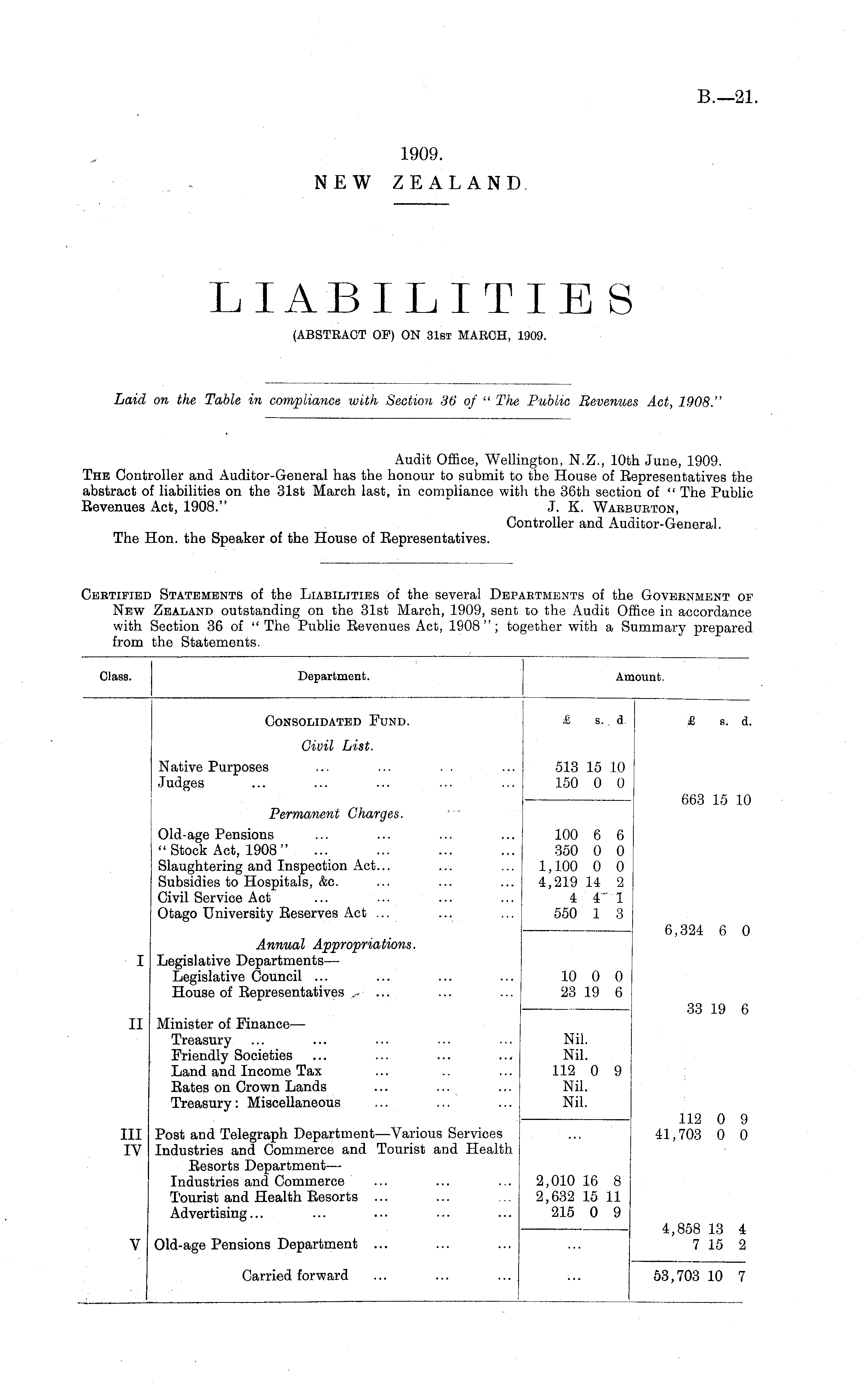 Certified Statements of the Liabilities of the several Departments of the Government of New Zealand outstanding on the 31st March, 1909, sent to the Audit Office in accordance with Section 36 of "The Public Revenues Act, 1908"; together with a Summary prepared from the Statements.
