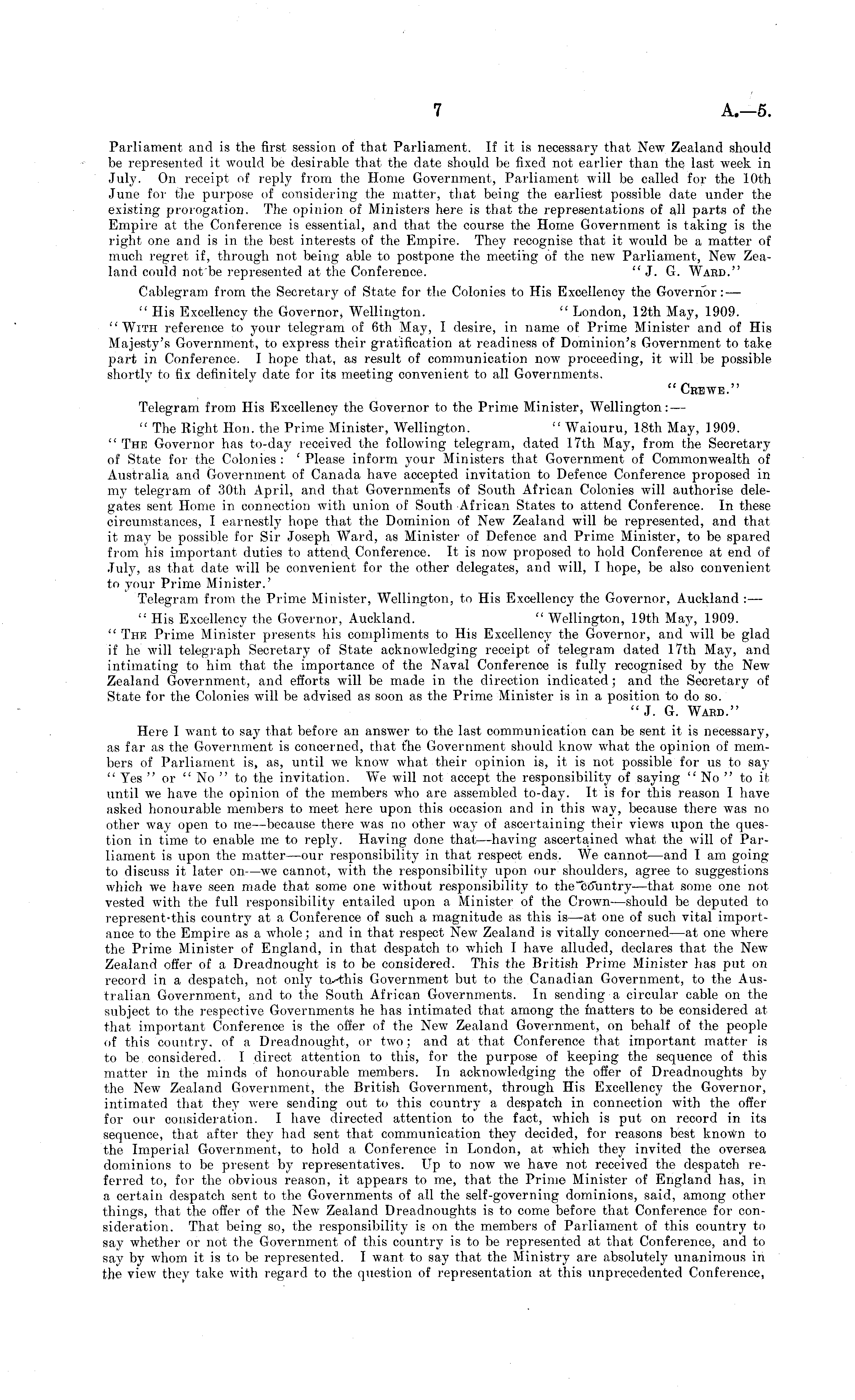 Parliament and is the first session of that Parliament. If it is necessary that New Zealand should be represented it would be desirable that the date should be fixed not earlier than the last week in July. On receipt of reply from the Home Government, Parliament will be called for the 10th June for tlie purpose of considering the matter, that being the earliest possible date under the existing prorogation. The opinion of Ministers here is that the representations of all parts of the Empire at the Conference is essential, and that the course the Home Government is taking is the right one and is in the best interests of the Empire. They recognise that it would be a matter of much regret if, through not being able to postpone the meeting of the new Parliament, New Zealand could notbe represented at the Conference. "J. G. Ward." Cablegram from the Secretary of State for the Colonies to His Excellency the Governor: — " His Excellency the Governor, Wellington. " London, 12th May, 1909. " With reference to your telegram of 6th May, I desire, in name of Prime Minister and of His Majesty's Government, to express their gratification at readiness of Dominion's Government to take part in Conference. I hope that, as result of communication now proceeding, it will be possible shortly to fix definitely date for its meeting convenient to all Governments. "Crewe." Telegram from His Excellency the Governor to the Prime Minister, Wellington: — " The Right Hon. the Prime Minister, Wellington. " Waiouru, 18th May, 1909. " The Governor has to-day received the following telegram, dated 17th May, from the Secretary of State for the Colonies : ' Please inform your Ministers that Government of Commonwealth of Australia and Government of Canada have accepted invitation to Defence Conference proposed in my telegram of 30th April, and that Governments of South African Colonies will authorise delegates sent Home in connection with union of South African States to attend Conference. In these circumstances, I earnestly hope that the Dominion of New Zealand will be represented, and that it may be possible for Sir Joseph Ward, as Minister of Defence and Prime Minister, to be spared from his important duties to attend. Conference. It is now proposed to hold Conference at end of July, as that date will be convenient for the other delegates, and will, I hope, be also convenient to your Prime Minister.' Telegram from the Prime Minister, Wellington, to His Excellency the Governor, Auckland : — " His Excellency the Governor, Auckland. " Wellington, 19th May, 1909. " The Prime Minister presents his compliments to His Excellency the Governor, and will be glad if he will telegraph Secretary of State acknowledging receipt of telegram dated 17th May, and intimating to him that the importance of the Naval Conference is fully recognised by the New Zealand Government, and efforts will be made in the direction indicated; and the Secretary of State for the Colonies will be advised as soon as the Prime Minister is in a position to do so. "J. G. Ward." Here I want to say that before an answer to the last communication can be sent it is necessary, as far as the Government is concerned, that the Government should know what the opinion of members of Parliament is, as, until we know what their opinion is, it is not possible for us to say " Yes "or"No "to the invitation. We will not accept the responsibility of saying "No"to it until we have the opinion of the members who are assembled to-day. It is for this reason I have asked honourable members to meet here upon this occasion and in this way, because there was no other way open to me —because there was no other way of ascertaining their views upon the question in time to enable me to reply. Having done that —having ascertained what the will of Parliament is upon the matter —our responsibility in that respect ends. We cannot —and I am going to discuss it later on —we cannot, with the responsibility upon our shoulders, agree to suggestions which we have seen made that some one without responsibility to the country —that some one not vested with the full responsibility entailed upon a Minister of the Crown —should be deputed to represent-this country at a Conference of such a magnitude as this is—at one of such vital importance to the Empire as a whole; and in that respect New Zealand is vitally concerned—at one where the Prime Minister of England, in that despatch to which I have alluded, declares that the New Zealand offer of a Dreadnought is to be considered. This the British Prime Minister has put on record in a despatch, not only Government but to the Canadian Government, to the Australian Government, and to the South African Governments. In sending a circular cable on the subject to the respective Governments he has intimated that among the matters to be considered at that important Conference is the offer of the New Zealand Government, on behalf of the people of this country, of a Dreadnought, or two; and at that Conference that important matter is to be considered. I direct attention to this, for the purpose of keeping the sequence of this matter in the minds of honourable members. In acknowledging the offer of Dreadnoughts by the New Zealand Government, the British Government, through His Excellency the Governor, intimated that they were sending out to this country a despatch in connection with the offer for our consideration. I have directed attention to the fact, which is put on record in its sequence, that after they had sent that communication they decided, for reasons best known to the Imperial Government, to hold a Conference in London, at which they invited the oversea dominions to be present by representatives. Up to now we have not received the despatch referred to, for the obvious reason, it appears to me, that the Prime Minister of England has, in a certain despatch sent to the Governments of all the self-governing dominions, said, among other things,