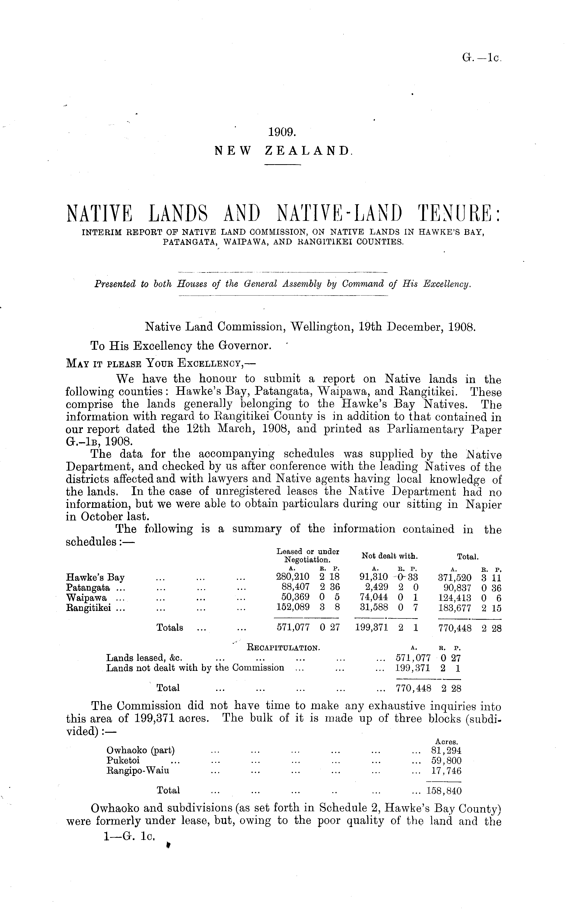 Native Land Commission, Wellington, 19th December, 1908. To His Excellency the Governor. May it please Your Excellency,— We have the honour to submit a report on Native lands in the following counties : Hawke's Bay, Patangata, Waipawa, and Eangitikei. These comprise the lands generally belonging to the Hawke's Bay Natives. The information with regard to Eangitikei County is in addition to that contained in our report dated the 12th March, 1908, and printed as Parliamentary Paper G.-Ib, 1908. The data for the accompanying schedules was supplied by the Native Department, and checked by us after conference with the leading Natives of the districts affected and with lawyers and Native agents having local knowledge of the lands. In the case of unregistered leases the Native Department had no information, but we were able to obtain particulars during our sitting in Napier in October last. The following is a summary of the information contained in the schedules: — Leased or under XT . , .. ... m, , Negotiation. Not dealfc wlth ' Total - Hawke's Bay ... ... ... 280,210 218 91,310 033 371,520 311 Patangata ... ... ... ... 88,407 2 36 2,429 2 0 90,837 0 36 Waipawa ... ... ... ... 50,369 0 5 74,044 0 1 124,413 0 6 Eangitikei 152,089 3 8 31,588 0 7 183,677 2 15 Totals ... ... 571,077 027 199,371 2 1 770,448 228 Becapitulation. a. r. p. Lands leased, &c. ... ... ... ... ... 571,077 027 Lands not dealt with by the Commission ... ... ... 199,371 2 1 Total ... ... ... ... ... 770,448 228 The Commission did not have time to make any exhaustive inquiries into this area of 199,371 acres. The bulk of it is made up of three blocks (subdivided) :— Owhaoko (part) ... ... ... ... ... ... 81,294 Puketoi ... ... ... ... ... ... ... 59,800 Eangipo-Waiu ... ... ... ... ... ... 17,746 Total ... ... ... .. ... ... 158,840 Owhaoko and subdivisions (as set forth in Schedule 2, Hawke's Bay County) were formerly under lease, but, owing to the poor quality of the land and the