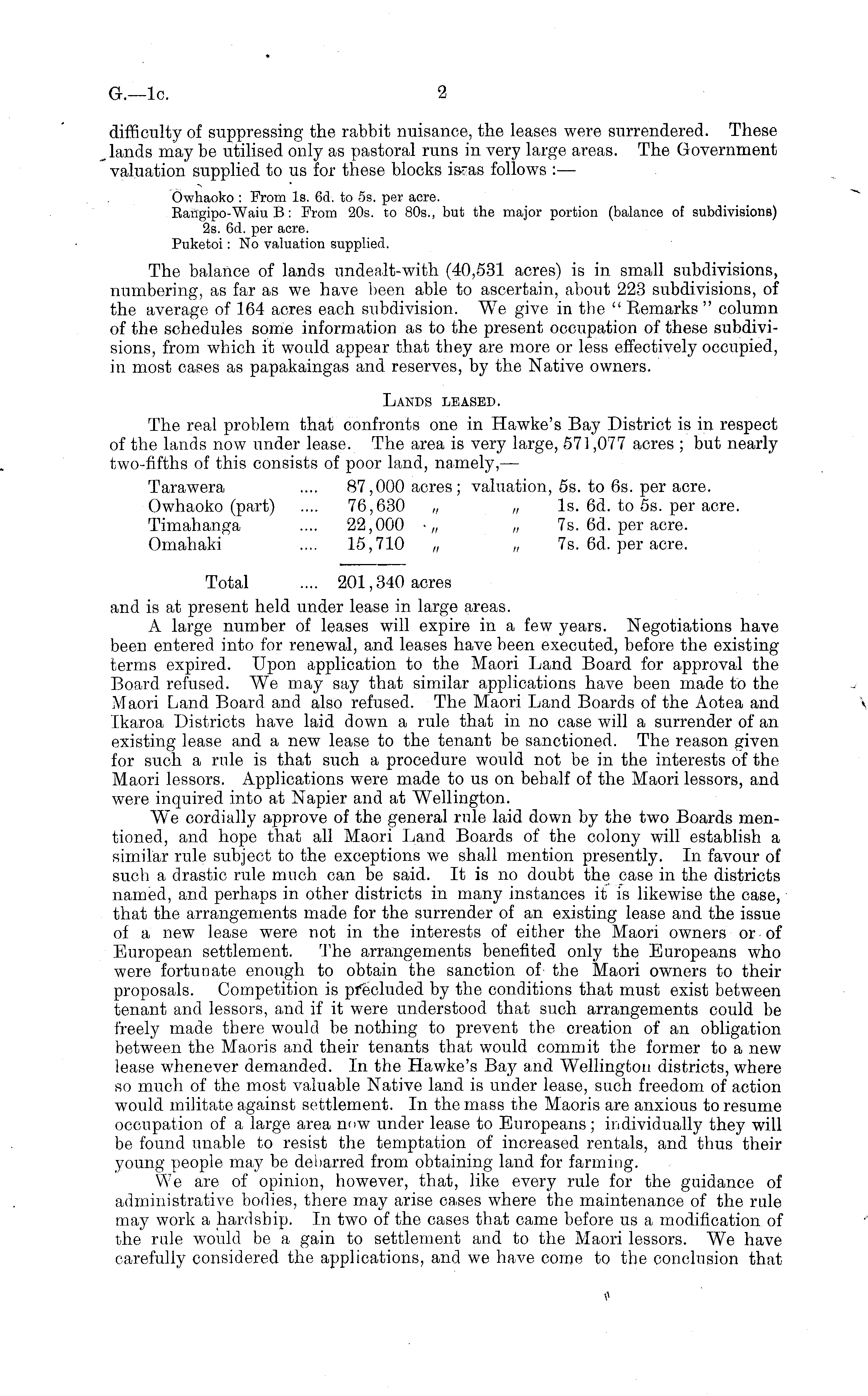 difficulty of suppressing the rabbit nuisance, the leases were surrendered. These lands may be utilised only as pastoral runs in very large areas. The Government valuation supplied to us for these blocks issas follows : — Owhaoko : From Is. 6d. to ss. per acre. Bangipo-Warn B: Prom 20s. to 80s., but the major portion (balance of subdivisions) 2s. 6d. per acre. Puketoi: No valuation supplied. The balance of lands undealt-with (40,531 acres) is in small subdivisions, numbering, as far as we have been able to ascertain, about 223 subdivisions, of the average of 164 acres each subdivision. We give in the " Bemarks " column of the schedules some information as to the present occupation of these subdivisions, from which it would appear that they are more or less effectively occupied, in most cases as papakaingas and reserves, by the Native owners. Lands leased. The real problem that confronts one in Hawke's Bay District is in respect of the lands now under lease. The area is very large, 571,077 acres ; but nearly two-fifths of this consists of poor land, namely,— Tarawera .... 87,000 acres; valuation, ss. to 6s. per acre. Owhaoko (part) .... 76,630 „ „ Is. 6d. to ss. per acre. Timahanga .... 22,000 • „ „ 7s. 6d. per acre. Omahaki .... 15,710 „ „ 7s. 6d. per acre. Total .... 201,340 acres and is at present held under lease in large areas. A large number of leases will expire in a few years. Negotiations have been entered into for renewal, and leases have been executed, before the existing terms expired. Upon application to the Maori Land Board for approval the Board refused. We may say that similar applications have been made to the Maori Land Board and also refused. The Maori Land Boards of the Aotea and Ikaroa Districts have laid down a rule that in no case will a surrender of an existing lease and a new lease to the tenant be sanctioned. The reason given for such a rule is that such a procedure would not be in the interests of the Maori lessors. Applications were made to us on behalf of the Maori lessors, and were inquired into at Napier and at Wellington. We cordially approve of the general rule laid down by the two Boards mentioned, and hope that all Maori Land Boards of the colony will establish a similar rule subject to the exceptions we shall mention presently. In favour of such a drastic rule much can be said. It is no doubt the case in the districts named, and perhaps in other districts in many instances it is likewise the case, that the arrangements made for the surrender of an existing lease and the issue of a new lease were not in the interests of either the Maori owners or of European settlement. The arrangements benefited only the Europeans who were fortunate enough to obtain the sanction of the Maori owners to their proposals. Competition is precluded by the conditions that must exist between tenant and lessors, and if it were understood that such arrangements could be freely made there would be nothing to prevent the creation of an obligation between the Maoris and their tenants that would commit the former to a new lease whenever demanded. In the Hawke's Bay and Wellington districts, where so much of the most valuable Native land is under lease, such freedom of action would militate against settlement. In the mass the Maoris are anxious to resume occupation of a large area now under lease to Europeans; individually they will be found unable to resist the temptation of increased rentals, and thus their young people may be debarred from obtaining land for fanning. We are of opinion, however, that, like every rule for the guidance of administrative bodies, there may arise cases where the maintenance of the rule may work a hardship. In two of the cases that came before us a modification of the rule would be a gain to settlement and to the Maori lessors. We have carefully considered the applications, and we have come to the conclusion that 4
