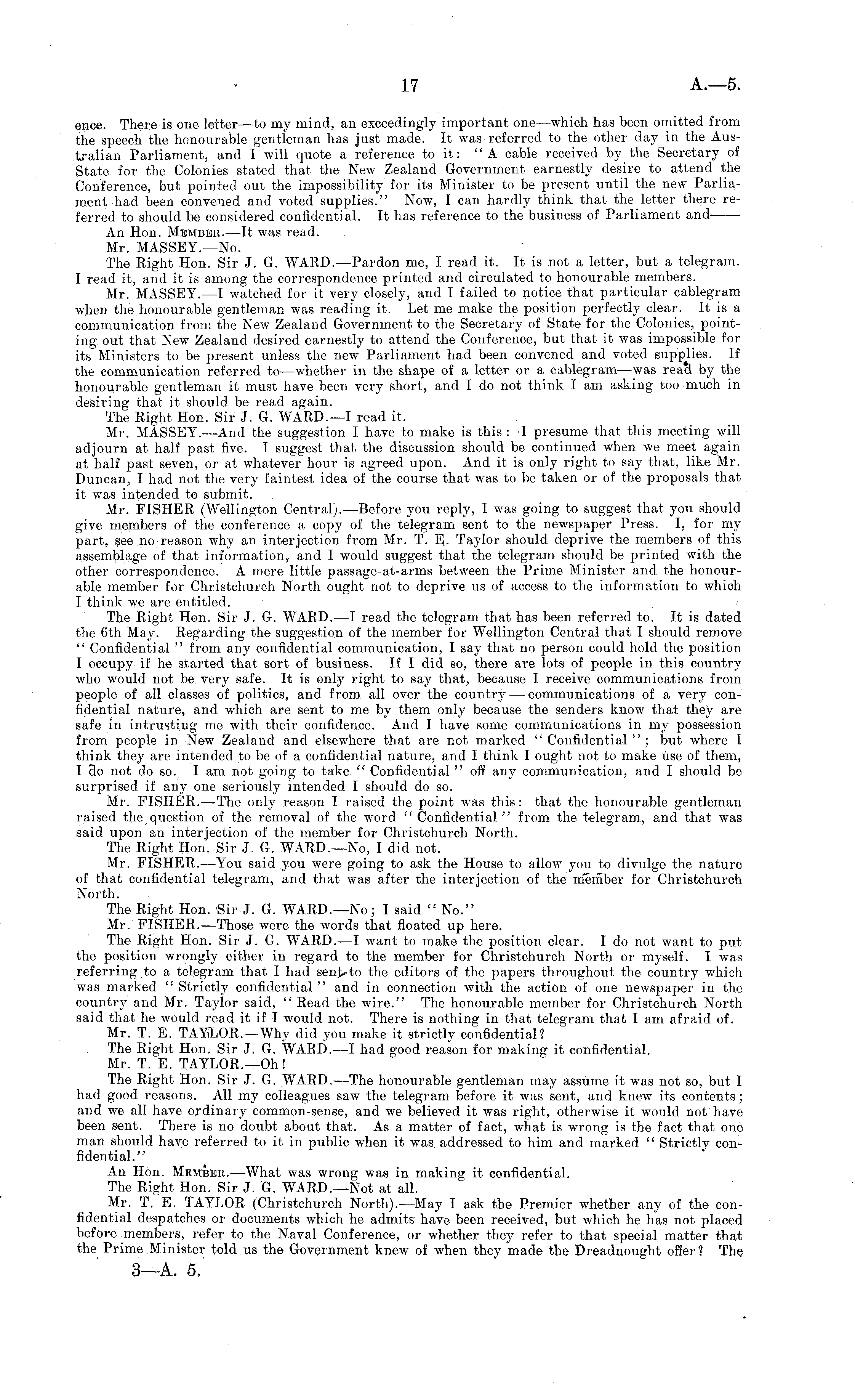 enoe. There is one letter —to my mind, an exceedingly important one —which has been omitted from the speech the honourable gentleman has just made. It was referred to the other day in the Australian Parliament, and I will quote a reference to it: "A cable received by the Secretary of State for the Colonies stated that the New Zealand Government earnestly desire to attend the Conference, but pointed out the impossibility for its Minister to be present until the new Parliament had been convened and voted supplies." Now, I can hardly think that the letter there referred to should be considered confidential. It has reference to the business of Parliament and An Hon. Member.—lt was read. Mr. MASSEY.—No. The Right Hon. Sir J. G. WARD. —Pardon me, I read it. It is not a letter, but a telegram. I read it, and it is among the correspondence printed and circulated to honourable members. Mr. MASSEY. —I watched for it very closely, and I failed to notice that particular cablegram when the honourable gentleman was reading it. Let me make the position perfectly clear. It is a communication from the New Zealand Government to the Secretary of State for the Colonies, pointing out that New Zealand desired earnestly to attend the Conference, but that it was impossible for its Ministers to be present unless the new Parliament had been convened and voted supplies. If the communication referred to —whether in the shape of a letter or a cablegram—was reau by the honourable gentleman it must have been very short, and I do not think I am asking too much in desiring that it should be read again. The Right Hon. Sir J. G. WARD.—I read it. Mr. MASSEY.—And the suggestion I have to make is this : I presume that this meeting will adjourn at half past five. I suggest that the discussion should be continued when we meet again at half past seven, or at whatever hour is agreed upon. And it is only right to say that, like Mr. Duncan, I had not the very faintest idea of the course that was to be taken or of the proposals that it was intended to submit. Mr. FISHER (Wellington Central). —Before you reply, I was going to suggest that you should give members of the conference a copy of the telegram sent to the newspaper Press. I, for my part, see no reason why an interjection from Mr. T. E- Taylor should deprive the members of this assemblage of that information, and I would suggest that the telegram should be printed with the other correspondence. A mere little passage-at-arms between the Prime Minister and the honourable member for Christchurch North ought not to deprive us of access to the information to which I think we are entitled. The Right Hon. Sir J. G. WARD. —I read the telegram that has been referred to. It is dated the 6th May. Regarding the suggestion of the member for Wellington Central that I should remove " Confidential " from any confidential communication, I say that no person could hold the position I occupy if he started that sort of business. If I did so, there are lots of people in this country who would not be very safe. It is only right to say that, because I receive communications from people of all classes of politics, and from all over the country — communications of a very confidential nature, and which are sent to me by them only because the senders know that they are safe in intrusting me with their confidence. And I have some communications in my possession from people in New Zealand and elsewhere that are not marked "Confidential"; but where I think they are intended to be of a confidential nature, and I think I ought not to make use of them, Ido not do so. lam not going to take " Confidential " off any communication, and I should be surprised if any one seriously intended I should do so. Mr. FISHER. —The only reason I raised the point was this: that the honourable gentleman raised the question of the removal of the word " Confidential " from the telegram, and that was said upon an interjection of the member for Christchurch North. The Right Hon. Sir J. G. WARD.—No, I did not. Mr. FISHER. —You said you were going to ask the House to allow you to divulge the nature of that confidential telegram, and that was after the interjection of the member for Christchurch North. The Right Hon. Sir J. G. WARD.—No; I said " No." Mr. FISHER.—Those were the words that floated up here. The Right Hon. Sir J. G. WARD.—I want to make the position clear. Ido not want to put the position wrongly either in regard to the member for Christchurch North or myself. I was referring to a telegram that I had senj>to the editors of the papers throughout the country which was marked " Strictly confidential " and in connection with the action of one newspaper in the country and Mr. Taylor said, "Read the wire." The honourable member for Christchurch North said that he would read it if I would not. There is nothing in that telegram that lam afraid of. Mr. T. E. TAYiLOR.—Why did you make it strictly confidential? The Right Hon. Sir J. G. WARD.—I had good reason for making it confidential. Mr. T. E. TAYLOR.—Oh! The Right Hon. Sir J. G. WARD. —The honourable gentleman may assume it was not so, but I had good reasons. All my colleagues saw the telegram before it was sent, and knew its contents; and we all have ordinary common-sense, and we believed it was right, otherwise it would not have been sent. There is no doubt about that. As a matter of fact, what is wrong is the fact that one man should have referred to it in public when it was addressed to him and marked " Strictly confidential." An Hon. Member.—What was wrong was in making it confidential. The Right Hon. Sir J. G. WARD.—Not at all. Mr. T. E. TAYLOR (Christchurch North). —May I ask the Premier whether any of the confidential despatches or documents which he admits have been received, but which he has not placed before members, refer to the Naval Conference, or whether they refer to that special matter that the Prime Minister
