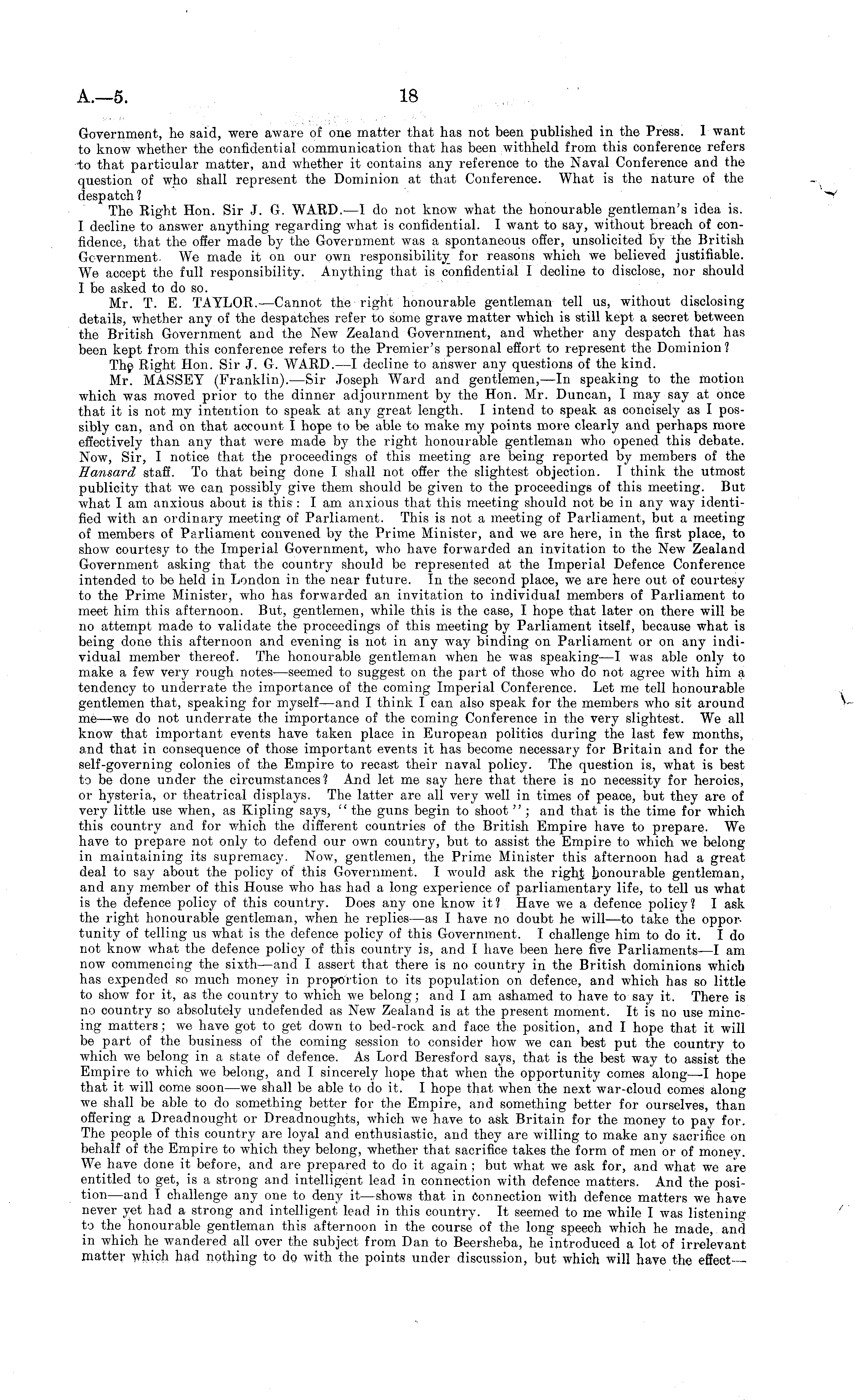 Government, he said, were aware of one matter that has not been published in the Press. I want to know whether the confidential communication that has been withheld from this conference refers ■■to that particular matter, and whether it contains any reference to the Naval Conference and the question of who shall represent the Dominion at that Conference. What is the nature of the despatch? The Right Hon. Sir J. G. WARD. —I do not know what the honourable gentleman's idea is. I decline to answer anything regarding what is confidential. I want to say, without breach of confidence, that the offer made by the Government was a spontaneous offer, unsolicited by the British Government. We made it on our own responsibility for reasons which we believed justifiable. We accept the full responsibility. Anything that is confidential I decline to disclose, nor should 1 be asked to do so. Mr. T. E. TAYLOR. —Cannot the right honourable gentleman tell us, without disclosing details, whether any of the despatches refer to some grave matter which is still kept a secret between the British Government and the New Zealand Government, and whether any despatch that has been kept from this conference refers to the Premier's personal effort to represent the Dominion? The Right Hon. Sir J. G. WARD.—I decline to answer any questions of the kind. Mr. MASSEY (Franklin). —Sir Joseph Ward and gentlemen,—ln speaking to the motion which was moved prior to the dinner adjournment by the Hon. Mr. Duncan, I may say at once that it is not my intention to speak at any great length. I intend to speak as concisely as I possibly can, and on that account I hope to be able to make my points more clearly and perhaps more effectively than any that were made by the right honourable gentleman who opened this debate. Now, Sir, I notice that the proceedings of this meeting are being reported by members of the Hansard staff. To that being done I shall not offer the slightest objection. I think the utmost publicity that we can possibly give them should be given to the proceedings of this meeting. But what I am anxious about is this : I am anxious that this meeting should not be in any way identified with an ordinary meeting of Parliament. This is not a meeting of Parliament, but a meeting of members of Parliament convened by the Prime Minister, and we are here, in the first place, to show courtesy to the Imperial Government, who have forwarded an invitation to the New Zealand Government asking that the country should be represented at the Imperial Defence Conference intended to be held in London in the near future. In the second place, we are here out of courtesy to the Prime Minister, who has forwarded an invitation to individual members of Parliament to meet him this afternoon. But, gentlemen, while this is the case, I hope that later on there will be no attempt made to validate the proceedings of this meeting by Parliament itself, because what is being done this afternoon and evening is not in any way binding on Parliament or on any individual member thereof. The honourable gentleman when he was speaking—l was able only to make a few very rough notes —seemed to suggest on the part of those who do not agree with him a tendency to underrate the importance of the coming Imperial Conference. Let me tell honourable gentlemen that, speaking for myself—and I think I can also speak for the members who sit around me —we do not underrate the importance of the coming Conference in the very slightest. We all know that important events have taken place in European politics during the last few months, and that in consequence of those important events it has become necessary for Britain and for the self-governing colonies of the Empire to recast their naval policy. The question is, what is best to be done under the circumstances? And let me say here that there is no necessity for heroics, or hysteria, or theatrical displays. The latter are all very well in times of peace, but they are of very little use when, as Kipling says, " the guns begin to shoot " ; and that is the time for which this country and for which the different countries of the British Empire have to prepare. We have to prepare not only to defend our own country, but to assist the Empire to which we belong in maintaining its supremacy. Now, gentlemen, the Prime Minister this afternoon had a great deal to say about the policy of this Government. I would ask the right honourable gentleman, and any member of this House who has had a long experience of parliamentary life, to tell us what is the defence policy of this country. Does any one know it? Have we a defence policy? I ask the right honourable gentleman, when he replies—as I have no doubt he will—to take the opportunity of telling us what is the defence policy of this Government. I challenge him to do it. Ido not know what the defence policy of this country is, and I have been here five Parliaments—l am now commencing the sixth—and I assert that there is no country in the British dominions which has expended so much money in proportion to its population on defence, and which has so little to show for it, as the country to which we belong; and lam ashamed to have to say it. There is no country so absolutely undefended as New Zealand is at the present moment. It is no use mincing matters; we have got to get down to bed-rock and face the position, and I hope that it will be part of the business of the coming session to consider how we can best put the country to which we belong in a state of defence. As Lord Beresford says, that is the best way to assist the Empire to which we belong, and I sincerely hope that when the opportunity comes along—l hope that it will come soon —we shall be able to do it. I hope that when the next war-cloud comes along we shall be able to do something better for the Empire, and something better for ourselves, than offering a Dreadnought or Dreadnoughts, which we have to ask B
