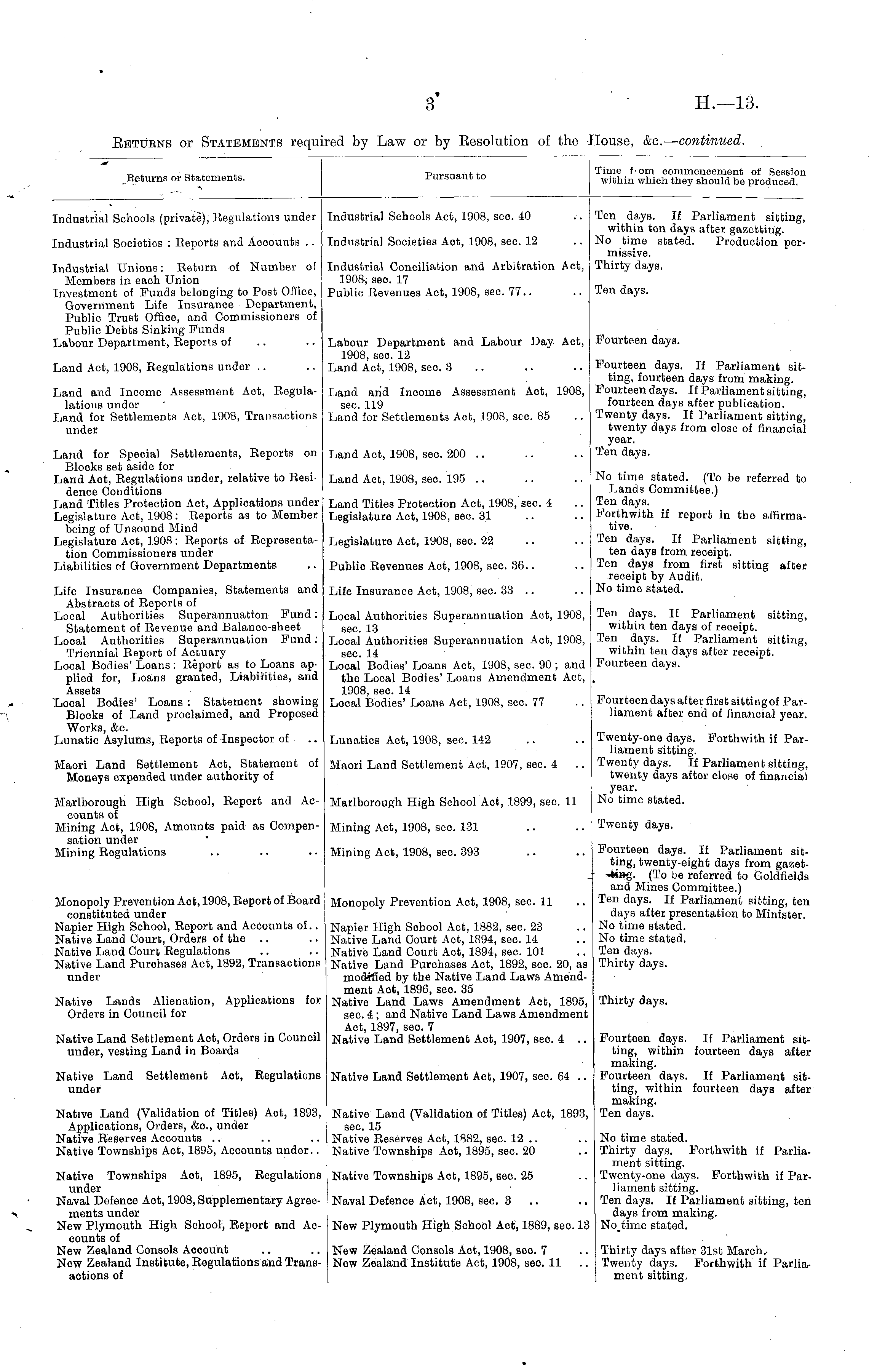 Returns or Statements. Pursuant to Time torn commencement ol Session within which they should be produced. Industrial Schools (private), Regulations under Industrial Schools Act, 1908, sec. 40 Ten days. If Parliament sitting, within ten days after gazetting. No time stated. Production permissive. Thirty days. Industrial Societies : Reports and Accounts .. Industrial Societies Aot, 1908, sec. 12 Industrial Unions: Return of Number of Members in each Union Investment of Funds belonging to Post Office, Government Life Insurance Department, Public Trust Office, and Commissioners of Public Debts Sinking Funds Labour Department, Reports of Industrial Conciliation and Arbitration Act, 1908, sec. 17 Public Revenues Act, 1908, sec. 77.. Ten days. Labour Department and Labour Day Act, 1908, seo. 12 Land Act, 1908, sec. 3 Fourteen days. Land Act, 1908, Regulations under Land and Income Assessment Act, Regulalations under Land for Settlements Act, 1908, Transactions under Land arid Income Assessment Act, 1908, sec. 119 Land for Settlements Act, 1908, sec. 85 Fourteen days. If Parliament sitting, fourteen days from making. Fourteen days. If Parliament sitting, fourteen days after publication. Twenty days. If Parliament sitting, twenty days from close of financial Land for Special Settlements, Reports on Blocks set aside for Land Act, Regulations under, relative to Residence Conditions Land Titles Protection Act, Applications under Legislature Act, 1908 : Reports as to Member being of Unsound Mind Legislature Act, 1908: Reports of Representation Commissioners under Liabilities of Government Departments Land Aot, 1908, sec. 200 .. year. Ten days. Land Act, 1908, sec. 195 .. No time stated. (To be referred to Lands Committee.) Ten days. Forthwith if report in the affirmative. Ten days. If Parliament sitting, ten days from receipt. Ten days from first sitting after receipt by Audit. No time stated. Land Titles Protection Act, 1908, sec. 4 Legislature Act, 1908, sec. 31 Legislature Act, 1908, sec. 22 Public Revenues Act, 1908, sec. 36.. Life Insurance Companies, Statements and Abstracts of Reports of Local Authorities Superannuation Fund: Statement of Revenue and Balance-sheet Local Authorities Superannuation Fund: Triennial Report of Actuary Local Bodies' Loans: Report as to Loans applied for, Loans granted, Liabilities, and Assets Local Bodies' Loans : Statement showing Blocks of Land proclaimed, and Proposed Works, &o. Lunatic Asylums, Reports of Inspector of Life Insurance Act, 1908, seo. 33 .. Local Authorities Superannuation Act, 1908, sec. 13 Local Authorities Superannuation Act, 1908, sec. 14 Local Bodies' Loans Act, 1908, sec. 90; and the Local Bodies' Loans Amendment Act, 1908, sec. 14 Local Bodies' Loans Act, 1908, sec. 77 Ten days. If Parliament sitting, within ten days of receipt. Ten days. If Parliament sitting, within ten days after receipt. Fourteen days. Fourteen days after first sittingof Parliament after end of financial year. Lunatics Act, 1908, sec. 142 Twenty-one days. Forthwith if Parliament sitting. Twenty days. If Parliament sitting, twenty days after close of financial year. No time stated. Maori Land Settlement Act, Statement of Moneys expended under authority of Maori Land Settlement Act, 1907, sec. 4 Marlborough High School, Report and Accounts of Mining Act, 1908, Amounts paid as Compensation under Mining Regulations Marlborough High School Aofc, 1899, sec. 11 Mining Act, 1908, sec. 131 Twenty days. Monopoly Prevention Act, 1908, Report of Board constituted under Napier High School, Report and Accounts of.. Native Land Court, Orders of the Native Land Court Eegulations Native Land Purchases Act, 1892, Transactions under Mining Act, 1908, sec. 393 Monopoly Prevention Act, 1908, sec. 11 Fourteen days. If Parliament sitting, twenty-eight days from gazetJg. (To be referred to Goldfields and Mines Committee.) Ten days. If Parliament sitting, ten days after presentation to Minister. No time stated. No time stated. Ten days. Thirty days. Napier High School Act, 1882, sec. 23 Native Land Court Act, 1894, sec. 14 Native Land Court Act, 1894, sec. 101 Native Land Purchases Act, 1892, sec. 20, as modified by the Native Land Laws Amendment Act, 1896, sec. 35 Native Land Laws Amendment Act, 1895, sec. 4 ; and Native Land Laws Amendment Act, 1897, seo. 7 Native Land Settlement Act, 1907, sec. & . . Thirty days. Native Lands Alienation, Applications for Orders in Council for Native Land Settlement Act, Orders in Council under, vesting Land in Boards Native Land Settlement Aot, Regulations under Native Land Settlement Act, 1907, sec. 64 .. Fourteen days. If Parliament sitting, within fourteen days after making. Fourteen days. If Parliament sitting, within fourteen days after making. Ten days. Native Land (Validation of Titles) Act, 1893, Applications, Orders, &c, under Native Reserves Accounts Native Townships Act, 1895, Accounts under.. Native Land (Validation of Titles) Act, 1893, seo. 15 Native Reserves Act, 1882, sec. 12 .. Native Townships Act, 1895, sec. 20 No time stated. Thirty days. Forthwith if Parliament sitting. Twenty-one days. Forthwith if Parliament sitting. Ten days. If Parliament sitting, ten days from making. No_tiine stated. Native Townships Act, 1895, Regulations under Naval Defence Act, 1908, Supplementary Agreements under New Plymouth High School, Report and Accounts of New Zealand Consols Account New Zealand Institute, Regulations and Transaotions of Native Townships Act, 1895, sec. 25 Naval Defence Act, 1908, sec. 3 New Plymouth High School Act, 1889, seo. 13 New Zealand Consols Act, 1908, seo. 7 New Zealand Institute Aot, 1908, seo. 11 Thirty days after 31st March.Twenty days. Forthwith if Parliament sitting,