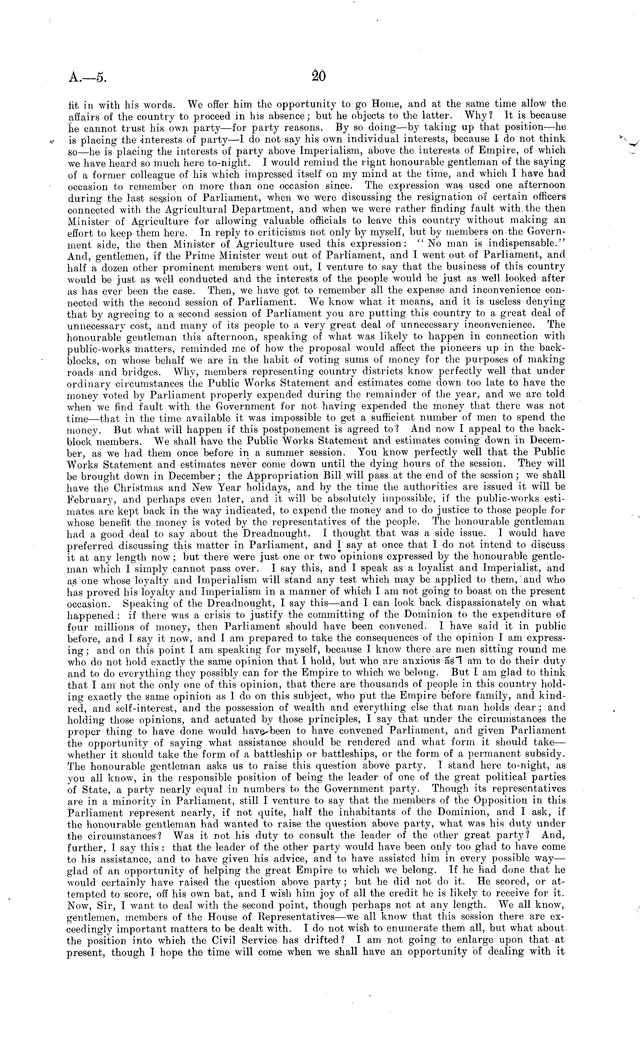 fit in with his words. We offer him the opportunity to go Home, and at the same time aliow the affairs of the country to proceed in his absence; but he objects to the latter. Why? It is because ho cannot trust his own party — for party reasons. By so doing—by taking up that position —he is placing the interests of party —I do not say his own individual interests, because Ido not think so —jj e is placing the interests of party above Imperialism, above the interests of Empire, of which we have heard so much here to-night. I would remind the rigiit honourable gentleman of the saying of a former colleague of his which impressed itself on my mind at the time, and which I have had occasion to remember on more than one occasion since. The expression was used one afternoon during the last session of Parliament, when we were discussing the resignation of certain officers connected with the Agricultural Department, and when we were rather finding fault with, the then Minister of Agriculture for allowing valuable officials to leave this country without making an effort to keep them here. In reply to criticisms not only by myself, but by members on the Government side, the then Minister of Agriculture used this expression: "No man is indispensable." And, gentlemen, if the Prime Minister went out of Parliament, and I went out of Parliament, and half a dozen other prominent members went out, I venture to say that the business of this country would be just as well conducted and the interests of the people would be just as well looked after as has ever been the case. Then, we have got to remember all the expense and inconvenience connected with the second session of Parliament. We know what it means, and it is useless denying that by agreeing to a second session of Parliament you are putting this country to a great deal of unnecessary cost, and many of its people to a very great deal of unnecessary inconvenience. The honourable gentleman this afternoon, speaking of what was likely to happen in connection with public-works matters, reminded me of how the proposal would affect the pioneers up in the backblocks, on whose behalf we are in the habit of voting sums of money for the purposes of making roads and bridges. Why, members representing country districts know perfectly well that under ordinary circumstances the Public Works Statement and estimates come down too late to have the money voted by Parliament properly expended during the remainder of the year, and we are told when we find fault with the Government for not having expended the money that there was not time —that in the time available it was impossible to get a sufficient number of men to spend the mouev. But what will happen if this postponement is agreed to? And now I appeal to the backblock members. We shall have the Public Works Statement and estimates coining down in December, as we had them once before in a summer session. You know perfectly well that the Public Works Statement and estimates never come down until the dying hours of the session. They will be brought down in December; the Appropriation Bill will pass at the end of the session; we shall have the Christmas and New Year holidays, and by the time the authorities are issued it will be February, and perhaps even later, and it will be absolutely impossible, if the public-works estimates are kept back in the way indicated, to expend the money and to do justice to those people for whose benefit the money is voted by the representatives of the people. The honourable gentleman had a good deal to say about the Dreadnought. I thought that was a side issue. I would have preferred discussing this matter in Parliament, and I say at once that I do not intend to discuss it at any length now; but there were just one or two opinions expressed by the honourable gentleman which I simply cannot pass over. I say this, and I speak as a loyalist and Imperialist, and as one whose loyalty and Imperialism will stand any test which may be applied to them, and who has proved his loyalty and Imperialism in a manner of which I am not going to boast on the present occasion. Speaking of the Dreadnought, I say this —and I can look back dispassionately on what happened : if there was a crisis to justify the committing of the Dominion to the expenditure of four millions of money, then Parliament should have been convened. I have said it in public before, and I say it now, and I am prepared to take the consequences of the opinion I am expressing ; and on this point I am speaking for myself, because I know there are men sitting round me who do not hold exactly the same opinion that I hold, but who are anxious us 1 am to do their duty and to do everything they possibly can for the Empire to which we belong. But lam glad to think that I am not the only one of this opinion, that there are thousands of people in this country holding exactly the same opinion as I do on this subject, who put the Empire before family, and kindred, and self-interest, and the possession of wealth and everything else that man holds dear; and holding those opinions, and actuated by those principles, I say that under the circumstances the proper thing to have done would to have convened Parliament, and given Parliament the opportunity of saying what assistance should be rendered and what form it should take — whether it should take the form of a battleship or battleships, or the form of a permanent subsidy. The honourable gentleman asks us to raise this question above party. I stand here to-night, as you all know, in the responsible position of being the leader of one of the great political parties of State, a party nearly equal in numbers to the Government party. Though its representatives are in a minority in Parliament, still I venture to say that the members of the Opposition in this Parliament represent nearly, if not quite, half the inhabitants of the Dominion, and I ask, if the honourable gentleman had wanted to rais