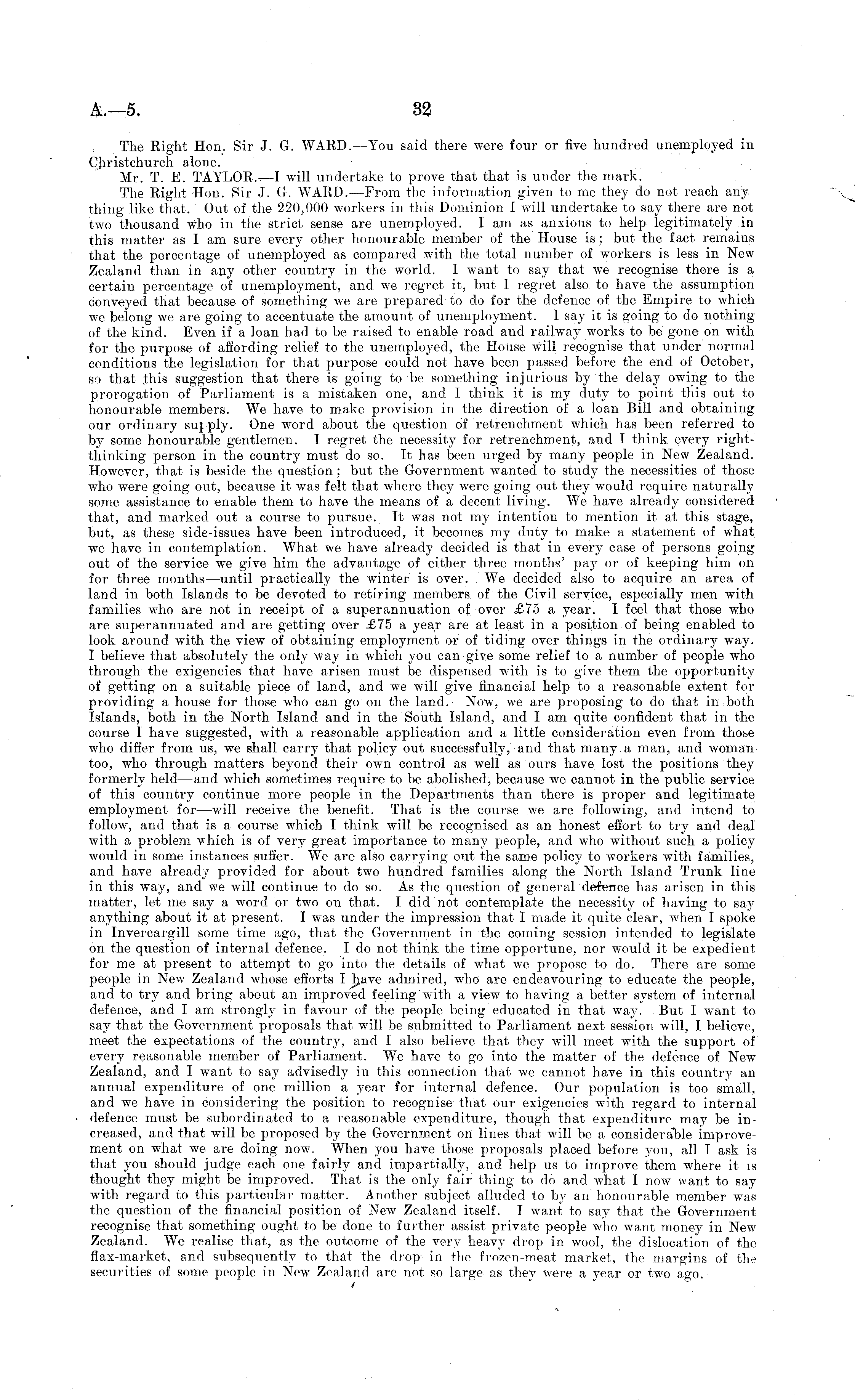 The Right Hon. Sir J. G. WARD. —You said there were four or five hundred unemployed in Christchurch alone. Mr. T. E. TAYLOR. —I will undertake to prove that that is under the mark. The Right Hon. Sir J. G, WARD. —From the information given to me they do not reach any tiling like that. Out of the 220,000 workers in this Dominion 1 will undertake to say there are not two thousand who in the strict sense are unemployed. I am as anxious to help legitimately in this matter as I am sure every other honourable member of the House is; but the fact remains that the percentage of unemployed as compared with the total number of workers is less in New Zealand than in any other country in the world. I want to say that we recognise there is a certain percentage of unemployment, and we regret it, but I regret also to have the assumption conveyed that because of something we are prepared to do for the defence of the Empire to which we belong we are going to accentuate the amount of unemployment. I say it is going to do nothing of the kind. Even if a loan had to be raised to enable road and railway works to be gone on with for the purpose of affording relief to the unemployed, the House will recognise that under normal conditions the legislation for that purpose could not have been passed before the end of October, so that ,this suggestion that there is going to be something injurious by the delay owing to the prorogation of Parliament is a mistaken one, and 1 think it is my duty to point this out to honourable members. We have to make provision in the direction of a loan Bill and obtaining our ordinary suj ply. One word about the question of retrenchment which has been referred to by some honourable gentlemen. I regret the necessity for retrenchment, and I think every rightthinking person in the country must do so. It has been urged by many people in New Zealand. However, that is beside the question; but the Government wanted to study the necessities of those who were going out, because it was felt that where they were going out they would require naturally some assistance to enable them to have the means of a decent living. We have already considered that, and marked out a course to pursue. It was not my intention to mention it at this stage, but, as these side-issues have been introduced, it becomes my duty to make a statement of what we have in contemplation. What we have already decided is that in every case of persons going out of the service we give him the advantage of either three months' paj r or of keeping him on for three months—until practically the winter is over. We decided also to acquire an area of land in both Islands to be devoted to retiring members of the Civil service, especially men with families who are not in receipt of a superannuation of over £75 a year. I feel that those who are superannuated and are getting over £75 a year are at least in a position of being enabled to look around with the view of obtaining employment or of tiding over things in the ordinary way. I believe that absolutely the only way in which you can give some relief to a number of people who through the exigencies that have arisen must be dispensed with is to give them the opportunity of getting on a suitable piece of land, and we will give financial help to a reasonable extent for providing a house for those who can go on the land. Now, we are proposing to do that in both Islands, both in the North Island and in the South Island, and I am quite confident that in the course I have suggested, with a reasonable application and a little consideration even from those who differ from us, we shall carry that policy out successfully, and that many a man, and woman too, who through matters beyond their own control as well as ours have lost the positions they formerly held—and which sometimes require to be abolished, because we cannot in the public service of this country continue more people in the Departments than there is proper and legitimate employment for—will receive the benefit. That is the course we are following, and intend to follow, and that is a course which I think will be recognised as an honest effort to try and deal with a problem which is of very great importance to man}? people, and who without such a policy would in some instances suffer. We are also carrying out the same policy to workers with families, and have already provided for about two hundred families along the North Island Trunk line in this way, and we will continue to do so. As the question of general defence has arisen in this matter, let me say a word or two on that. I did not contemplate the necessity of having to say anything about it at present. I was under the impression that I made it quite clear, when I spoke in Invercargill some time ago, that the Government in the coming session intended to legislate on the question of internal defence. Ido not think the time opportune, nor would it be expedient for me at present to attempt to go into the details of what we propose to do. There are some people in New Zealand whose efforts I .have admired, who are endeavouring to educate the people, and to try and bring about an improved feeling with a view to having a better system of internal defence, and lam strongly in favour of the people being educated in that way. But I want to say that the Government proposals that will be submitted to Parliament next session will, I believe, meet the expectations of the country, and I also believe that the}' will meet with the support of every reasonable member of Parliament. We have to go into the matter of the defence of New Zealand, and I want to say advisedly in this connection that we cannot have in this country an annual expenditure of one million a year for internal defence. Our population is too small, and we have in considering the position to recognise that our exigencies with regard to internal defence must be subordinated to a reasonable expenditure, though that expenditure 