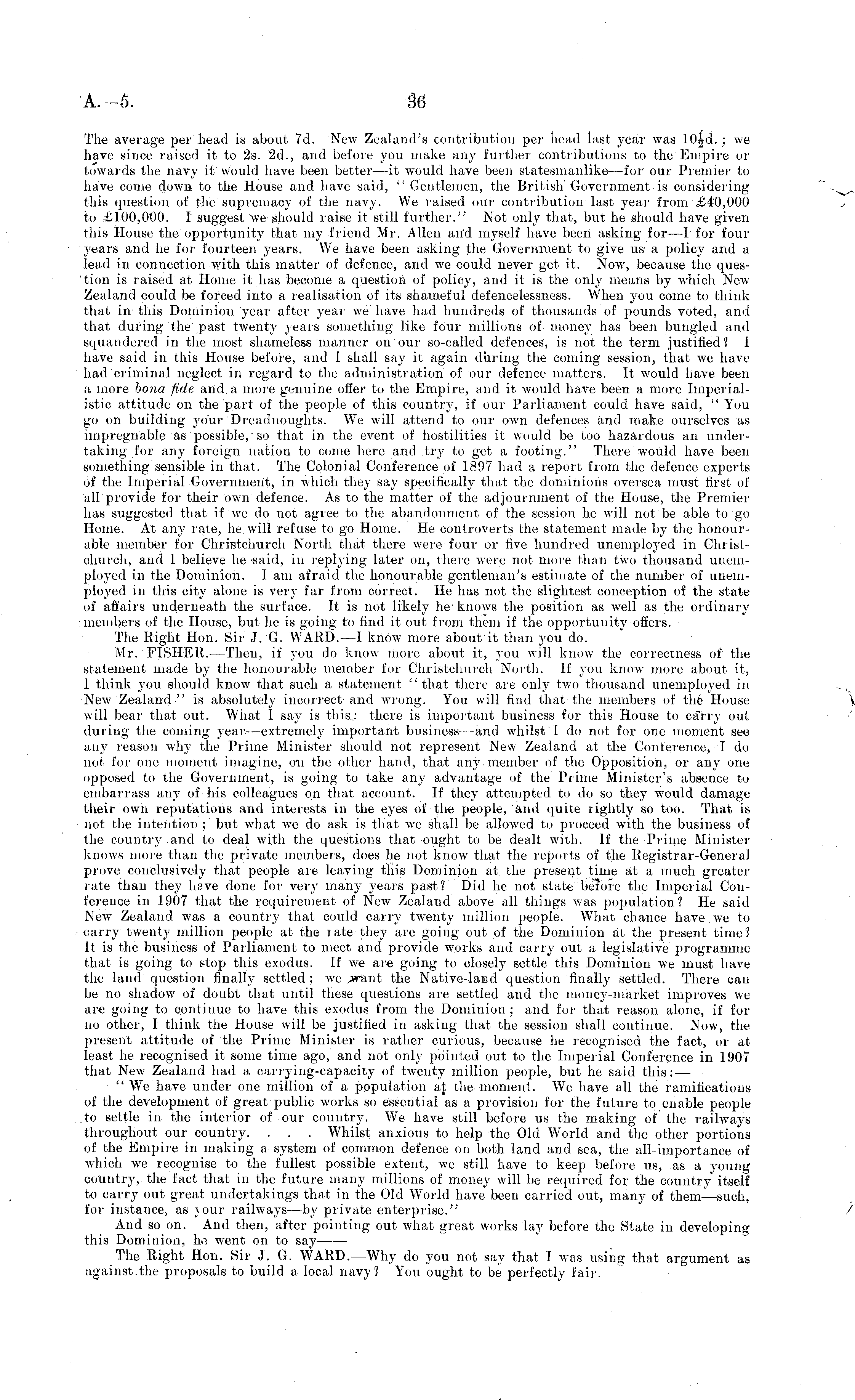 The average per head is about 7d. New Zealand's contribution per head last year was 10|d. ; we have since raised it to 2s. 2d., and before you make any further contributions to the Empire or towards the navy it would have been better—it would have been statesmanlike — for our Premier to have come down to the House and have said, " Gentlemen, the British' Government is considering Iliis question of the supremacy of the navy. We raised our contribution last year from £40,000 to £100,000. I suggest we-should raise it still further." Not only that, but he should have given this House the opportunity that my friend Mr. Allen and myself have been asking for—l for four years and he for fourteen years. We have been asking the Government to give us a policy and a lead in connection with this matter of defence, and we could never get it. Now, because the question is raised at Home it has become a question of policy, and it is the only means by which New Zealand could be forced into a realisation of its shameful defencelessness. When you come to think that in this Dominion year after year we have had hundreds of thousands of pounds voted, and that during the past twenty years something like four millions of money has been bungled and squandered in the most shameless manner on our so-called defences, is not the term justified? 1 have said in this House before, and I shall say it again during the coming session, that we have had criminal neglect in regard to the administration of our defence matters. It would have been a more boaa fide and a more genuine offer to the Empire, and it would have been a more Imperialistic attitude on the part of the people of this country, if our Parliament could have said, " You go on building your Dreadnoughts. We will attend to our own defences and make ourselves as impregnable as possible, so that in the event of hostilities it would be too hazardous an undertaking for anj- foreign nation to come here and try to get a footing." There -would have been something sensible in that. The Colonial Conference of 1897 had a report from the defence experts of the Imperial Government, in which they say specifically that the dominions oversea must first of all provide for their own defence. As to the matter of the adjournment of the House, the Premier has suggested that if we do not agree to the abandonment of the session he will not be able to go Home. At any rate, he will refuse to go Home. He controverts the statement made by the honourable member for Christchureh North that there were four or five hundred unemployed in Christchurch, and I believe he said, in replying later on, there were not more than two thousand unemployed in the Dominion. lam afraid the honourable gentleman's estimate of the number of unemployed in this city alone is very far from correct. He has not the slightest conception of the state of affairs underneath the surface. It is not likely he knows the position as well as the ordinary members of the House, but he is going , to find it out from them if the opportunity offers. The Right Hon. Sir J. G. WARD.—I know more about it than you do. Mr. FISHER.—Then, if you do know more about it, you will know the correctness of the statement made by the honourable member for Christchuroh North. If you know more about it, I think you should know that such a statement "that there are only two thousand unemployed in New Zealand " is absolutely incorrect and wrong. You will find that the members of the House will bear that out. What I sa) f is this.: there is important business for this House to carry out during the coming year —extremely important business —and whilst I do not for one moment see any reason why the Prime Minister should not represent New Zealand at the Conference, I do not for one moment imagine, oil the other hand, that any member of the Opposition, or any one opposed to the Government, is going to take any advantage of the Prime Minister's absence to embarrass any of his colleagues on that account. If they attempted to do so they would damage their own reputations and interests in the eyes of the people, and quite rightly so too. That is not the intention ; but what we do ask is that we shall be allowed to proceed with the business of the country and to deal with the questions that ought to be dealt with. If the Prime Minister knows more than the private members, does he not know that the reports of the Registrar-General prove conclusively that people are leaving this Dominion at the present time at a much greater rate than they have done for very many years past? Did he not state before the Imperial Conference in 1907 that the requirement of New Zealand above all things was population? He said New Zealand was a country that could carry twenty million people. What chance have we to carry twenty million people at the i ate they are going out of the Dominion at the present time? It is the business of Parliament to meet and provide works and carry out a legislative programme that is going to stop this exodus. If we are going to closely settle this Dominion we must have the land question finally settled; we .jwaut the Native-land question finally settled. There can be no shadow of doubt that until these questions are settled and the money-market improves we are going to continue to have this exodus from the Dominion ; and for that reason alone, if for no other, 1 think the House will be justified in asking that the session shall continue. Now, the present attitude of the Prime Minister is rather curious, because he recognised the fact, or at least he recognised it some time ago, and not only pointed out to the Imperial Conference in 1907 that New Zealand had a carrying-capacity of twenty million people, but he said this: — "We have under one million of a population af the moment. We have all the ramifications of the development of great public works so essential as a provision for the future to enable people to settle in the interior of 