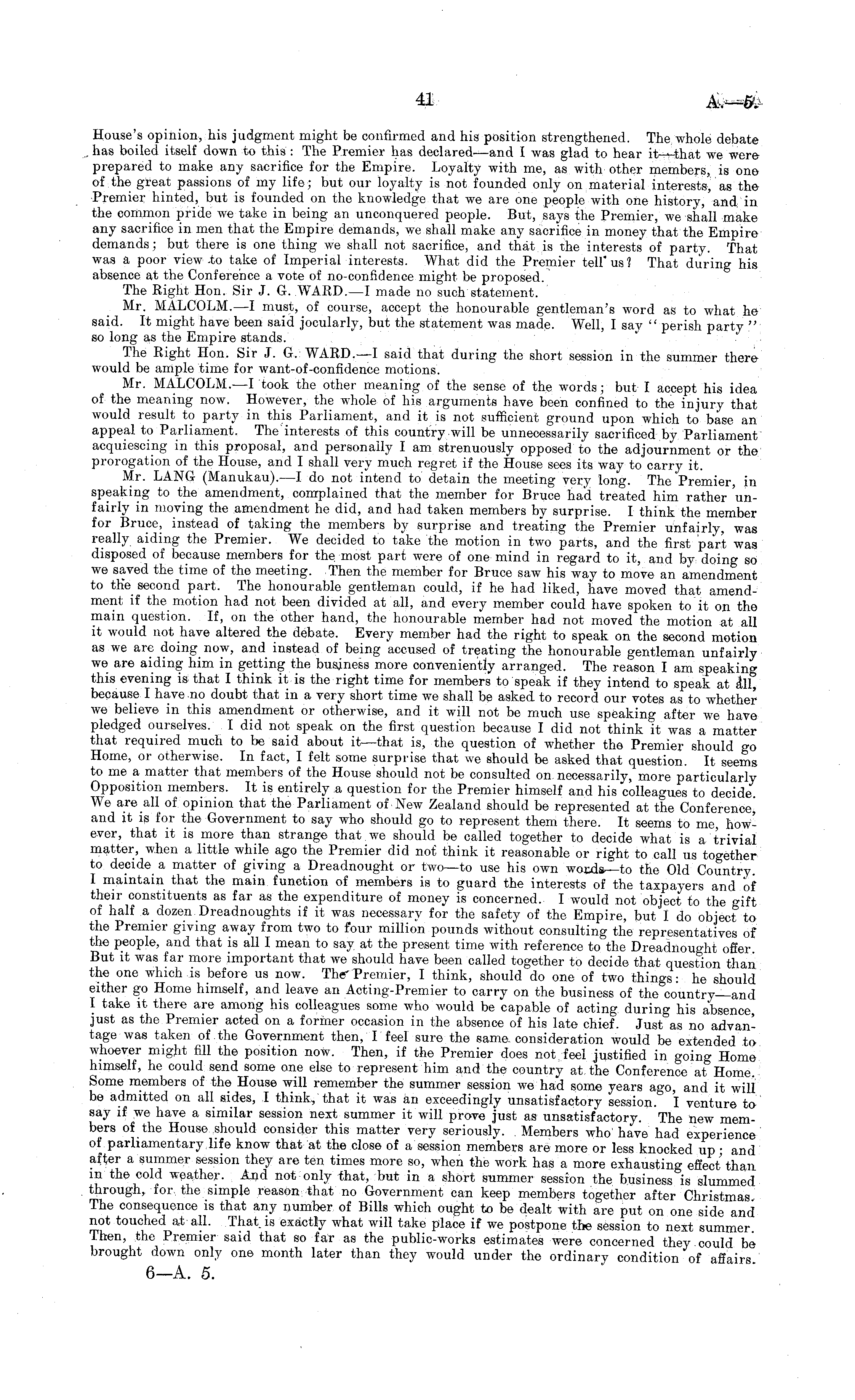 House's opinion, his judgment might be confirmed and his position strengthened. The whole debate has boiled itself down to this : The Premier has declared—and I was glad to hear it—that we were prepared to make any sacrifice for the Empire. Loyalty with me, as with other members, is on© of the great passions of my life; but our loyalty is not founded only on material interests, as the Premier hinted, but is founded on the knowledge that we are one people with one history, and in the common pride we take in being an unconquered people. But, says the Premier, we shall make any sacrifice in men that the Empire demands, we shall make any sacrifice in money that the Empire demands; but there is one thing we shall not sacrifice, and that is the interests of party. That was a poor view to take of Imperial interests. What did the Premier tell'us? That during his absence at the Conference a vote of no-confidence might be proposed. The Right Hon. Sir J. G. WARD.—I made no such statement. Mr. MALCOLM.—I must, of course, accept the honourable gentleman's word as to what he said. It might have been said jocularly, but the statement was made. Well, I say " perish party " so long as the Empire stands. The Right Hon. Sir J. G. WARD.—I said that during the short session in the summer therewould be ample time for want-of-confidence motions. Mr. MALCOLM.—Itook the other meaning of the sense of the words; but I accept his idea of the meaning now. However, the whole of his arguments have been confined to the injury that would result to party in this Parliament, and it is not sufficient ground upon which to base an appeal to Parliament. Theinterests of this country will be unnecessarily sacrificed by Parliament acquiescing in this proposal, and personally I am strenuously opposed to the adjournment or the prorogation of the House, and I shall very much regret if the House sees its way to carry it. Mr. LANG (Manukau).—I do not intend to detain the meeting very long. The Premier, in speaking to the amendment, complained that the member for Bruce had treated him rather 'unfairly in moving the amendment he did, and had taken members by surprise. I think the member for Bruce, instead of taking the members by surprise and treating the Premier unfairly, was really aiding the Premier. We decided to take the motion in two parts, and the first part was disposed of because members for the most part were of one mind in regard to it, and by doing so we saved the time of the meeting. Then the member for Bruce saw his way to move an amendment to the second part. The honourable gentleman could, if he had liked, have moved that amendment if the motion had not been divided at all, and every member could have spoken to it on the main question. If, on the other hand, the honourable member had not moved the motion at all it would not have altered the debate. Every member had the right to speak on the second motion as we are doing now, and instead of being accused of treating the honourable gentleman unfairly we are aiding him in getting the business more conveniently arranged. The reason lam speaking this evening is that I think it is the right time for members to speak if they intend to speak at all, because I have .no doubt that in a very short time we shall be asked to record our votes as to whether we believe in this amendment or otherwise, and it will not be much use speaking after we have pledged ourselves. I did not speak on the first question because I did not think it was a matter that required much to be said about it—that is, the question of whether the Premier should go Home, or otherwise. In fact, I felt some surprise that we should be asked that question. It seems to me a matter that members of the House should not be consulted on necessarily, more particularly Opposition members. It is entirely a question for the Premier himself and his colleagues to decide We are all of opinion that the Parliament of New Zealand should be represented at the and it is for the Government to say who should go to represent them there. It seems to me, however, that it is more than strange that we should be called together to decide what is a trivial matter, when a little while ago the Premier did noi think it reasonable or right to call us together to decide a matter of giving a Dreadnought or two—to use his own words—to the Old Country. I maintain that the main function of members is to guard the interests of the taxpayers and of their constituents as far as the expenditure of money is concerned. I would not object to the gift of half a dozen Dreadnoughts if it was necessary for the safety of the Empire, but I do object to the Premier giving away from two to four million pounds without consulting the representatives of the people, and that is all I mean to say at the present time with reference to the Dreadnought offer But it was far more important that we should have been called together to decide that question than the one which is before us now. The' Premier, I think, should do one of two things: he should either go Home himself, and leave an Acting-Premier to carry on the business of the country—and I take it there are among his colleagues some who would be capable of acting, during his absence, just as the Premier acted on a former occasion in the absence of his late chief. Just as no advantage was taken of the Government then, I feel sure the same consideration would be extended to whoever might fill the position now. Then, if the Premier does not feel justified in going Home himself, he could send some one else to represent him and the country at the Conference at Home Some members of the House will remember the summer session we had some years ago, and it wili be admitted on all sides, I think, that it was an exceedingly unsatisfactory session. I venture to say if we have a similar session next summer it will prove just as unsatisfactory. The new members of the House should consider this matter very seri