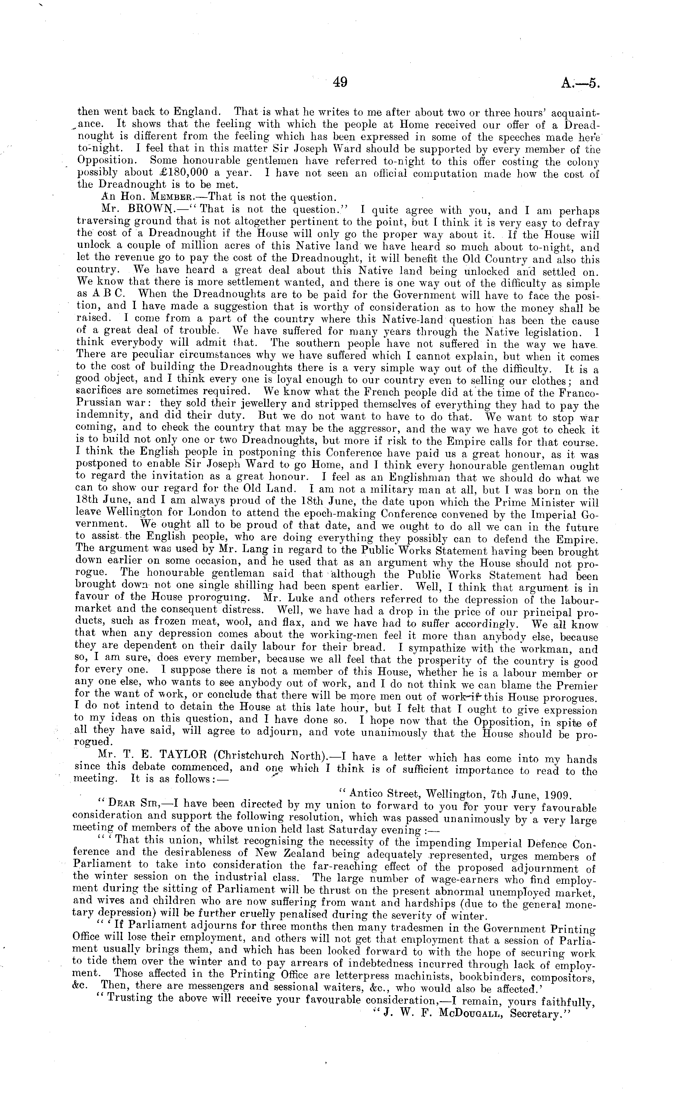 then went back to England. That is what he writes to me after about two or three hours' acquaintance. It shows that the feeling with which the people at Home received our offer of a Dreadnought is different from the feeling which has been expressed in some of the speeches made here to-night. I feel that in this matter Sir Joseph Ward should be supported by every member of the Opposition. Some honourable gentlemen have referred to-night to this offer costing the colony possibly about £180,000 a year. I have not seen an official computation made how the cost of the Dreadnought is to be met. An Hon. Member. —That is not the question. Mr. BROWN. —"That is not the question." I quite agree with you, and I am perhaps traversing ground that is not altogether pertinent to the point, but I think it is very easy to defray the cost of a Dreadnought if the House will only go the proper way about it. If the House will unlock a couple of million acres of this Native land we have heard so much about to-night, and let the revenue go to pay the cost of the Dreadnought, it will benefit the Old Country and also this country. We have heard a great deal about this Native land being unlocked and settled on. We know that there is more settlement wanted, and there is one way out of the difficulty as simple as ABC. When the Dreadnoughts are to be paid for the Government will have to face the position, and I have made a suggestion that is worthy of consideration as to how the money shall be raised. I come from a part of the country where this Native-land question has been the cause of a great deal of trouble. We have suffered for many years through the Native legislation. I think everybody will admit that. The southern people have not suffered in the way we have. There are peculiar circumstances why we have suffered which I cannot explain, but when it comes to the cost of building the Dreadnoughts there is a very simple way out of the difficulty. It is a good object, and I think every one is loyal enough to our country even to selling our clothes ; and sacrifices are sometimes required. We know what the French people did at the time of the FrancoPrussian war: they sold their jewellery and stripped themselves of everything they had to pay the indemnity, and did their duty. But we do not want to have to do that. We want to stop war and to check the country that may be the aggressor, and the way we have got to check it is to build not only one or two Dreadnoughts, but more if risk to the Empire calls for that course. I think the English people in postponing this Conference have paid us a great honour, as it was postponed to enable Sir Joseph Ward to go Home, and I think every honourable gentleman ought to regard the invitation as a great honour. I feel as an Englishman that we should do what we can to show our regard for the Old Land. lam not a military man at all, but I was born on the 18th June, and I am always proud of the 18th June, the date upon which the Prime Minister will leave Wellington for London to attend the epoch-making Conference convened by the Imperial Government. We ought all to be proud of that date, and we ought to do all we' can in the future to assist the English people, who are doing everything they possibly can to defend the Empire. The argument was used by Mr. Lang in regard to the Public Works Statement having been brought down earlier on some occasion, and he used that as an argument why the House should not prorogue. The honourable gentleman said that although the Public Works Statement had been brought down not one single shilling had been spent earlier. Well, I think that argument is in favour of the House proroguing. Mr. Luke and others referred to the depression of the labourmarket and the consequent distress. Well, we have had a drop in the price of our principal products, such as frozen meat, wool, and flax, and we have had to suffer accordingly. We all know that when any depression comes about the working-men feel it more than anybody else, because they are dependent on their daily labour for their bread. I sympathize with"the workman, and so, I am sure, does every member, because we all feel that the' prosperity of the country is good for every one. I suppose there is not a member of this House, whether he is a labour member or any one else, who wants to see anybody out of work, and I do not think we can blame the Premier for the want of work, or conclude that there will be more men out of work if this House prorogues I do not intend to detain the House at this late hour, but I felt that I ought to give expression to my ideas on this question, and I have done so. I hope now that the Opposition, in spite of all they have said, will agree to adjourn, and vote unanimously that the House should be prorogued. r _ Mr. T. E. TAYLOR (Christchurch North).—l have a letter which has come into my hands since this debate commenced, and one which I think is of sufficient importance to read to the meeting. It is as follows: — " Antico Street, Wellington, 7th June, 1909. Dear Sm, —I have been directed by my union to forward to you for your very favourable consideration and support the following resolution, which was passed' unanimously by a very large meeting of members of the above union held last Saturday evening : ' That this union, whilst recognising the necessity of the impending Imperial Defence Conference and the desirableness of New Zealand being adequately represented, urges members of Parliament to take into consideration the far-reaching effect of the proposed adjournment of the winter session on the industrial class. The large number of wage-earners who find employment during the sitting of Parliament will be thrust on the present abnormal unemployed market, and wives and children who are now suffering from want and hardships (due to the general monetary depression) will be further cruelly penalised during the severity of winter. " ' If Parliament adjourns for three months t