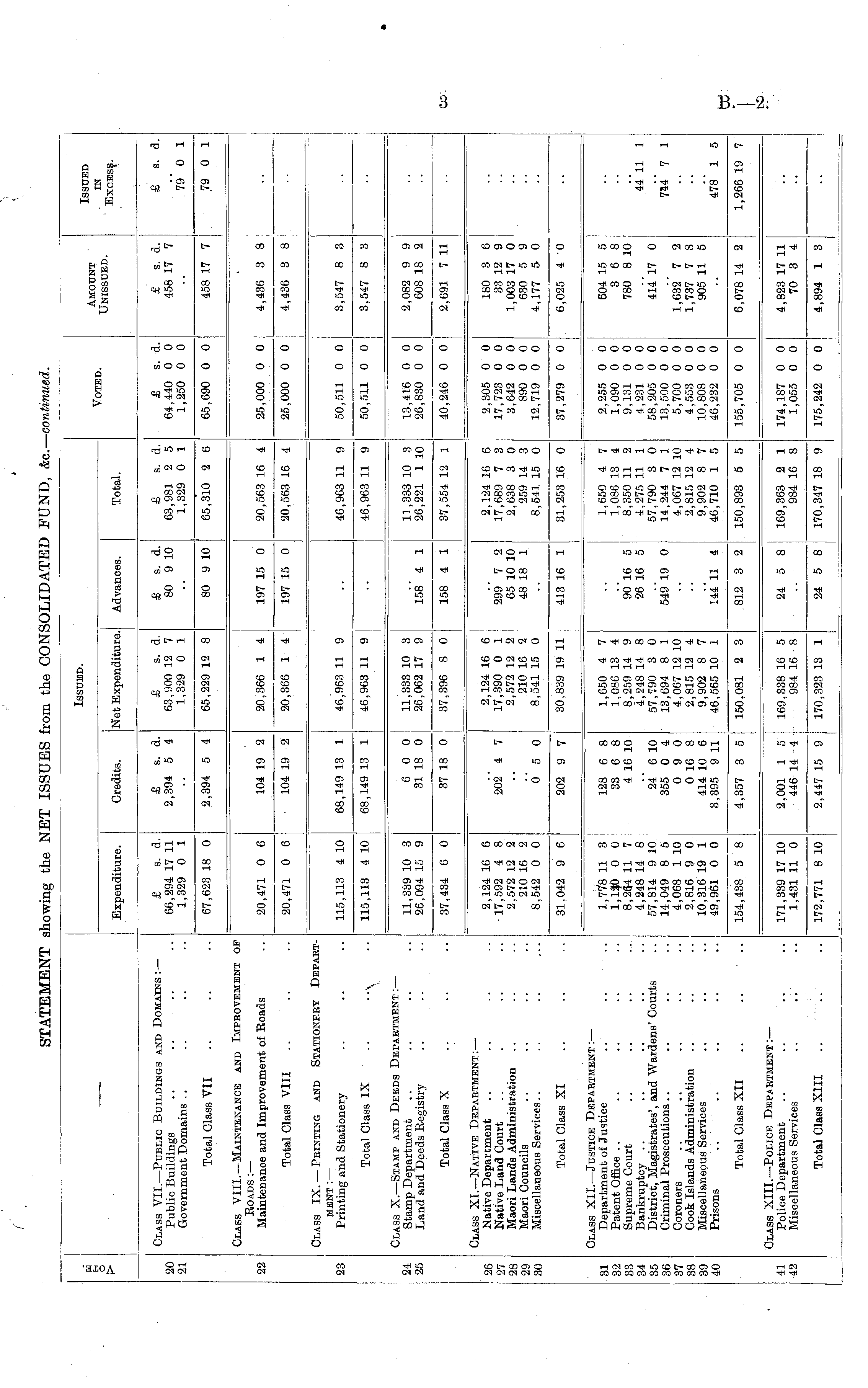 o > Expenditure. Issued. Voted. Amount ' Unissued. Issued in Excess. Credits. Net Expenditure. Advances. Total. Class VII. —Public Buildings and Domains :— Public Buildings Government Domains .. .. £ s. d. 66,294 17 11 1,329 0 1 £ s. d. 2,394 5 4 £ s. d. 63,900 12 7 1,329 0 1 £ s. d. 80 9 10 £ s. d. 63,981 2 5 1,329 0 1 £ s. d. 64,440 0 0 1,250 0 0 £ s. d. 458 17 7 £ s. d. 20 21 79 0 1 Total Class VII 67,623 18 0 2,394 5 4 65,229 12 8 80 9 10 65,310 2 6 65,690 0 0 458 17 7 79 0 1 Class VIII. —Maintenance and Improvement of Roads :— Maintenance and Improvement of Roads 4,436 3 8 22 20,471 0 6 104 19 2 20,366 1 4 197 15 0 20,563 16 4 25,000 0 0 Total Class VIII 20,471 0 6 104 19 2 20,366 1 4 197 15 0 20,563 16 4 25,000 0 0 4,436 3 8 Class IX. — Printing and Stationery Department :— Printing and Stationery 23 115,113 4 10 68,149 13 1 46,963 11 9 46,963 11 9 50,511 0 0 3,547 8 3 Total Class IX .. 115,113 4 10 68,149 13 1 46,963 11 9 46,963 11 9 50,511 0 0 3,547 8 3 24 25 Class X. —Stamp and Deeds Department :— Stamp Department Land and Deeds Registry 11,339 10 3 26,094 15 9 6 0 0 31 18 0 11,333 10 3 26,062 17 9 11,333 10 3 26,221 1 10 37,554 12 1 13,416 0 0 26,830 0 0 2,082 9 9 608 18 2 158' 4 1 Total Class X 37,434 6 0 37 18 0 37,396 8 0 158 4 1 40,246 0 0 2,691 7 11 26 27 28 30 Class XI. —Native Department: — Native Department Native Land Court Maori Lands Administration Maori Councils Miscellaneous Services.. 2,124 16 6 17,592 4 8 2,572 12 2 210 16 2 8,542 0 0 202 4 7 2,124 16 6 17,390 0 1 2,572 12 2 210 16 2 8,541 15 0 299 7 2 65 10 10 48 18 1 2,124 16 6 17,689 7 3 2,638 3 0 259 14 3 8,541 15 0 2,305 0 0 17,723 0 0 3,642 0 0 890 0 0 12,719 0 0 180 3 6 33 12 9 1,003 17 0 630 5 9 4,177 5 0 0 5 0 Total Class XI 31,042 9 6 202 9 7 30.839 19 11 413 16 1 31,253 16 0 37,279 0 0 6,025 4 0 31 32 33 34 35 36 37 38 39 40 Class XII. —Justice Department: — Department of Justice Patent Office Supreme Court Bankruptcy District, Magistrates', and Wardens' Courts Criminal Prosecutions Coroners Cook Islands Administration Miscellaneous Services Prisons 1,778 11 3 1,120 0 0 8,264 11 7 4,248 14 8 57,814 9 10 14,049 8 5 4,068 1 10 2,816 9 0 10,316 19 1 49,961 0 0 128 6 8 33 6 8 4 16 10 24 6 10 355 0 4 0 9 0 0 16 8 414 10 6 3,395 9 11 1,650 4 7 1,086 13 4 8,259 14 9 4,248 14 8 57,790 3 0 13,694 8 1 4,067 12 10 2,815 12 4 9,902 8 7 46,565 10 1 9016 5 26 16 5 549 19 0 1,650 4 7 1,086 13 4 8,350 11 2 4,275 11 1 57,790 3 0 14,244 7 1 4,067 12 10 2,815 12 4 9,902 8 7 46,710 1 5 2,255 0 0 1,090 0 0 9,131 0 0 4,231 0 0 58,205 0 0 13,500 0 0 5,700 0 0 4,553 0 0 10,808 0 0 46,232 0 0 604 15 5 3 6 8 780 8 10 414 17 0 44 11 1 744 7 1 1,632 7 2 1,737 7 8 905 11 5 144 11 4 478 1 5 Total Class XII .. .. 154,438 5 8 4,357 3 5 150,081 2 3 812 3 2 150,893 5 5 155,705 0 0 6,078 14 2 1,266 19 7 41 42 Class XIII. —Police Department :— Police Department Miscellaneous Services 171,339 17 10 1,431 11 0 2,001 1 5 446 14 4 169,338 16 5 984 16 8 24 5 8 i 169,363 2 1 984 16 8 174,187 0 0 1,055 0 0 4,823 17 11 70 3 4 Total Class XIII 172,771 8 10 2,447 15 9 170,323 13 1 24 5 8 170,347 18 9 175,242 0 0 4,894 1 3