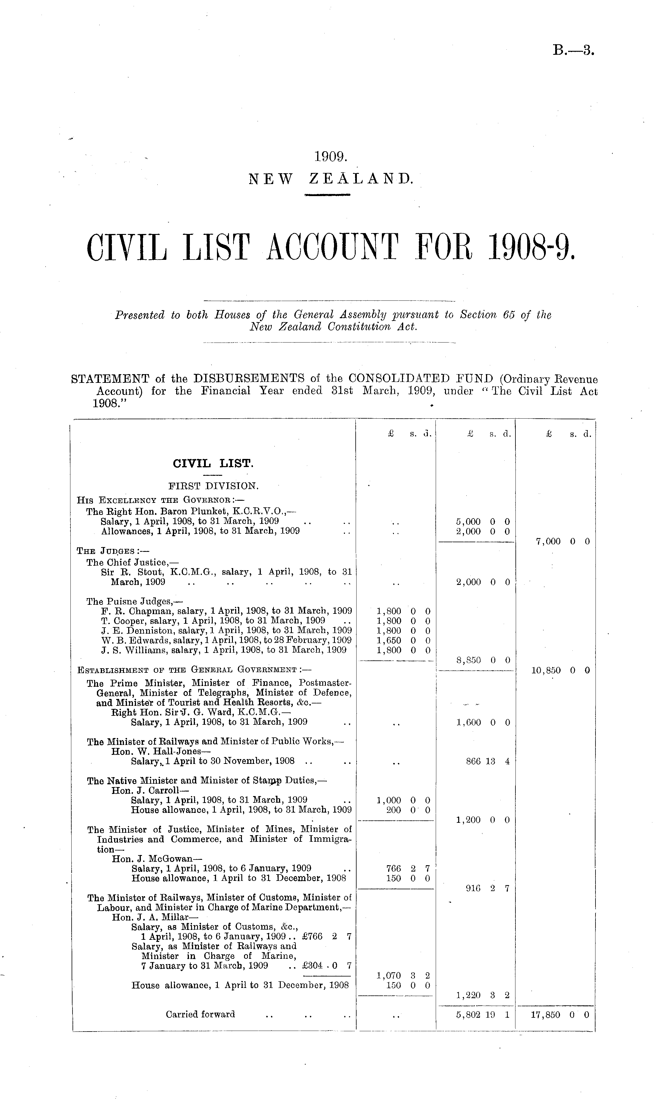 £ S. d. £ s. d. £ s. d. CIVIL LIST. FIRST DIVISION. Etis Excellency the Govebnob:— The Right Hon. Baron Plunket, K.C.R.V.O.,— Salary, 1 April, 1908, to 31 March, 1909 Allowances, 1 April, 1908, to 31 March, 1909 5,000 0 0 2,000 0 0 Che Judges:— The Chief Justice, — Sir R. Stout, K.C.M.G., salary, 1 April, 1908, to 31 March, 1909 .. 7,000 0 0 The Puisne Judges,— F. R. Chapman, salary, 1 April, 1908, to 31 March, 1909 T. Cooper, salary, 1 April, 1908, to 31 March, 1909 J. E. Denniston, salary, 1 April, 1908, to 31 March, 1909 W. B. Edwards, salary, 1 April, 1908, to 28 February, 1909 J. S. Williams, salary, 1 April, 1908, to 31 March, 1909 1,800 0 0 1,800 0 0 1,800 0 0 1,650 0 0 1,800 0 0 2,000 0 0 8,850 0 0 Establishment of the Genebal Government ; — 10,850 0 0 The Prime Minister, Minister of Finance, PostmasterGeneral, Minister of Telegraphs, Minister of Defence, and Minister of Tourist and Health Resorts, &c.— Right Hon. Sir-J. G. Ward, K.C.M.G.— Salary, 1 April, 1908, to 31 March, 1909 1,600 0 0 The Minister of Railways and Minister of Public Works, — Hon. W. Hall-Jones— Salary,.! April to 30 November, 1908 .. 866 13 4 The Native Minister and Minister of Stam-p Duties, — Hon. J. Carroll — Salary, 1 April, 1908, to 31 March, 1909 House allowance, 1 April, 1908, to 31 March, 1909 1,000 0 0 200 0 0 1,200 0 0 The Minister of Justice, Minister of Mines, Minister of Industries and Commerce, and Minister of Immigration — Hon. J. McGowan— Salary, 1 April, 1908, to 6 January, 1909 House allowance, 1 April to 31 December, 1908 766 2 7 150 0 0 910 2 7 The Ministor of Railways, Minister of Customs, Minister of Labour, and Minister in Charge of Marine Department,— Hon. J. A. MillarSalary, as Minister of Customs, &c, 1 April, 1908, to 6 January, 1909 .. £766 2 7 Salary, as Minister of Railways and Minister in Charge of Marine, 7 January to 31 March, 1909 .. £304 0 7 House allowance, 1 April to 31 December, 1908 1,070 3 2 150 0 0 1,220 3 2 Carried forward 5,802 19 1 17,850 0 0