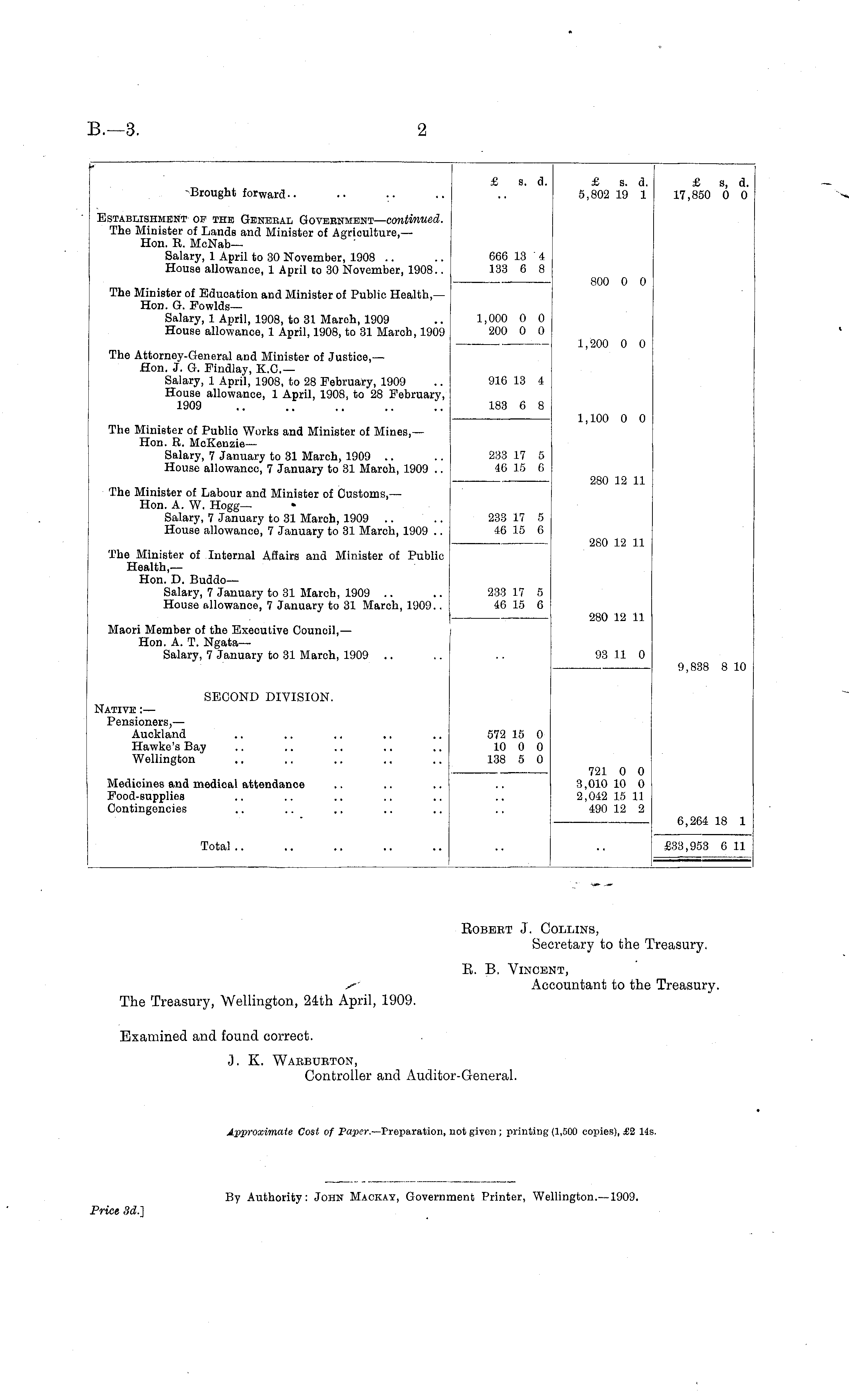 Eobbrt J. Collins, Secretary to the Treasury. E. B. Vincent, Accountant to the Treasury. The Treasury, Wellington, 24th April, 1909. Examined and found correct. 0. K. Warburton, Controller and Auditor-General.