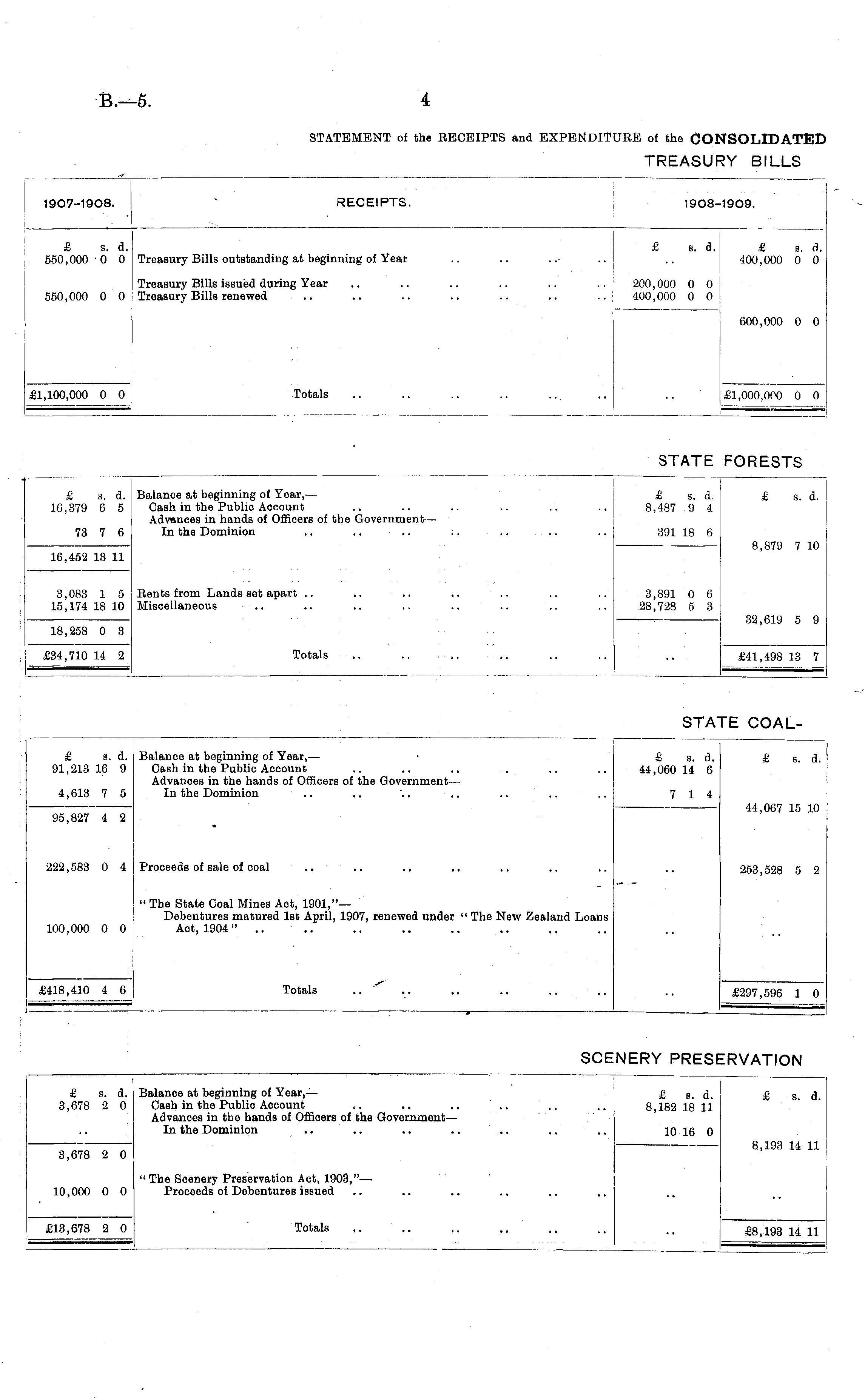 1907-1908. RECEIPTS. 1908-1909. £ s. d. 550,000 0 0 Treasury Bills outstanding at beginning of Year £ s. d. £ s. d. 400,000 0 0 550,000 0 0 Treasury Bills issued during Year Treasury Bills renewed 200,000 0 0 400,000 0 0 ;-- 600,000 0 0 Totals £1,100,000 0 0 £1,000,000 0 0
