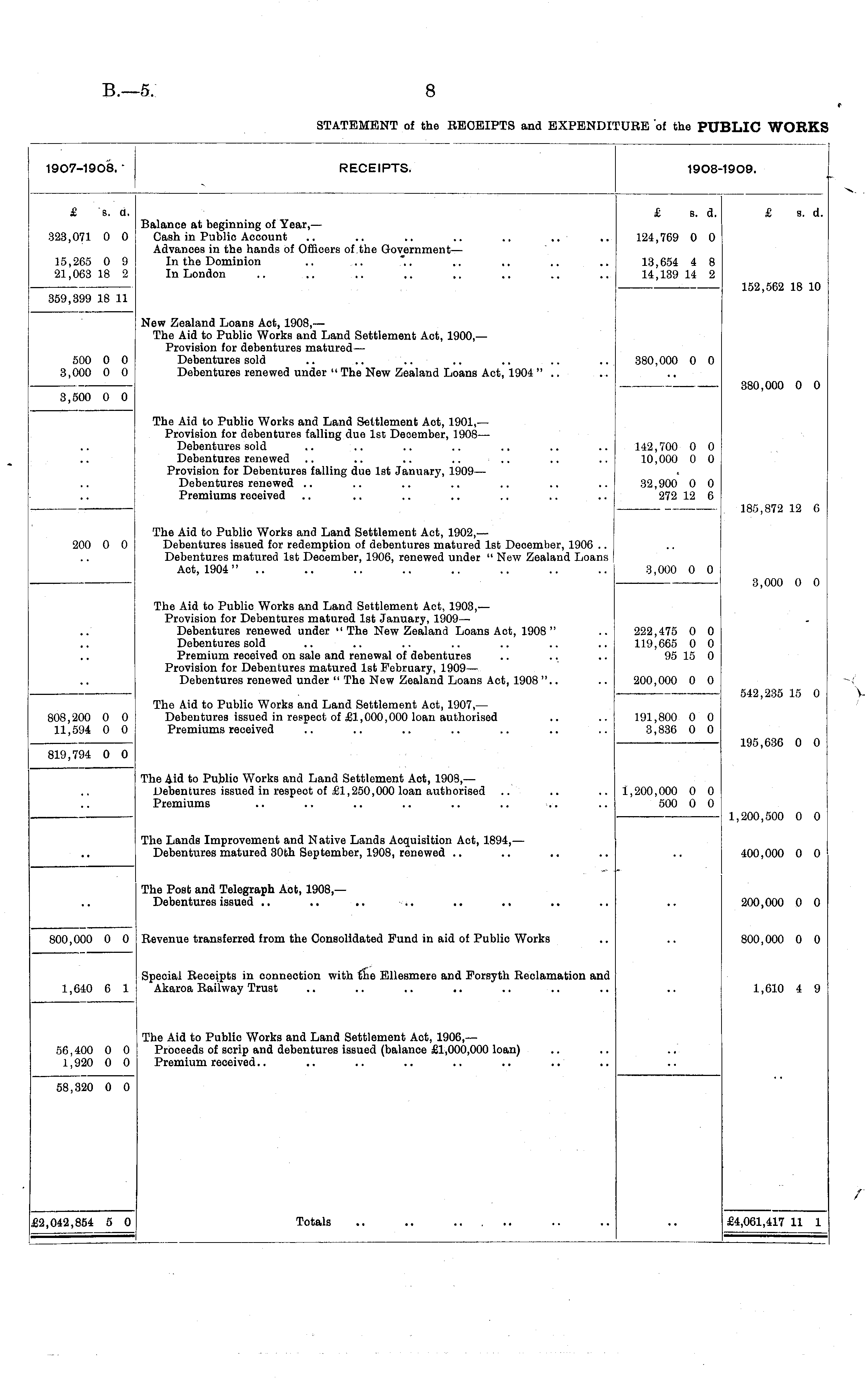 1907-1908. RECEIPTS. 1908-1909. £ s. a. £ s. d. £ s. d. 323,071 0 0 15,265 0 9 21,063 18 2 Balance at beginning of Year, — Cash in Public Account .. .. .. .. .. Advances in the hands of Officers of the Government— In the Dominion In London 124,769 0 0 13,654 4 8 14,139 14 2 152,562 18 10 359,399 18 11 New Zealand Loans Act, 1908, — The Aid to Publio Works and Land Settlement Act, 1900,— Provision for debentures matured— Debentures sold Debentures renewed under " The New Zealand Loans Act, 1904 " .. 380,000 0 0 380,000 0 0 500 0 0 3,000 0 0 3,500 0 0 The Aid to Public Works and Land Settlement Act, 1901,— Provision for debentures falling due 1st December, 1908— Debentures sold Debentures renewed Provision for Debentures falling due 1st January, 1909— Debentures renewed Premiums reoeived 142,700 0 0 10,000 0 0 32,900 0 0 272 12 6 185,872 12 0 200 0 0 The Aid to Public Works and Land Settlement Act, 1902,— Debentures issued for redemption of debentures matured 1st Deoember, 1906 .. Debentures matured 1st Deoember, 1906, renewed under " New Zealand Loans Aot, 1904" .. 3,000 0 0 3,000 0 0 The Aid to Public Works and Land Settlement Act, 1903,— Provision for Debentures matured 1st January, 1909 — Debentures renewed under " The New Zealand Loans Aot, 1908 " Debentures sold Premium reoeived on sale and renewal of debentures Provision for Debentures matured 1st February, 1909— Debentures renewed under " The New Zealand Loans Act, 1908 ".. 222,475 0 0 119,665 0 0 95 15 0 200,000 0 0 542,235 15 0 808,200 0 0 11,594 0 0 The Aid to Publio Works and Land Settlement Aot, 1907, — Debentures issued in respect of £1,000,000 loan authorised Premiums received 191,800 0 0 3,836 0 0 195,636 0 0 819,794 0 0 The Aid to Publio Works and Land Settlement Aot, 1908,— Debentures issued in respect of £1,250,000 loan authorised Premiums 1,200,000 0 0 500 0 0 1,200,500 0 0 The Lands Improvement and Native Lands Acquisition Aot, 1894, — Debentures matured 30th September, 1908, renewed .. 400,000 0 0 The Post and Telegraph Aot, 1908 — Debentures issued 200,000 0 0 800,000 0 0 Revenue transferred from the Consolidated Fund in aid of Publio Works 800,000 0 0 Special Receipts in connection with the Ellesmere and Forsyth Reclamation and Akaroa Railway Trust 1,610 4 9 1,640 6 1 56,400 0 0 1,920 0 0 The Aid to Publio Works and Land Settlement Act, 1906,— Proceeds of scrip and debentures issued (balance £1,000,000 loan) Premium received 58,320 0 0 Totals .. .. ...... £2,042,854 5 0 £4,061,417 11 1