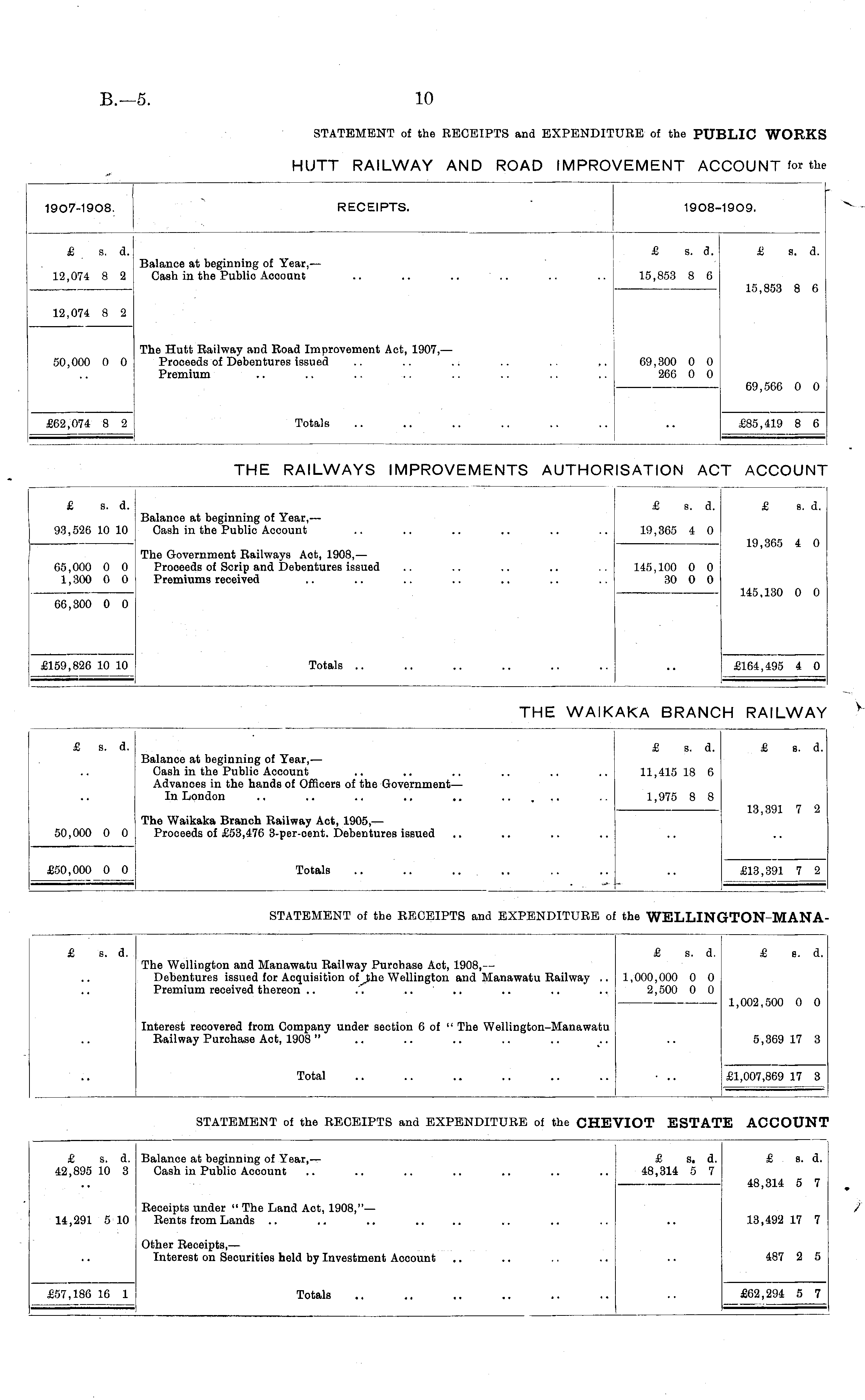 1907-1908. RECEIPTS. 1908-1909. £ s. d. £ s. d. £ s. d. 12,074 8 2 Balance at beginning of Year, — Cash in the Publio Account 15,853 8 6 15,853 8 6 12,074 8 2 The Hutt Railway and Road Improvement Act, 1907, — Proceeds of Debentures issued Premium 50,000 0 0 69,300 0 0 266 0 0 69,566 0 0 £62,074 8 2 Totals £85,419 8 6