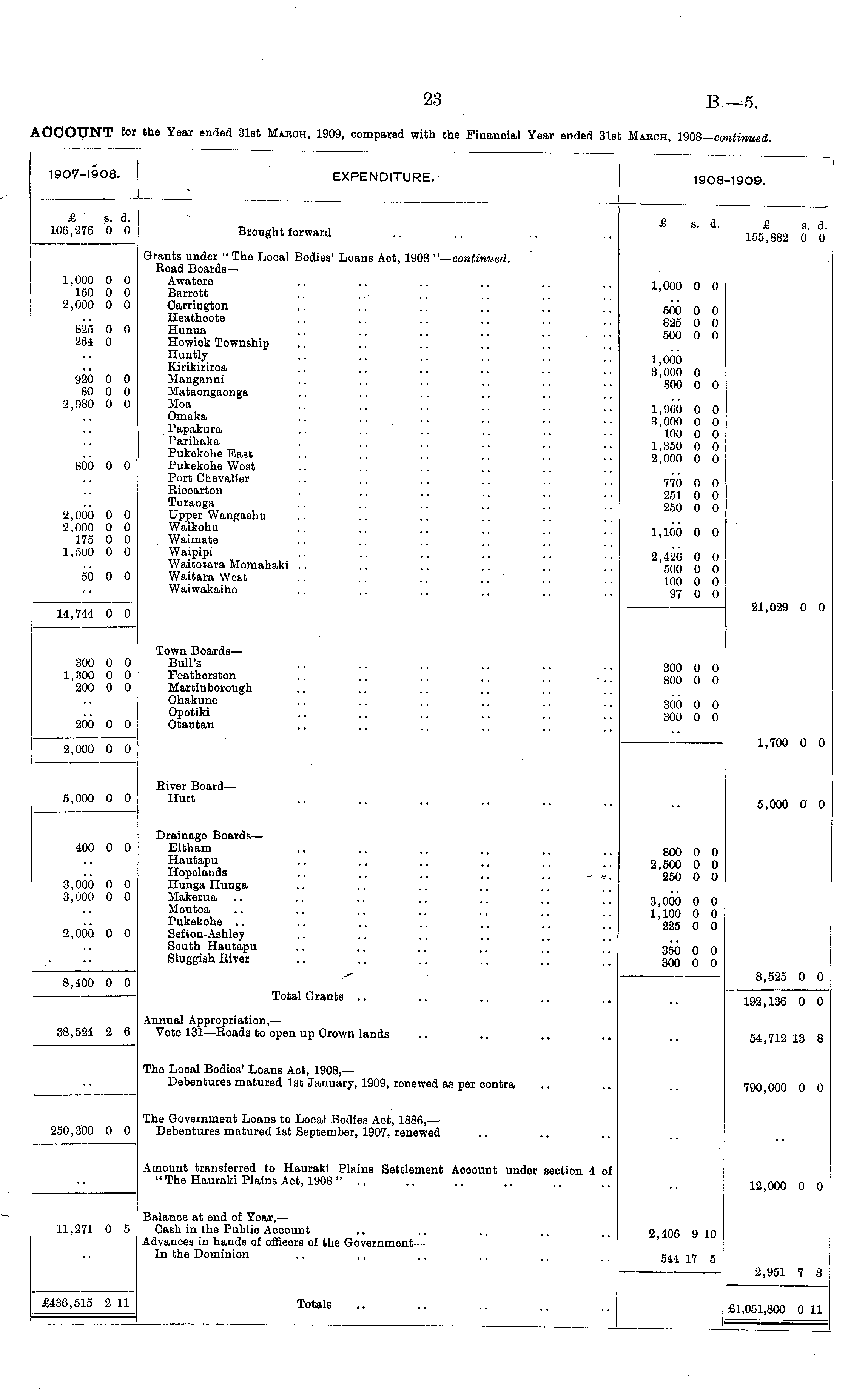 1907-1908. EXPENDITURE. 1908-1909. £ s. d. 106,276 0 0 Brought forward £ s. d. £ s. d. 155,882 0 0 1,000 0 0 150 0 0 2,000 0 0 825 0 0 264 0 920 0 0 80 0 0 2,980 0 0 Grants under "The Local Bodies' Loans Act, 1908 "—continued. Road Boards— Awatere Barrett Carrington Heathoote Hunua .. .. .. .. ,. [[ Howiok Township Huntly Kirikiriroa Manganui Mataongaonga Moa .. .. .. .. .. " Omaka Papakura Parihaka Pukekohe East Pukekohe West Port Chevalier .. .. Riooarton Turanga Upper Wangaehu Waikohu Waimate Waipipi Waitotara Momahaki Waitara West Waiwakaiho 1,000 0 0 500 0 0 825 0 0 500 0 0 1,000 3,000 0 300 0 0 1,960 0 0 3,000 0 0 100 0 0 1,350 0 0 2,000 0 0 800 0 0 770 0 0 251 0 0 250 0 0 2,000 0 0 2,000 0 0 175 0 0 1,500 0 0 1,100 0 0 50 0 0 2,426 0 0 500 0 0 100 0 0 97 0 0 21,029 0 0 14,744 0 0 300 0 0 1,300 0 0 200 0 0 Town Boards— Bull's Featherston Martinborough Ohakune Opotiki Otautau 300 0 0 800 0 0 300 0 0 300 0 0 200 0 0 2,000 0 0 1,700 0 0 5,000 0 0 River Board— Hutt 5,000 0 0 400 0 0 3,000 0 0 3,000 0 0 Drainage Boards— Eltham Hautapu Hopelands Hunga Hunga Makerua Moutoa Pukekohe Sefton-Ashley .. .. .. .. ,, \\ South Hautapu Sluggish River 800 0 0 2,500 0 0 250 0 0 3,000 0 0 1,100 0 0 225 0 0 2,000 0 0 350 0 0 300 0 0 x*' 8,525 0 0 8,400 0 0 Total Grants 192,136 0 0 38,524 2 6 Annual Appropriation,— Vote 131—Roads to open up Crown lands 54,712 13 8 The Looal Bodies' Loans Aot, 1908 — Debentures matured 1st January, 1909, renewed as per contra 790,000 0 0 250,300 0 0 The Government Loans to Local Bodies Act, 1886, — Debentures matured 1st September, 1907, renewed Amount transferred to Hauraki Plains Settlement Account under section 4 of " The Hauraki Plains Act, 1908 " .. 12,000 0 0 11,271 0 5 Balance at end of Year, — Cash in the Publio Account Advances in hands of officers of the Government— In the Dominion 2,406 9 10 2,951 7 3 544 17 5 Totals £436,515 2 11 £1,051,800 0 11