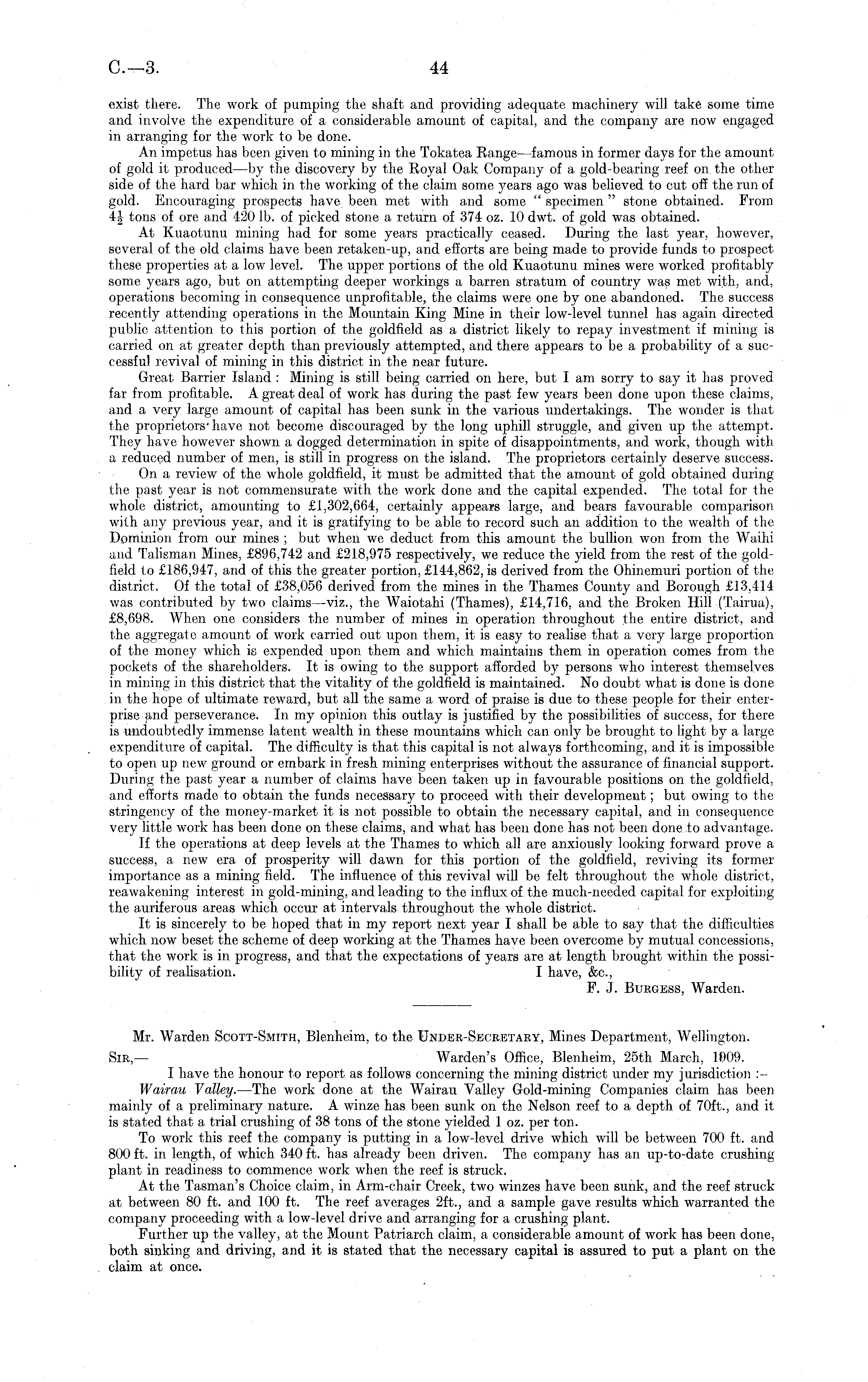 Mr. Warden Scott-Smith, Blenheim, to the Under-Secretary, Mines Department, Wellington. Sir— Warden's Office, Blenheim, 25th March, 1009. I have the honour to report as follows concerning the mining district under my jurisdiction iWairau Valley. —The work done at the Wairau Valley Gold-mining Companies claim has been mainly of a preliminary nature. A winze has been sunk on the Nelson reef to a depth of 70ft., and it is stated that a trial crushing of 38 tons of the stone yielded 1 oz. per ton. To work this reef the company is putting in a low-level drive which will be between 700 ft. and 800 ft. in length, of which 340 ft. has already been driven. The company has an up-to-date crushing plant in readiness to commence work when the reef is struck. At the Tasman's Choice claim, in Arm-chair Creek, two winzes have been sunk, and the reef struck at between 80 ft. and 100 ft. The reef averages 2ft., and a sample gave results which warranted the company proceeding with a low-level drive and arranging for a crushing plant. Further up the valley, at the Mount Patriarch claim, a considerable amount of work has been done, both sinking and driving, and it is stated that the necessary capital is assured to put a plant on the claim at once.
