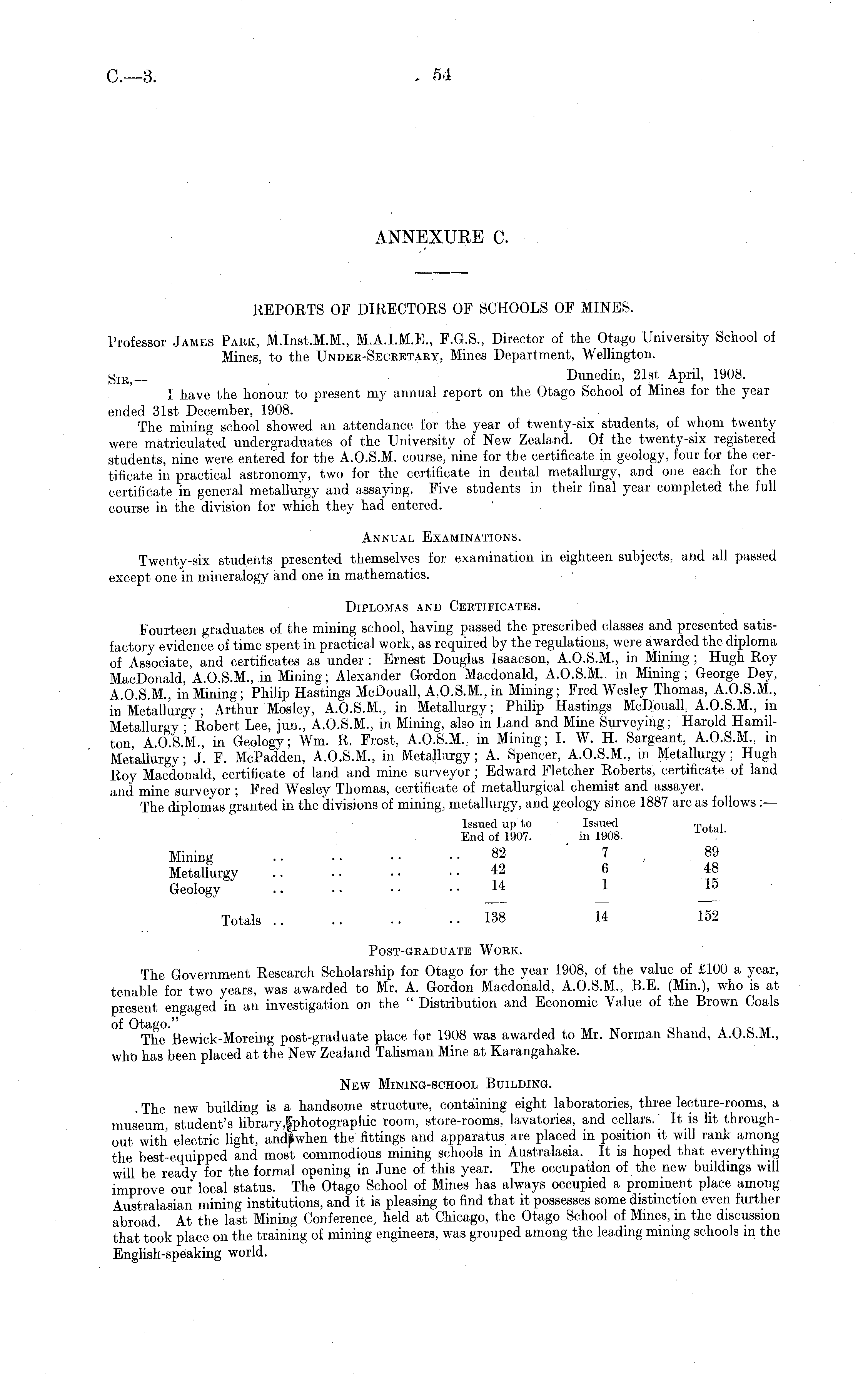 REPORTS OF DIRECTORS OF SCHOOLS OF MINES. Professor James Park, M.lnst.M.M., M.A.1.M.E., F.G.S., Director of the Otago University School of Mines, to the Under-Secretary, Mines Department, Wellington. S lB> _ Dunedin, 21st April, 1908. 1 have the honour to present my annual report on the Otago School of Mines for the year ended 31st December, 1908. The mining school showed an attendance for the year of twenty-six students, of whom twenty were matriculated undergraduates of the University of New Zealand. Of the twenty-six registered students, nine were entered for the A.O.S.M. course, nine for the certificate in geology, four for the certificate in practical astronomy, two for the certificate in dental metallurgy, and one each for the certificate in general metallurgy and assaying. Five students in their final year completed the full course in the division for which they had entered. Annual Examinations. Twenty-six students presented themselves for examination in eighteen subjects, and all passed except one in mineralogy and one in mathematics. Diplomas and Certificates. Fourteen graduates of the mining school, having passed the prescribed classes and presented satisfactory evidence of time spent in practical work, as required by the regulations, were awarded the diploma of Associate, and certificates as under : Ernest Douglas Isaacson, A.0.5.M., in Mining ; Hugh Roy Mac Donald, A.0.5.M., in Mining; Alexander Gordon Macdonald, A.0.5.M., in Mining; George Dey, A.0.5.M., in Mining; Philip Hastings McDouall, A.0.5.M., in Mining; Fred Wesley Thomas, A.0.5.M., in Metallurgy; Arthur Mosley, A.0.5.M., in Metallurgy; Philip Hastings McDouall A.0.5.M., in Metallurgy ; Robert Lee, jun., A.0.5.M., in Mining, also in Land and Mine Surveying; Harold Hamilton, A.0.5.M., in Geology; Wm. R. Frost, A.0.5.M,. in Mining; I. W. H. Sargeant, A.0.5.M., in Metallurgy; J. F. McPadden, A.0.5.M., in Metallurgy; A. Spencer, A.0.5.M., in Metallurgy; Hugh Roy Macdonald, certificate of land and mine surveyor ; Edward Fletcher Roberts, certificate of land and mine surveyor ; Fred Wesley Thomas, certificate of metallurgical chemist and assayer. The diplomas granted in the divisions of mining, metallurgy, and geology since 1887 are as follows :— Issued up to Issued Total End of 1907. in 1908. Mining .. . • • • .. 82 7 89 Metallurgy .. .. •• .. 42 6 48 Geology v l 15 Totals 138 14 152 Post-graduate Work. The Government Research Scholarship for Otago for the year 1908, of the value of £100 a year, tenable for two years, was awarded to Mr. A. Gordon Macdonald, A.0.5.M., B.E. (Mm.), who is at present engaged in an investigation on the " Distribution and Economic Value of the Brown Coals Theßewick-Moreing post-graduate place for 1908 was awarded to Mr. Norman Shand, A.0.5.M., who has been placed at the New Zealand Talisman Mine at Karangahake. New Mining-school Building. . The new building is a handsome structure, containing eight laboratories, three lecture-rooms, a museum, student's library,|photographic room, store-rooms, lavatories, and cellars. It is lit throughout with electric light, the fittings and apparatus are placed in position it will rank among the best-equipped and most commodious mining schools in Australasia, It is hoped that everything will be ready for the formal opening in June of this year. The occupation of the new buildings will improve our local status. The Otago School of Mines has always occupied a prominent place among Australasian mining institutions, and it is pleasing to find that it possesses some distinction even further abroad At the last Mining Conference, held at Chicago, the Otago School of Mines, in the discussion that took place on the training of mining engineers, was grouped among the leading mining schools in the English-speaking world.