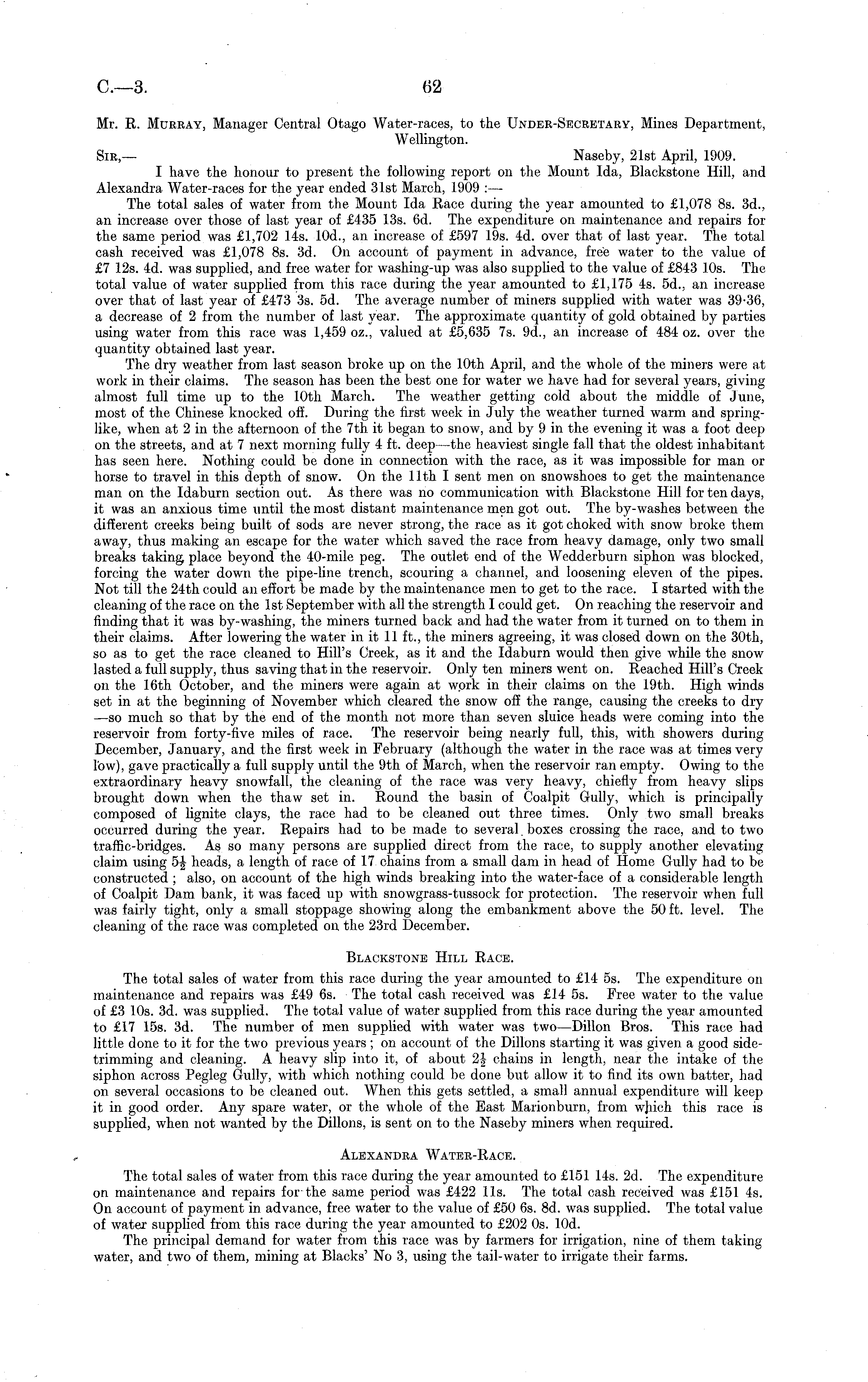 Mr. R. Murray, Manager Central Otago Water-races, to the Under-Secretary, Mines Department, Wellington. Sir,— Naseby, 21st April, 1909. I have the honour to present the following report on the Mount Ida, Blackstone Hill, and Alexandra Water-races for the year ended 31st March, 1909 : — The total sales of water from the Mount Ida Race during the year amounted to £1,078 Bs. 3d., an increase over those of last year of £435 13s. 6d. The expenditure on maintenance and repairs for the same period was £1,702 14s. 10d., an increase of £597 19s. 4d. over that of last year. The total cash received was £1,078 Bs. 3d. On account of payment in advance, free water to the value of £7 12s. 4d. was supplied, and free water for washing-up was also supplied to the value of £843 10s. The total value of water supplied from this race during the year amounted to £1,175 4s. 5d., an increase over that of last year of £473 3s. sd. The average number of miners supplied with water was 39-36, a decrease of 2 from the number of last year. The approximate quantity of gold obtained by parties using water from this race was 1,459 oz., valued at £5,635 7s. 9d., an increase of 484 oz. over the quantity obtained last year. The dry weather from last season broke up on the 10th April, and the whole of the miners were at work in their claims. The season has been the best one for water we have had for several years, giving almost full time up to the 10th March. The weather getting cold about the middle of June, most of the Chinese knocked off. During the first week in July the weather turned warm and springlike, when at 2 in the afternoon of the 7th it began to snow, and by 9 in the evening it was a foot deep on the streets, and at 7 next morning fully 4 ft. deep —the heaviest single fall that the oldest inhabitant has seen here. Nothing could be done in connection with the race, as it was impossible for man or horse to travel in this depth of snow. On the 11th I sent men on snowshoes to get the maintenance man on the Idaburn section out. As there was no communication with Blackstone Hill for ten days, it was an anxious time until the most distant maintenance men got out. The by-washes between the different creeks being built of sods are never strong, the race as it got choked with snow broke them away, thus making an escape for the water which saved the race from heavy damage, only two small breaks taking place beyond the 40-mile peg. The outlet end of the Wedderburn siphon was blocked, forcing the water down the pipe-line trench, scouring a channel, and loosening eleven of the pipes. Not till the 24th could an effort be made by the maintenance men to get to the race. I started with the cleaning of the race on the Ist September with all the strength I could get. On reaching the reservoir and finding that it was by-washing, the miners turned back and had the water from it turned on to them in their claims. After lowering the water in it 11 ft., the miners agreeing, it was closed down on the 30th, so as to get the race cleaned to Hill's Creek, as it and the Idaburn would then give while the snow lasted a full supply, thus saving that in the reservoir. Only ten miners went on. Reached Hill's Creek on the I6th October, and the miners were again at work in their claims on the 19th. High winds set in at the beginning of November which cleared the snow off the range, causing the creeks to dry —so much so that by the end of the month not more than seven sluice heads were coming into the reservoir from forty-five miles of race. The reservoir being nearly full, this, with showers during December, January, and the first week in February (although the water in the race was at times very low), gave practically a full supply until the 9th of March, when the reservoir ran empty. Owing to the extraordinary heavy snowfall, the cleaning of the race was very heavy, chiefly from heavy slips brought down when the thaw set in. Round the basin of Coalpit Gully, which is principally composed of lignite clays, the race had to be cleaned out three times. Only two small breaks occurred during the year. Repairs had to be made to several. boxes crossing the race, and to two traffic-bridges. As so many persons are supplied direct from the race, to supply another elevating claim using 5|- heads, a length of race of 17 chains from a small dam in head of Home Gully had to be constructed ; also, on account of the high winds breaking into the water-face of a considerable length of Coalpit Dam bank, it was faced up with snowgrass-tussock for protection. The reservoir when full was fairly tight, only a small stoppage showing along the embankment above the 50 ft. level. The cleaning of the race was completed on the 23rd December. Blackstone Hill Race. The total sales of water from this race during the year amounted to £14 ss. The expenditure on maintenance and repairs was £49 6s. The total cash received was £14 ss. Free water to the value of £3 10s. 3d. was supplied. The total value of water supplied from this race during the year amounted to £17 15s. 3d. The number of men supplied with water was two—Dillon Bros. This race had little done to it for the two previous years ; on account of the Dillons starting it was given a good sidetrimming and cleaning. A heavy slip into it, of about 2| chains in length, near the intake of the siphon across Pegleg Gully, with which nothing could be done but allow it to find its own batter, had on several occasions to be cleaned out. When this gets settled, a small annual expenditure will keep it in good order. Any spare water, or the whole of the East Marionburn, from which this race is supplied, when not wanted by the Dillons, is sent on to the Naseby miners when required. Alexandra Water-Race. The total sales of water from this race during the year amounted to £151 14s. 2d. The expenditure on maintenance and repairs for-the same period was £422 lis. The total cash received was £151 4s. On account of 