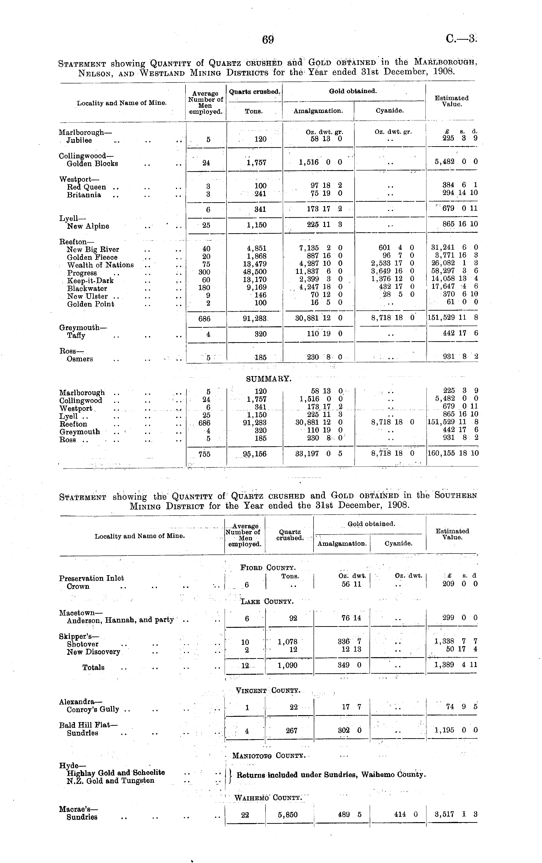 Statement showing Quantity of Quartz crushed and Gold obtained in the Marlborough, Nelson, and Westland Mining Districts for the Year ended 31st December, 1908.
