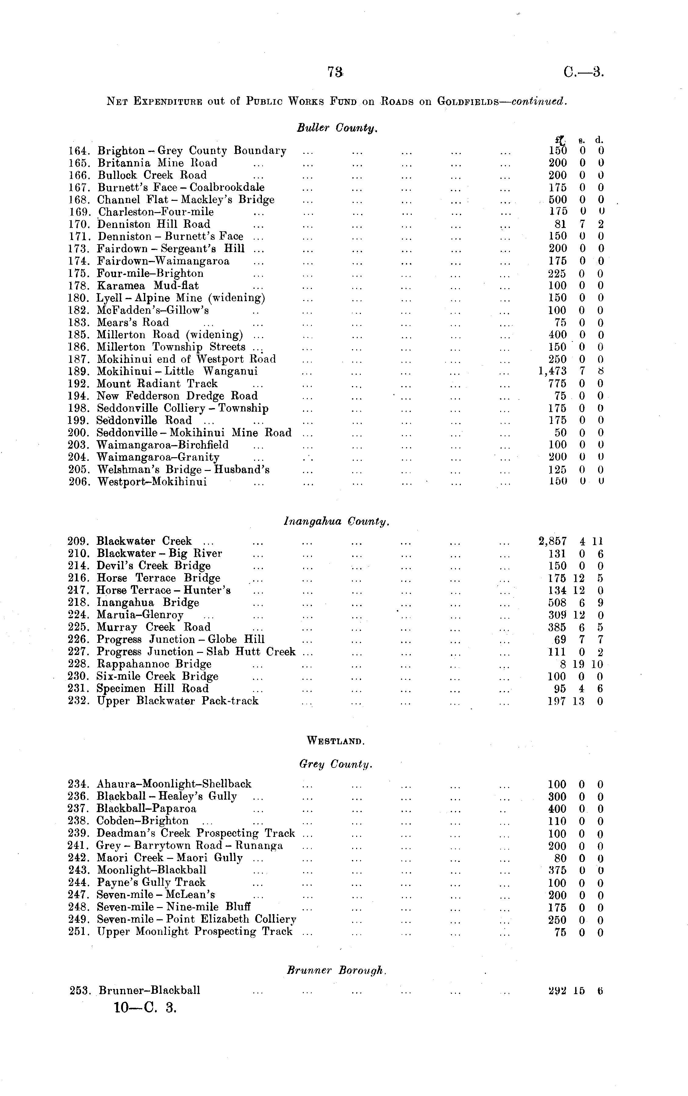 Net Expenditure out of Public Works Fund on Roads on Goldfields — continued. Buller County. ££ g. d. 164. Brighton - Grey County Boundary ... ... ... ... ... 150 0 0 165. Britannia Mine Road ... ... ... ... ... ... 200 0 0 166. Bullock Creek Road ... ... ... ... ... ... 200 0 0 167. Burnett's Face - Coalbrookdale ... ... ... ... ... 175 0 0 168. Channel Flat-Mackley's Bridge ... ... ... ... 500 0 0 169. Charleston-Four-mile ... ... ... ... ... ... 175 0 0 170. Denniston Hill Road ... ... ... ... ... ... 81 7 2 171. Denniston - Burnett's Face ... ... ... ... ... ... 150 0 0 173. Fairdown - Sergeant's Hill ... ... ... ... ... .... 200 0 0 174. Fairdown-Waimangaroa ... ... ... ... ... ... 175 0 0 175. Four-mile-Brighton ... ... ... ... ... ... 225 0 0 178. Karamea Mud-flat ... ... ... ... ... ... 100 0 0 180. Lyell-Alpine Mine (widening) ... ... ... ... ... 150 0 0 182. McFadden's-Gillow's .. ... ... ... ... ... 100 0 0 183. Mears's Road ... ... ... ... ... ... .... 75 0 0 185. Millerton Road (widening) ... ... ... ... ... ... 400 0 0 186. Millerton Township Streets ... ... ... ... ... ... 150 0 0 187. Mokihinui end of Westport Road ... ... ... 250 0 0 189. Mokihinui - Little Wanganui ... ... ... ... ... 1,473 7 8 192. Mount Radiant Track ... ... ... ... 775 0 0 194. New Fedderson Dredge Road ... ... ... ... .... 75 0 0 198. Seddonville Colliery - Township ... ... ... ... ... 175 0 0 199. Seddonville Road ... ... ... ... ... ... ... 175 0 0 200. Seddonville - Mokihinui Mine Road ... ... ... ... 50 0 0 203. Waimangaroa-Birchfield ... ... ... ... ... ... 100 0 0 204. Waimangaroa-Granity ... .'. ... ... ... ... 200 0 0 205. Welshman's Bridge - Husband's ... ... ... ... ... 125 0 0 206. Westport-Mokihinui ... ... ... ... ... 150 0 U Inangahua County. 209. Blackwater Creek ... ... ... ... ... ... ... 2,857 4 11 210. Blackwater - Big River ... ... ... ... ... ... 131 0 6 214. Devil's Creek Bridge ... ... ... ... ... ... 150 0 0 216. Horse Terrace Bridge ... ... ... ... ... ... 175 12 5 217. Horse Terrace-Hunter's ... ... ... ... ... "... 13412 0 218. Inangahua Bridge ... ... ... ... ... 508 6 9 224. Maruia-Glenroy ... ... ... ... "... ... 309 12 0 225. Murray Creek Road ... ... ... ... ... ... 385 6 5 226. Progress Junction - Globe Hill ... ... ... ... ... 69 7 7 227. Progress Junction-Slab Hutt Creek ... ... ... ... ... 11102 228. Rappahannoc Bridge ... ... ... ... ... ... 8 19 10 230. Six-mile Creek Bridge ... ... ... ... ... ... 100 0 0 231. Specimen Hill Road ... ... ... ... ... ... 95 4 6 232. Upper Blackwater Pack-track ... ... ... ... 197 13 0 Westland. Grey County. 234. Ahaura-Moonlight-Shellback ... ... ... ... ... 100 0 0 236. Blackball -Healey's Gully ... ... ... ... ... ... 300 0 0 237. Blackball-Paparoa ... ... ... ... ... .. 400 0 0 238. Cobden-Brighton ... ... ... ... ... ... ... 110 0 0 239. Deadman's Creek Prospecting Track ... ... ... ... ... 100 0 0 241. Grey-Barrytown Road-Runanga ... ... ... ... ... 200 0 0 242. Maori Creek-Maori Gully ... ... ... ... ... ... 80 0 0 243. Moonlight-Blackball ... ... ... ... ... ... 375 0 0 244. Payne's Gully Track ... ... ... ... ... ... 100 0 0 247. Seven-mile-McLean's ... ... ... ... ... ... 200 0 0 248. Seven-mile - Nine-mile Bluff ... ... ... ... ... 175 0 0 249. Seven-mile - Point Elizabeth Colliery ... ... ... ... 250 0 0 251. Upper Moonlight Prospecting Track ... ... ... ... 75 0 0 Brunner Borough. 253. Brunner-Blackball ... ... ... ... ... 292 15 t>
