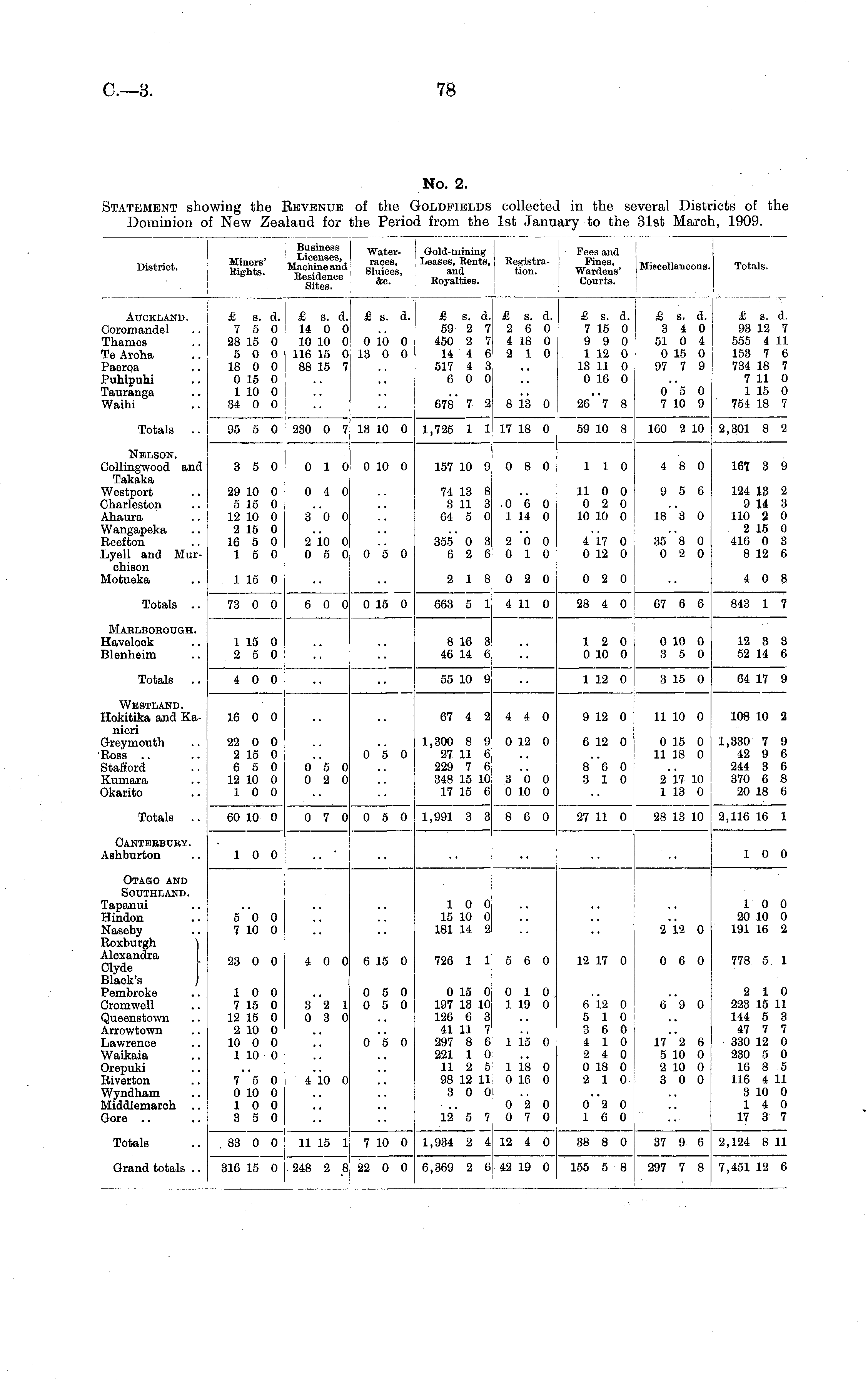 No. 2. Statement showing the Revenue of the Goldfields collected in the several Districts of the Dominion of New Zealand for the Period from the 1st January to the 31st March, 1909.