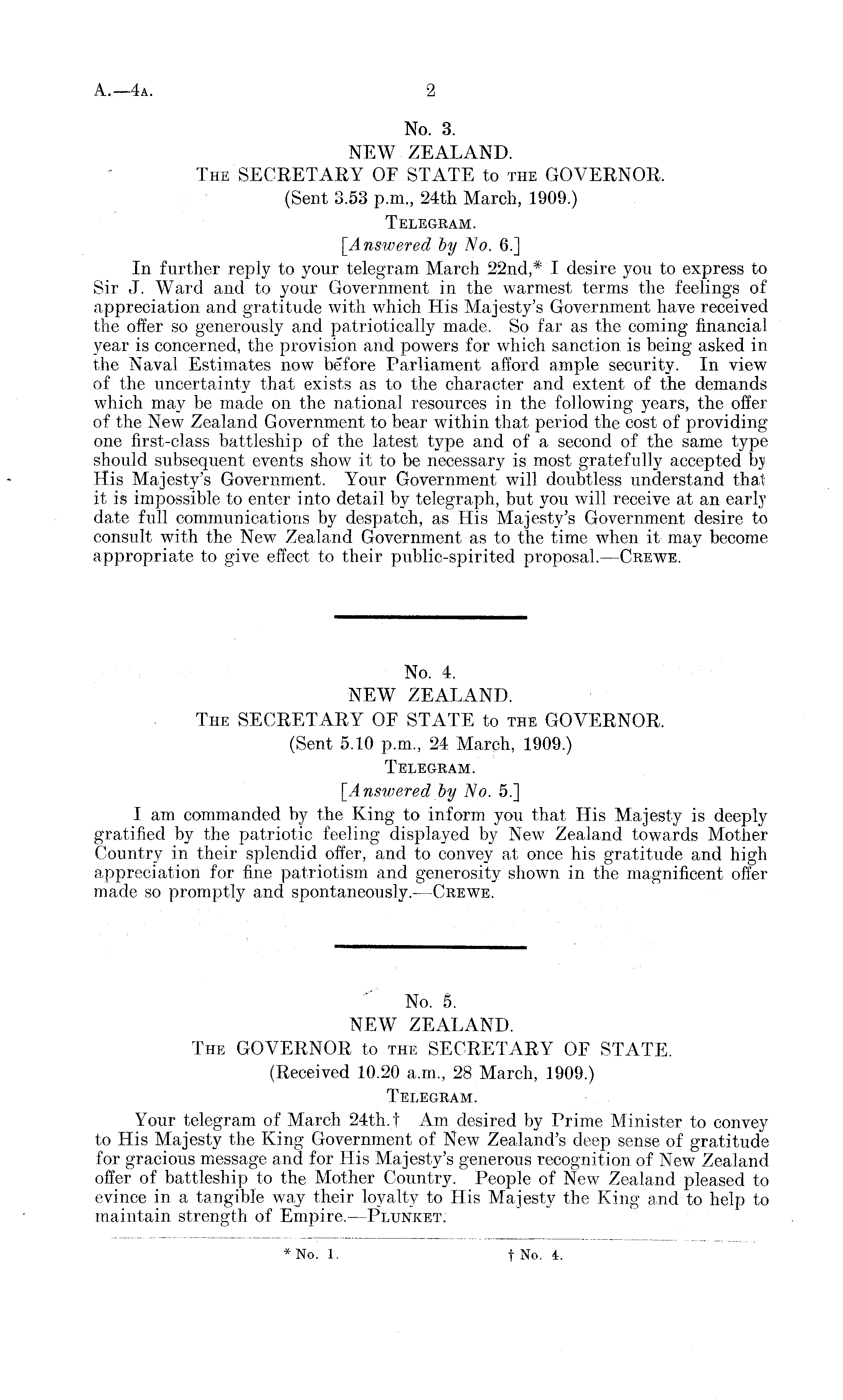 No. 4. NEW ZEALAND. The SECRETARY OF STATE to the GOVERNOR. (Sent 5.10 p.m., 24 March, 1909.) Telegram. [Answered by No. 5.] I am commanded by the King to inform you that His Majesty is deeply gratified by the patriotic feeling displayed by New Zealand towards Mother Country in their splendid offer, and to convey at once his gratitude and high appreciation for fine patriotism and generosity shown in the magnificent offer made so promptly and spontaneously.—Crewe.