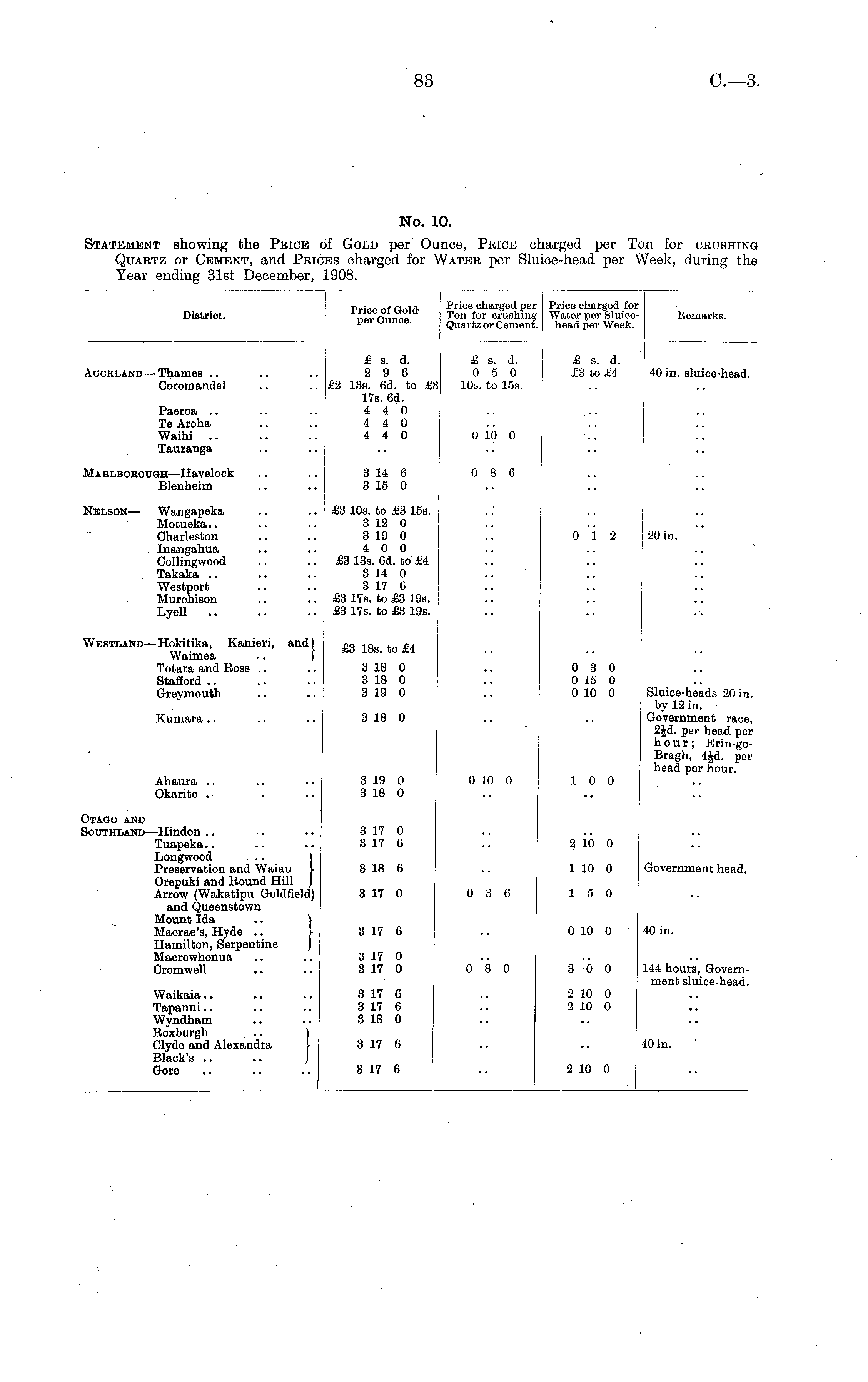 No. 10. Statement showing the Price of Gold per Ounce, Price charged per Ton for crushing Quartz or Cement, and Prices charged for Water per Sluice-head per Week, during the Year ending 31st December, 1908.