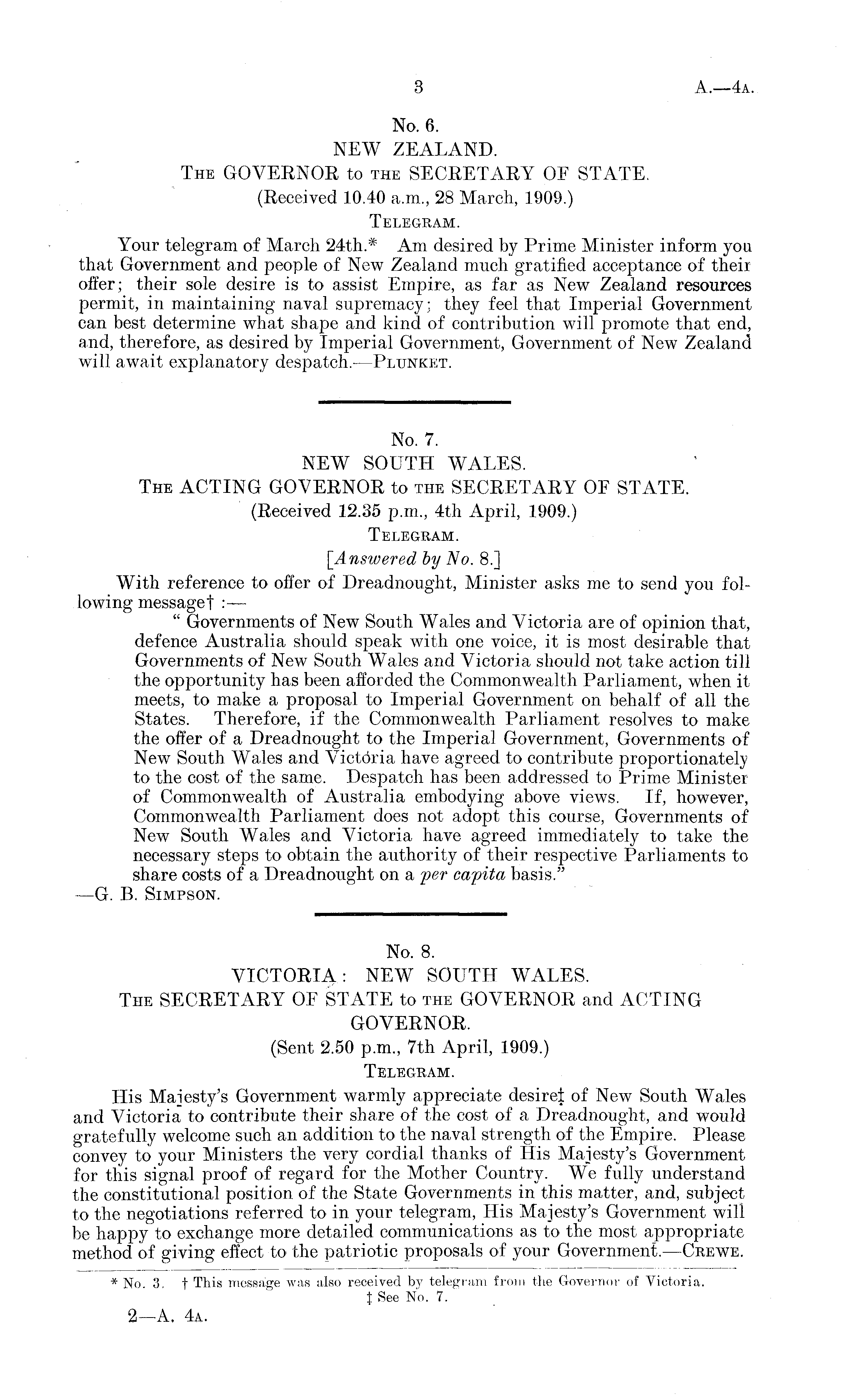 No. 7. NEW SOUTH WALES. The ACTING GOVERNOR to the SECRETARY OF STATE. (Received 12.35 p.m., 4th April, 1909.) Telegram. [Answered by No. B.] With reference to offer of Dreadnought, Minister asks me to send you following message! : — " Governments of New South Wales and Victoria are of opinion that, defence Australia should speak with one voice, it is most desirable that Governments of New South Wales and Victoria should not take action till the opportunity has been afforded the Commonwealth Parliament, when it meets, to make a proposal to Imperial Government on behalf of all the States. Therefore, if the Commonwealth Parliament resolves to make the offer of a Dreadnought to the Imperial Government, Governments of New South Wales and Victdria have agreed to contribute proportionately to the cost of the same. Despatch has been addressed to Prime Minister of Commonwealth of Australia embodying above views. If, however, Commonwealth Parliament does not adopt this course, Governments of New South Wales and Victoria have agreed immediately to take the necessary steps to obtain the authority of their respective Parliaments to share costs of a Dreadnought on a per capita basis." —G. B. Simpson.