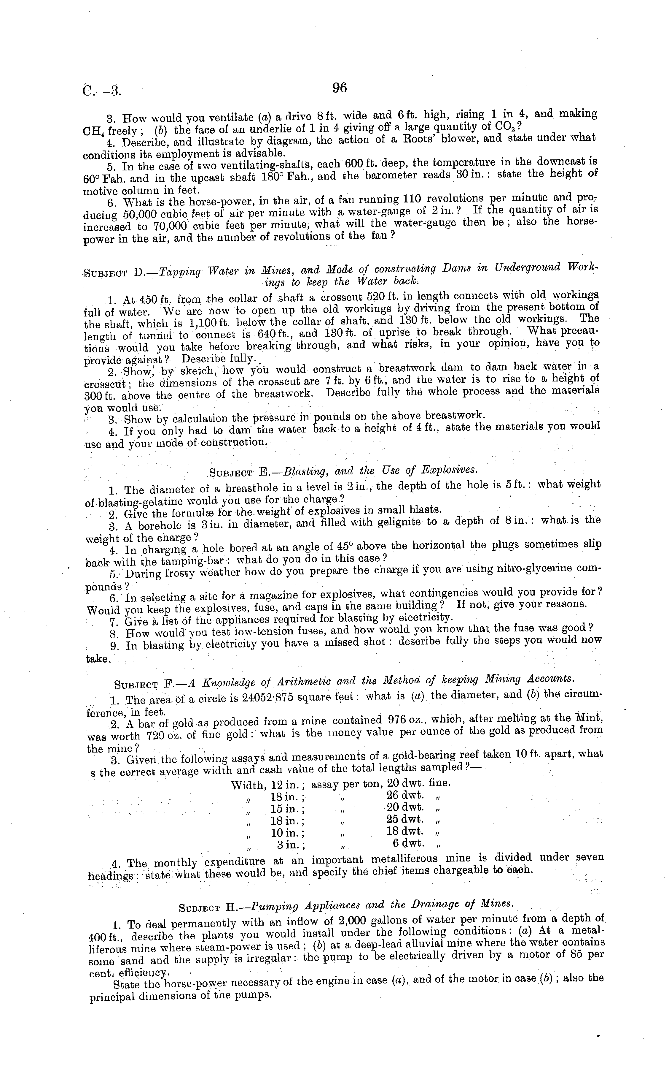 3. How would you ventilate (a) a drive 8 ft. wide and 6 ft. high, rising 1 in 4, and making CH 4 freely ; (b) the face of an underlie of lin 4 giving off a large quantity of C0 2 ? 4. Describe, and illustrate by diagram, the action of a Boots' blower, and state under what conditions its employment is advisable. . 5 In the case of two ventilating-shafts, each 600 ft. deep, the temperature m the downcast is 60°Fah. and in the upcast shaft 180° Fah., and the barometer reads 30 in.: state the height of motive column in feet. . .. 6 What is the horse-power, in the air, of a fan running 110 revolutions per minute and producing 50,000 cubic feet of air per minute with a water-gauge of 2 in. ? If the quantity of air is increased to 70,000 cubic feet per minute, what will the water-gauge then be ; also the horsepower in the air', and the number of revolutions of the fan ? -Subject D.— Tapping Water in Mines, and Mode of constructing Dams in Underground Workings to keep the Water back. 1 At 450 ft from the collar of shaft a crosscut 520 ft. in length connects with old workings full of water. We are now to open up the old workings by driving from the present bottom of the shaft which is 1,100 ft. below the collar of shaft, and 130 ft. below the old workings. The length of tunnel to connect is 640 ft., and 130 ft. of uprise to break through. What precautions would you take before breaking through, and what risks, in your opinion, have you to provide against ? Describe fully. . 2 Show 1 by sketch, how you would construct a breastwork dam to dam back water in a crosscut' the dimensions of the crosscut are 7ft. by 6ft-., and the water is to rise to a height of 300 ft. above the centre of the breastwork. Describe fully the whole process and the materials you would use. , . . 3 Show by calculation the pressure in pounds on the above breastwork. i. If you only had to dam the water back to a height of 4 ft., state the materials you would use and your mode of construction. Subject E.— Blasting, and the Use of Explosives. 1. The diameter of a breasthole in a level is 2 in., the depth of the hole is sft.: what weight of blasting-gelatine would you use for the charge ? 2 Give the formulae for the weight of explosives in small blasts. ,' n . ~ •" , 3. A borehole is 3 in. in diameter, and filled with gelignite to a depth of 8 m. : what is the weight ° f n t^ a c rg^| e a hole bored at an angle of 45 o above the horizontal the plugs sometimes slip back with the tamping-bar : what do you do in this case ? . 5. During frosty weather how do you prepare the charge if you are using mtro-glycerme comPOU V In selecting a site for a magazine for explosives, what contingencies would you provide for? Would you keep the explosives, fuse, and caps in the same building ? If not, give your reasons. 7 Give a list of the appliances required for blasting by electricity. 8 How would you test low-tension fuses, and how would you know that the fuse was good > 9. In blasting by electricity you have a missed shot: describe fully the steps you would now take. Subject F.—A Knowledge of Arithmetic and the Method of keeping Mining Accounts. 1. The area of a circle is 24052-875 square feet: what is (a) the diameter, and (b) the circum&g duced from a mine contained 976 oz., which, after melting at the Mint, was worth 720 oz. of fine gold: what is the money value per ounce of the gold as produced from the mim |: ven the follo , ving assays an d measurements of a gold-bearing reef taken 10 ft. apart, what s the correct average width and cash value of the total lengths sampled?— Width, 12 in.; assay per ton, 20 dwt. fine. 18 in. ; „ 26 dwt. „ 15 in.; » 20 dwt. „ 18 in.; „ 25 dwt. „ 10 in.; „ 18 dwt. „ 3 in.; „ 6 dwt. „ 4 The monthly expenditure at an important metalliferous mine is divided under seven headings: state.what these would be, and specify the chief items chargeable to each. Subject 11.—Pumping Appliances and the Drainage of Mines. 1 To deal permanently with an inflow of 2,000 gallons of water per minute from a depth of 400 ft' describe the plants you would install under the following conditions: (a) At a metalliferous mine where steam-power is used ; (6) at a deep-lead alluvial mine where the water contains some sand and the supply is irregular: the pump to be electrically driven by a motor of 85 per Cent State l the y horse-power necessary of the engine in case (a), and of the motor in case (b) ; also the principal dimensions of the pumps.