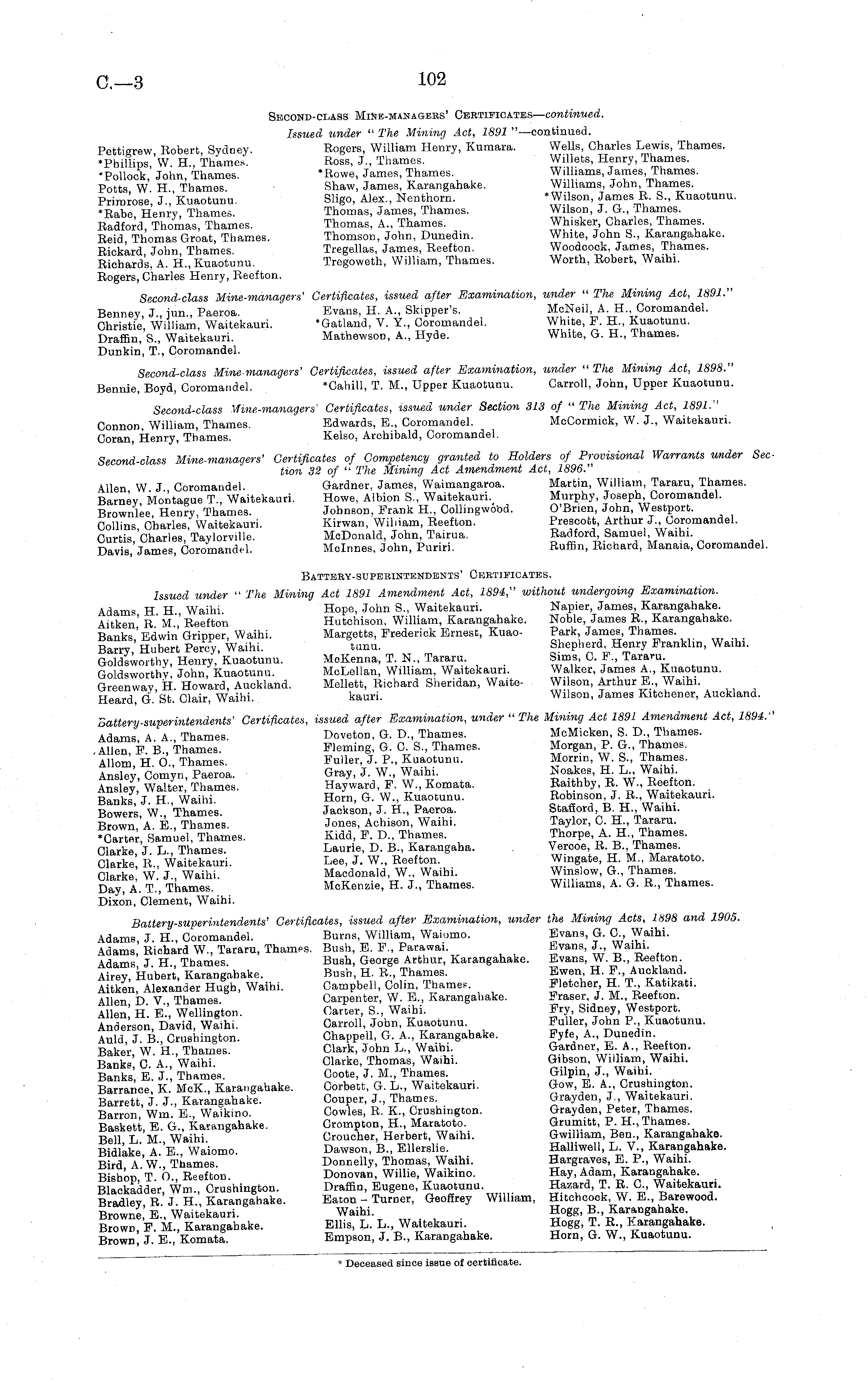 Second-class Mine-managers' Certificates — continued. Issued under " The Mining Act, 1891 "—continued. Pettigrew Robert Sydney. Rogers, William Henry, Kumara. Wells, Charles Lewis, Thames. •Phillips 'W H Thames. Ross, J., Thames. Willets, Henry, Thames. •Pollock ' John, Thames. *Rowe, James, Thames. Williams, James, Thames. Potts W H Thames Shaw, James, Karangahake. Williams, John, Thames. Primrose', J.,'Kuaotunu. Sligo, Alex., Nenthorn. ♦Wilson, James R. S., Kuaotunu. •Rabe Henry Thames. Thomas, James, Thames. Wilson, J. G., Thames. Radford, Thomas, Thames. Thomas, A., Thames. Whisker, Charles Thames. Reid, Thomas Groat, Thames. Thomson, John, Dunedin. White, John S., Karangahake. Rickard John Thames. Tregellas, James, Reefton. Woodcock, James, Thames. Richards, A. H., Kuaotunu. Tregoweth, William, Thames. Worth, Robert, Waihi. Rogers, Charles Henry, Reefton. Second-class Mine-managers' Certificates, issued after Examination, under " The Mining Act, 1891." Benney, J., iun., Paeroa. Evans, H. A., Skipper's. McNeil, A. H„ Coromandel. Christie William, Waitekauri. *Gatland, V. V., Coromandel. White, F. H., Kuaotunu. Draffin, S., Waitekauri. Mathewson, A., Hyde. White, G. H., Thames. Dunkin, T., Coromandel. Second-class Mine-managers' Certificates, issued after Examination, under " The Mining Act, 1898." Bennie, Boyd, Coromandel. 'Cahill, T. M., Upper Kuaotunu. Carroll, John, Upper Kuaotunu. Second-class Wine-managers' Certificates, issued under Section 313 of "The Mining Act, 1891." Connon, William, Thames. Edwards, E., Coromandel. McCormick, W. J., Waitekauri. Goran, Henry, Thames. Kelso, Archibald, Coromandel. Second-class Mine-managers' Certificates of Competency granted to Solders of Provisional Warrants under Sec tion 32 of " The Mining Act Amendment Act, 1896." Allen W J Coromandel. Gardner, James, Waimangaroa. Martin, William, Tararu, Thames. Barney Montague T., Waitekauri. Howe, Albion S., Waitekauri. Murphy, Joseph, Coromandel. Brownlee Henry, Thames. Johnson, Frank H., Collingwo'od. O'Brien, John, Westport. Collins, Charles, Waitekauri. Kirwan, William, Reefton. Prescott, Arthur J , Coromandel. Curtis, Charles, Taylorville. McDonald, John, Tairua. Radford Samuel Waihi Davis, James, Coromandel. Mclnnes, John, Puriri. Ruffin, Richard, Manaia, Coromandel. Battery-superintendents' Certificates. Issued under " The Mining Act 1891 Amendment Act, 1894," without undergoing Examination. Adams H H Waihi. Hope, John S„ Waitekauri. Napier, James, Karangahake. Aitken'R M 'Reefton Hutchison, William, Karangahake. Noble, James,R., Karangahake. Banks' Edwin Gripper, Waihi. Margetts, Frederick Ernest, Kuao- Park James, Thames Barry Hubert Percy, Waihi. tunu. Shepherd, Henry Franklin, Waihi. Goldsworthy, Henry, Kuaotunu. McKenna, T. N., Tararu Sims, C. F., Tararu Goldsworthy John, Kuaotunu. McLellan, William, Waitekauri. Walker, James A., Kuaotunu. Greenwav H Howard, Auckland. Mellett, Richard Sheridan, Waite- Wilson, Arthur E., Waihi. Heard, GSt. Clair, Waihi. kauri. Wilson, James Kitchener, Auckland. Battery-superintendents' Certificates, issued after Examination, under "The Mining Act 1891 Amendment Act, 1894. 1 Adams A A Thames. Doveton, G. D., Thames. McMicken, S. D., Thames. Alien F B Thames Fleming, G. G. S., Thames. Morgan, P. G., Thames. Allom, H. 6., Thames. Fuller, J. P., Kuaotunu. Morrin, W. S„ Thames. Ansley, Comyn, Paeroa. Gray, J. W., Waihi. Noakes, H. L Waihi Ansley Walter Thames. Hayward, F. W., Komata. Raithby, R W., Reefton. Banks J H Waihi Horn, G. W., Kuaotunu. Robinson, J. R., Waitekauri. Bowers, W.,"Thames. Jackson, J. H., Paeroa. Stafford BHWaihi. Brown, A. E., Thames. Jones, Achison, Waihi. Taylor, C. H., Tararu. •Carter, Samuel, Thames. Kidd, P. D., Thames. Thorpe, AH. Thames. Clarke, J. L., Thames. Laurie, D. 8., Karangaha. Vercoe, RB. Thames Clarke R., Waitekauri. Lee, J. W., Reefton. Wingate, H. M , Maratoto. Clarke W J Waihi Macdonald, W., Waihi. Winslow, G., Thames. Day, A. T., Thames. McKenzie, H. J., Thames. Williams, A. G. R., Thames. Dixon, Clement, Waihi. Battery-superintendents' Certificates, issued after Examination, under the Mining Acts, 1898 and 1905. Adams, J. H., Coromandel. Burns, William, Waiomo. Evans, G. C Waihi. Adams, Richard W., Tararu, Thames. Bush, E. F„ Parawai. Evans, J Waihi. Adams J H Thames Bush, George Arthur, Karangahake. Evans, W. 8., Reefton. Airey, Hubert, Karangahake. Bush, H. R., Thames. Ewen H. F. Auckland. Aitken, Alexander Hugh, Waihi. Campbell, Colin, Thames. Fletcher H T Kat.kati. Allen D V Thames Carpenter, W. E., Karangahake. Eraser, J. M., Reefton. Allen' He Wellington. Carter, S., Waihi. Fry, Sidney, Westport. Anderson David Waihi. Carroll, John, Kuaotunu. Fuller, John P., Kuaotunu. Auld J. 8., Crushington. Chappell, G. A., Karangahake. Fyfe A., Dunedin. Baker W II Thames Clark, John L., Waihi. Gardner, E. A., Reefton. Banks' C A Waihi Clarke, Thomas, Waihi. Gibson, William, Waihi. Banks', E. j'.', Thames. Coote, J. M., Thames. Gilpin, J., Waihi Barrance, K. McX„ Karangahake. Corbett, G. L., Waitekauri. Gow, E. A , Crushington. Barrett, J. J., Karangahake. Couper, J., Thames. Grayden, J Waitekauri. Barron Win E Waikino. Cowles, R. X., Crushington. Grayden, Peter, Thames. Baskett, E. G., Karangahake. Grompton, H., Maratoto. grumitt, P H., Thames Bell L M Waihi Croucher, Herbert, Waihi. Gwilham, Ben., Karangahake. Bidlake, A.E., Waiomo. Dawson, 8., Ellerslie. Halliwell, L V., Karangahake. Bird A W Thames Donnelly, Thomas, Waihi. Hargraves, E. P., Waihi. Bishop T O Reefton Donovan, Willie, Waikino. Hay, Adam, Karangahake. Blackadder, Wm., Crushington. Draffin, Eugene, Kuaotunu. Hazard, T. R G., Waitekauri. Bradley R J H Karangahake. Eaton - Turner, Geoffrey William, Hitchcock, W. E., Barewood. Browne,' E., Waitekauri. Waihi. Hogg, 8., Karangahake Brown, P. M., Karangahake. Ellis, L. L., Waitekauri. Hogg, T. R Karangahake. Brown! J. E., Komata. Empson, J. 8., Karangahake. Horn, G. W., Kuaotunu.