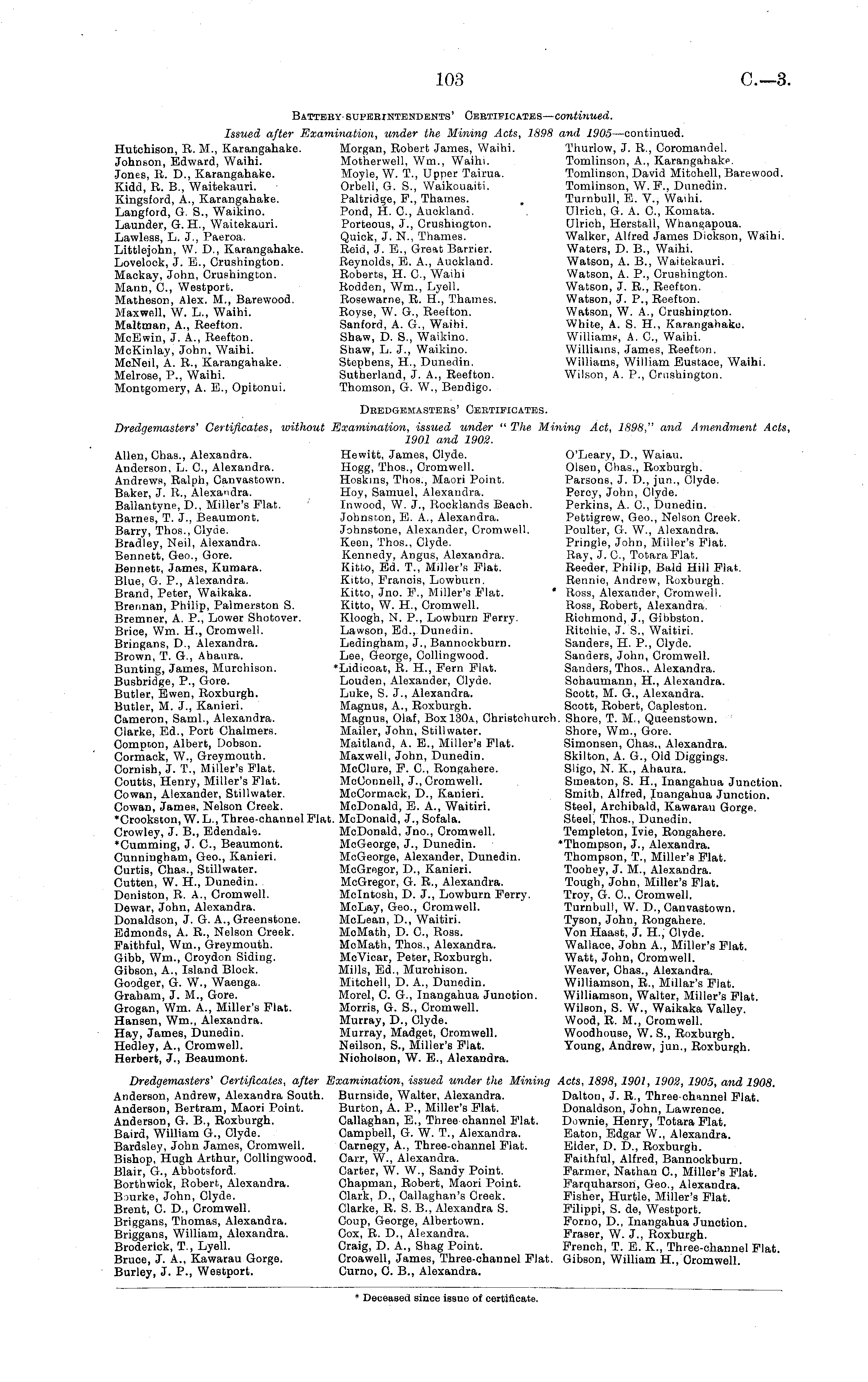 Battery-superintendents' Certificates— continued. Issued after Examination, under the Mining Acts, 1898 and 1905 —continued. Hutchison, R. M., Karangahake. Morgan, Robert James, Waihi. Thurlow, J. R., Coromandel. Johnson, Edward, Waihi. Motherwell, Wm., Waihi. Tomlinson, A., Karangahake. Jones, R. D., Karangahake. Moyle, W. T., Upper Tairua. Tomlinson, David Mitchell, Barewood. Kidd, R. 8., Waitekauri. Orbell, G. S., Waikouaiti. Tomlinson, W. P., Dunedin. Kingsford, A., Karangahake. Paltridge, F., Thames. Turnbull, E. V., Waihi. Langford, G. S., Waikino. Pond, H. C., Auckland. , Ulrica, G. A. C, Komata. Launder, G. H., Waitekauri. Porteous, J., Crushington. Ulrich, Herstall, Whangapoua. Lawless, L. J., Paeroa. Quick, J. N., Thames. Walker, Alfred James Dickson, Waihi. Littlejohn, W. D., Karangahake. Reid, J. E., Great Barrier. Waters, D. 8., Waihi. Lovelock, J. E., Crushington. Reynolds, E. A., Auckland. Watson, A. 8., Waitekauri. Mackay, John, Crushington. Roberts, H. C, Waihi Watson, A. P., Crushington. Mann, C., Westport. Rodden, Wm., Lyell. Watson, J. R., Reefton. Matheson, Alex. M., Barewood. Rosewarne, R. H., Thames. Watson, J. P., Reefton. Maxwell, W. L., Waihi. Royse, W. G., Reefton. Watson, W. A., Crushington. Maltman, A., Reefton. Sanford, A. G., Waihi. White, A. S. H., Karangahake. McEwin, J. A., Reefton. Shaw, D. S., Waikino. Williams, A. C, Waihi. McKinlay, John, Waihi. Shaw, L. J., Waikino. Williams, James, Reefton. McNeil, A. R., Karangahake. Stephens, H., Dunedin. Williams, William Eustace, Waihi. Melrose, P., Waihi. Sutherland, J. A., Reefton. Wilson, A. P., Crushington. Montgomery, A. E., Opitonui. Thomson, G. W., Bendigo. Dredgemasters' Certificates. Dredgemasters' Certificates, without Examination, issued under " The Mining Act, 1898," and Amendment Acts 1901 and 1902. Allen, Chas., Alexandra. Hewitt, James, Clyde. O'Leary, D., Waiau. Anderson, L. C, Alexandra. Hogg, Thos., Cromwell. Olsen, Chas., Roxburgh. Andrews, Ralph, Canvastown. Hoskins, Thos., Maori Point. Parsons, J. D., jun., Clyde. Baker, J. R., Alexandra. Hoy, Samuel, Alexandra. Percy, John, Clyde. Ballantyne, D., Miller's Flat. Inwood, W. J., Rocklands Beach. Perkins, A. G., Dunedin. Barnes, T. J., Beaumont. Johnston, E. A., Alexandra. Pettigrew, Geo., Nelson Creek. Barry, Thos., Clyde. Johnstone, Alexander, Cromwell. Poulter, G. W., Alexandra. Bradley, Neil, Alexandra. Keen, Thos., Clyde. Pringle, John, Miller's Flat. Bennett, Geo., Gore. Kennedy, Angus, Alexandra. Ray, J. C, TotaraFlat. Bennett, James, Kumara. Kitto, Ed. T., Miller's Flat. Reeder, Philip, Bald Hill Flat. Blue, G. P., Alexandra. Kitto, Francis, Lowburn, Rennie, Andrew, Roxburgh. Brand, Peter, Waikaka. Kitto, Jno. P., Miller's Plat. * Ross, Alexander, Cromwell. Brennan, Philip, Palmerston S. Kitto, W. H., Cromwell. Ross, Robert, Alexandra. Bremner, A. P., Lower Shotover. Kloogh, N. P., Lowburn Perry. Richmond, J., Gibbston. Brice, Wm. H, Cromwell. Lawson, Ed., Dunedin. Ritohie, J. S., Waitiri. Bringans, D., Alexandra. Ledingham, J., Bannockburn. Sanders, H. P., Clyde. Brown, T. G., Ahaura. Lee, George, Collingwood. Sanders, John, Cromwell. Bunting, James, Murchison. 'Lidicoat, R. H., Fern Flat. Sanders, Thos., Alexandra. Busbridge, P., Gore. Louden, Alexander, Clyde. Schaumaun, H., Alexandra. Butler, Ewen, Roxburgh. Luke, S. J., Alexandra. Scott, M. G., Alexandra. Butler, M. J., Kanieri. Magnus, A., Roxburgh. Scott, Robert, Capleston. Cameron, Saml., Alexandra. Magnus, Olaf, Box 130 a, Christchurch. Shore, T. M., Queenstown. Clarke, Ed., Port Chalmers. Mailer, John, Stillwater. Shore, Wm., Gore. Compron, Albert, Dobson. Maitland, A. E., Miller's Flat. Simonsen, Chas., Alexandra. Cormack, W., Greymouth. Maxwell, John, Dunedin. Skilton, A. G., Old Diggings. Cornish, J. T., Miller's Flat. McClure, F. C, Rongahere. Sligo, N. X., Ahaura. Coutts, Henry, Miller's Flat. McConnell, J., Cromwell. Smeaton, S. H., Inangahua Junction. Cowan, Alexander, Stillwater. McCormack, D., Kanieri. Smith, Alfred, pnangahua Junction. Cowan, James, Nelson Creek. McDonald, E. A., Waitiri. Steel, Archibald, Kawarau Gorge. 'Crookston, W. L., Three-channel Flat. McDonald, J.,Sofala. Steel, Thos., Dunedin. Crowley, J. 8., Edendale. McDonald, Jno., Cromwell. Templeton, Ivie, Rongahere. •Cumming, J. C, Beaumont. MoGeorge, J., Dunedin. 'Thompson, J., Alexandra. Cunningham, Geo., Kanieri. McGeorge, Alexander, Dunedin. Thompson, T., Miller's Flat. Curtis, Chas., Stillwater. McGregor, D., Kanieri. Toohey, J. M., Alexandra. Cutten, W. H., Dunedin. . McGregor, G. R., Alexandra. Tough, John, Miller's Flat. Deniston, R. A., Cromwell. Mcintosh, D. J., Lowburn Ferry. Troy, Gr. C, Cromwell. Dewar, John, Alexandra. McLay, Geo., Cromwell. Turnbull, W. D., Canvastown. Donaldson, J. G. A., Greenstone. McLean, D., Waitiri. Tyson, John, Rongahere. Edmonds, A. R., Nelson Creek. MoMath, D. C, Ross. Yon Haast, J. H., Clyde. Faithful, Wm., Greymouth. McMath, Thos., Alexandra. Wallace, John A., Miller's Flat. Gibb, Wm., Croydon Siding. McVicar, Peter, Roxburgh. Watt, John, Cromwell. Gibson, A., Island Block. Mills, Ed., Murchison. Weaver, Chas., Alexandra. Goodger, G. W., Waenga. Mitchell, D. A., Dunedin. Williamson, R., Millar's Flat. Graham, J. M., Gore. Morel, C. G., Inangahua Junction. Williamson, Walter, Miller's Flat. Grogan, Wm. A., Miller's Flat. Morris, G. S., Cromwell. Wilson, S. W., Waikaka Valley. Hansen, Wm., Alexandra. Murray, D., Clyde. Wood, R. M., Cromwell. Hay, James, Dunedin. Murray, Madget, Cromwell. Woodhouse, W. S., Roxburgh. Hedley, A., Cromwell. Neilson, S., Miller's Flat. Young, Andrew, jun., Roxburgh. Herbert, J., Beaumont. Nicholson, W. E., Alexandra. Dredgemasters' Certificates, after Examination, issued under the Mining Acts, 1898,1901, 1902, 1905, and 1908. Anderson, Andrew, Alexandra South. Burnside, Walter, Alexandra. Dalton, J. R., Three-channel Flat. Anderson, Bertram, Maori Point. Burton, A. P., Miller's Flat. Donaldson, John, Lawrence. Anderson, G. 8.,