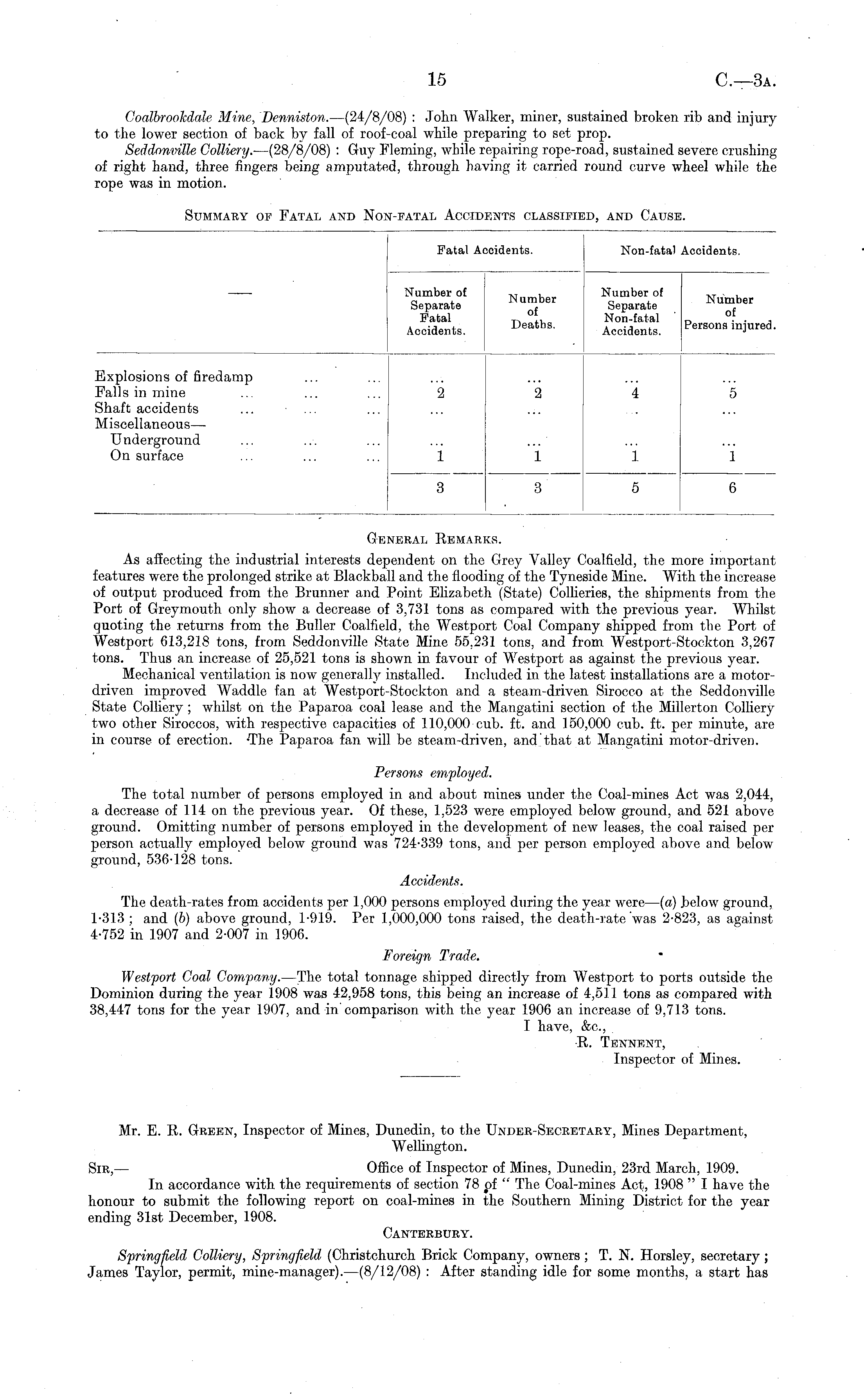 Mr. E. R. Green, Inspector of Mines, Dunedin, to the Under-Secretary, Mines Department, Wellington. Sir, — Office of Inspector of Mines, Dunedin, 23rd March, 1909. In accordance with the requirements of section 78 pf " The Coal-mines Act, 1908 " I have the honour to submit the following report on coal-mines in the Southern Mining District for the year ending 31st December, 1908. Canterbury. Springfield Colliery, Springfield (Christchurch Brick Company, owners ; T. N. Horsley, secretary ; James Taylor, permit, mine-manager).—(B/12/08) : After standing idle for some months, a start has